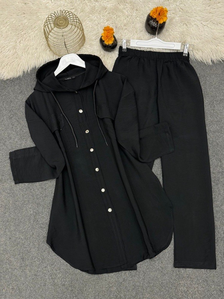 طقم بنطلون بغطاء رأس مزود بأزرار معدنية يجمع بين الأناقة والراحة بسلاسة. تضيف الأزرار المعدنية لمسة عصرية على التصميم، بينما يوفر تصميم الغطاء والرأس والبنطلون أقصى درجات الراحة. مثالي للظهور بمظهر عصري وأنيق في مختلف المناسبات، هذا الطقم يتناسب مع العديد من الأنماط والمواسم. إضافة متعددة الاستخدامات إلى خزانة ملابسك التي تضيف لمسة من الأناقة إلى إطلالتك اليومية.