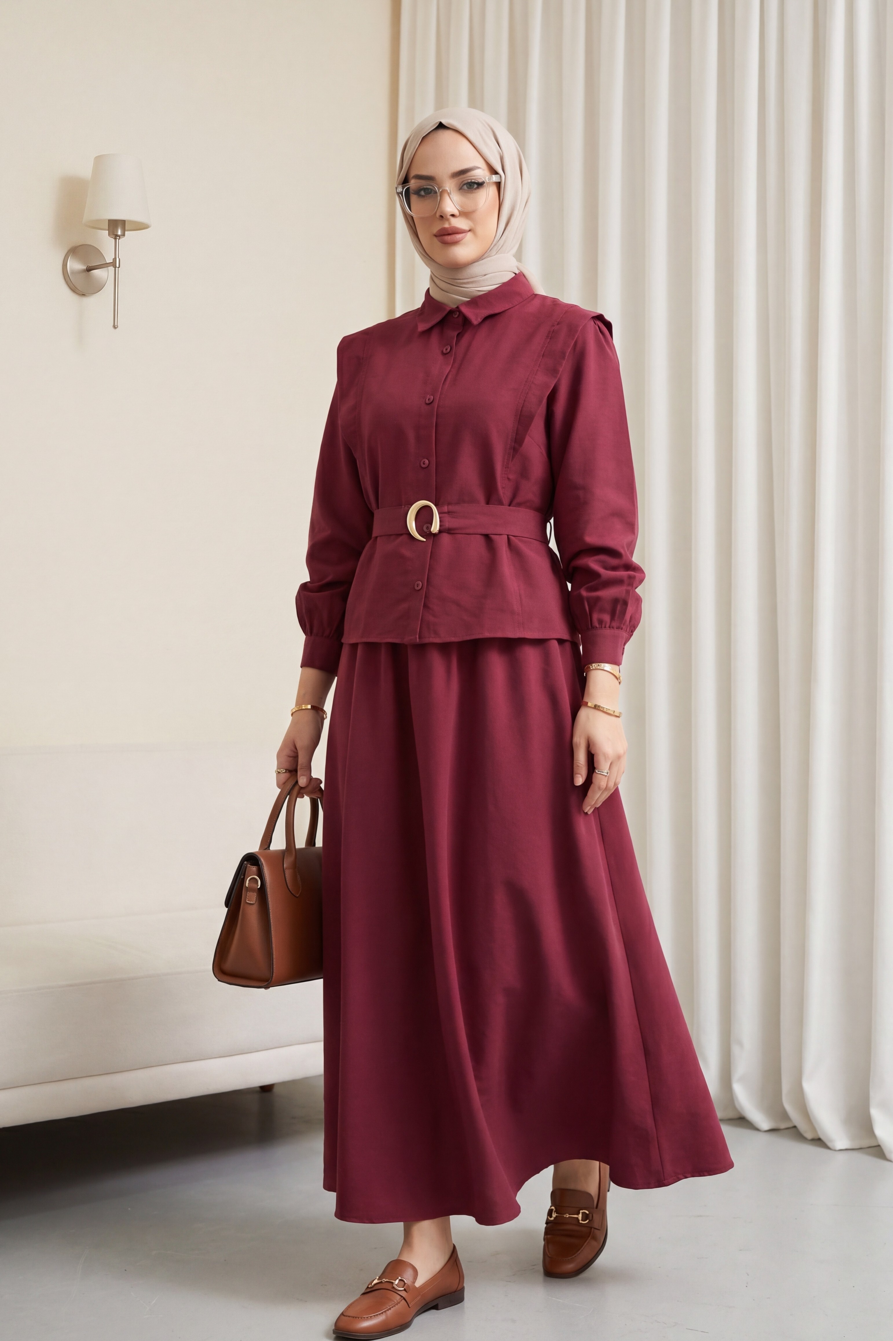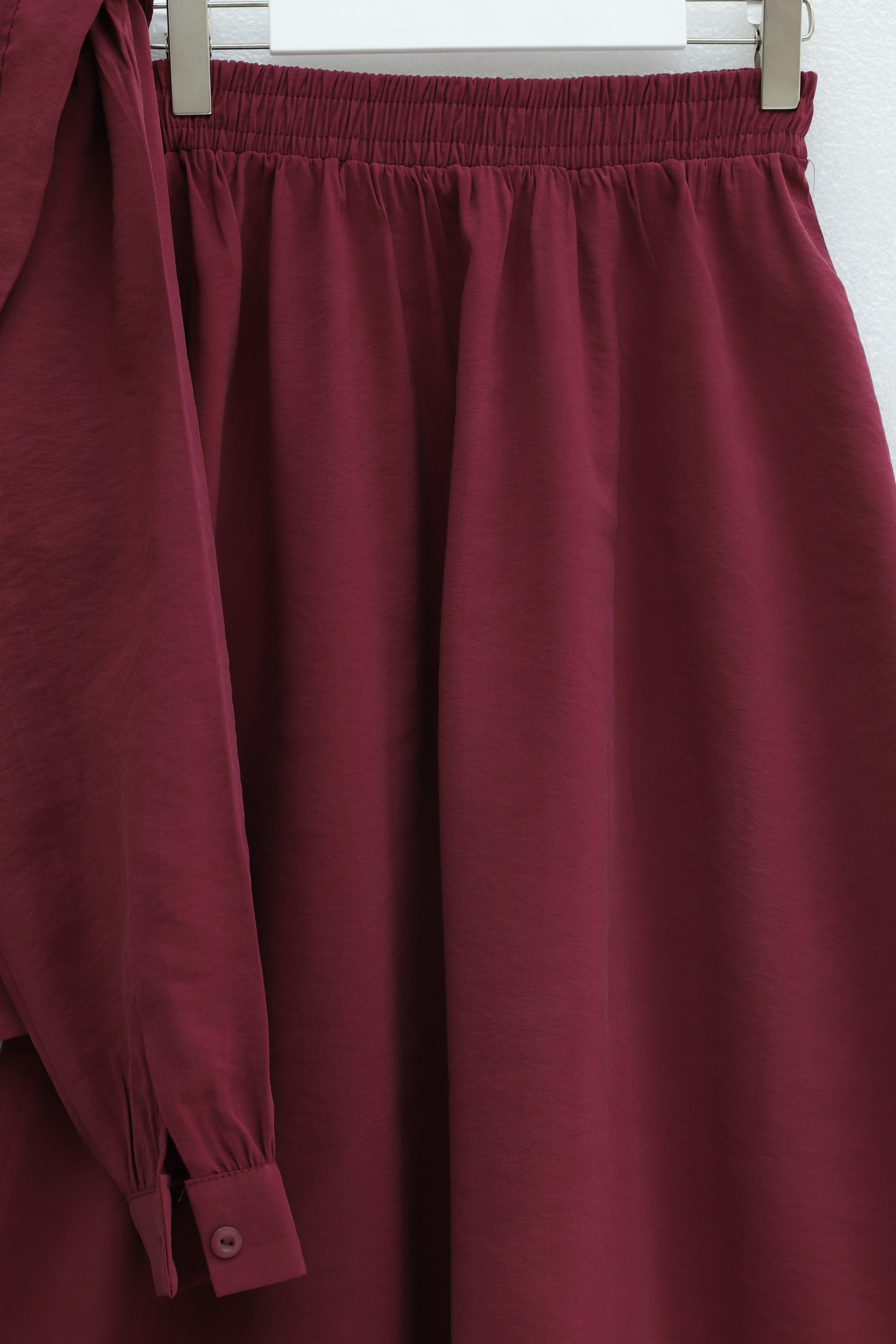 بدلة مودال بتفاصيل كتف مبطنة وتنورة بحزام خصر مطاطي -لون الخوخ