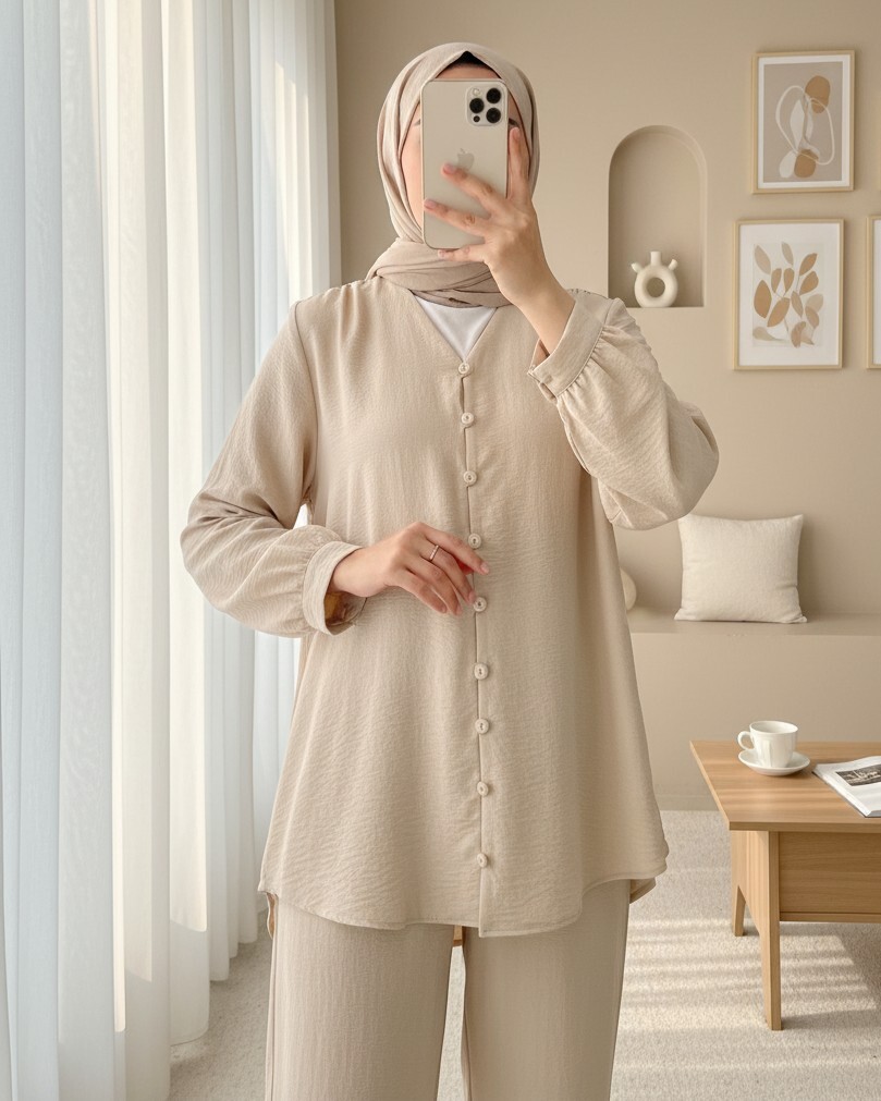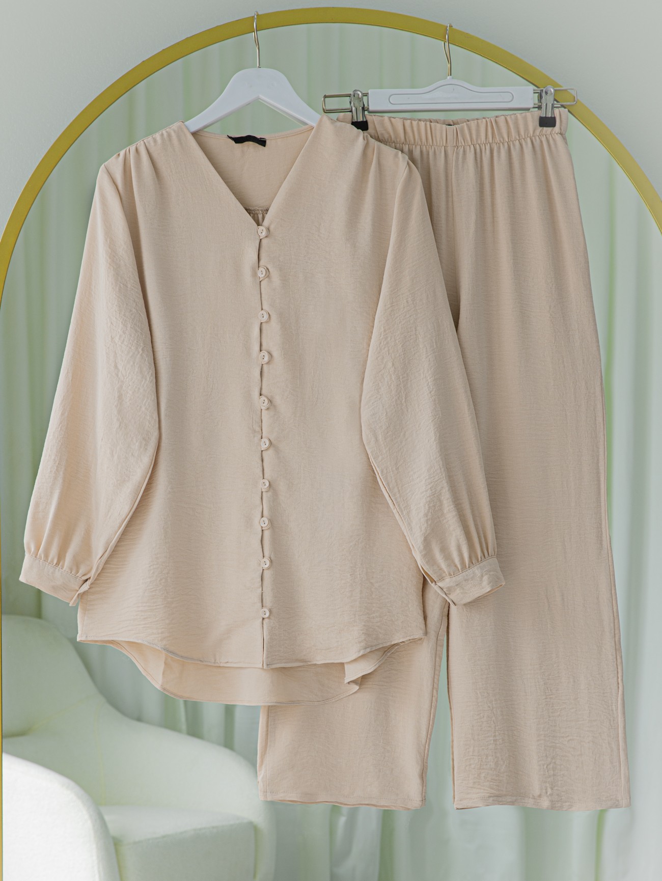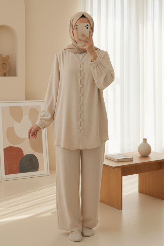 بدلة أيروبين مع بنطلون بأزرار وفتحة رقبة على شكل حرف V -اللون البيج
