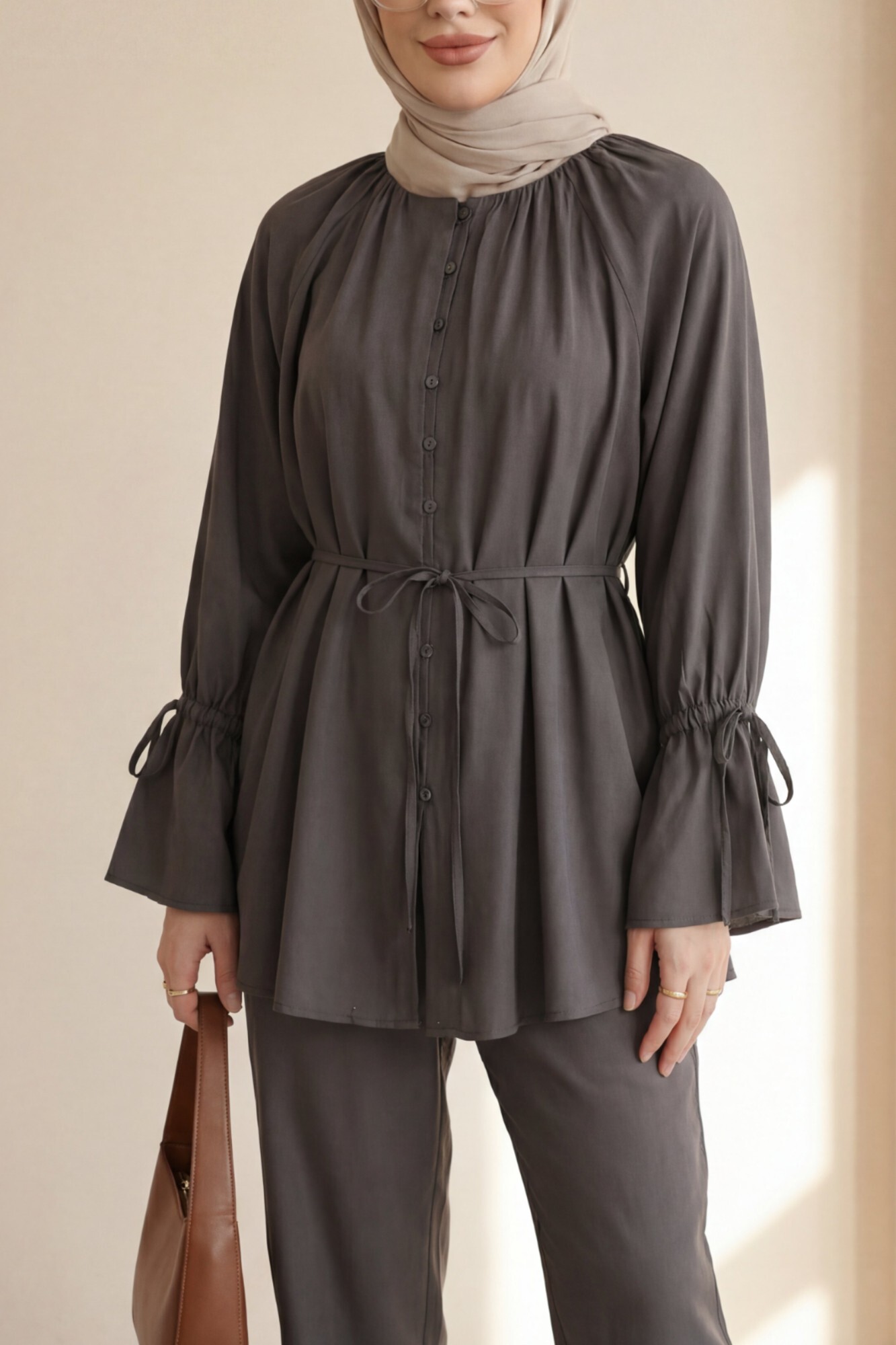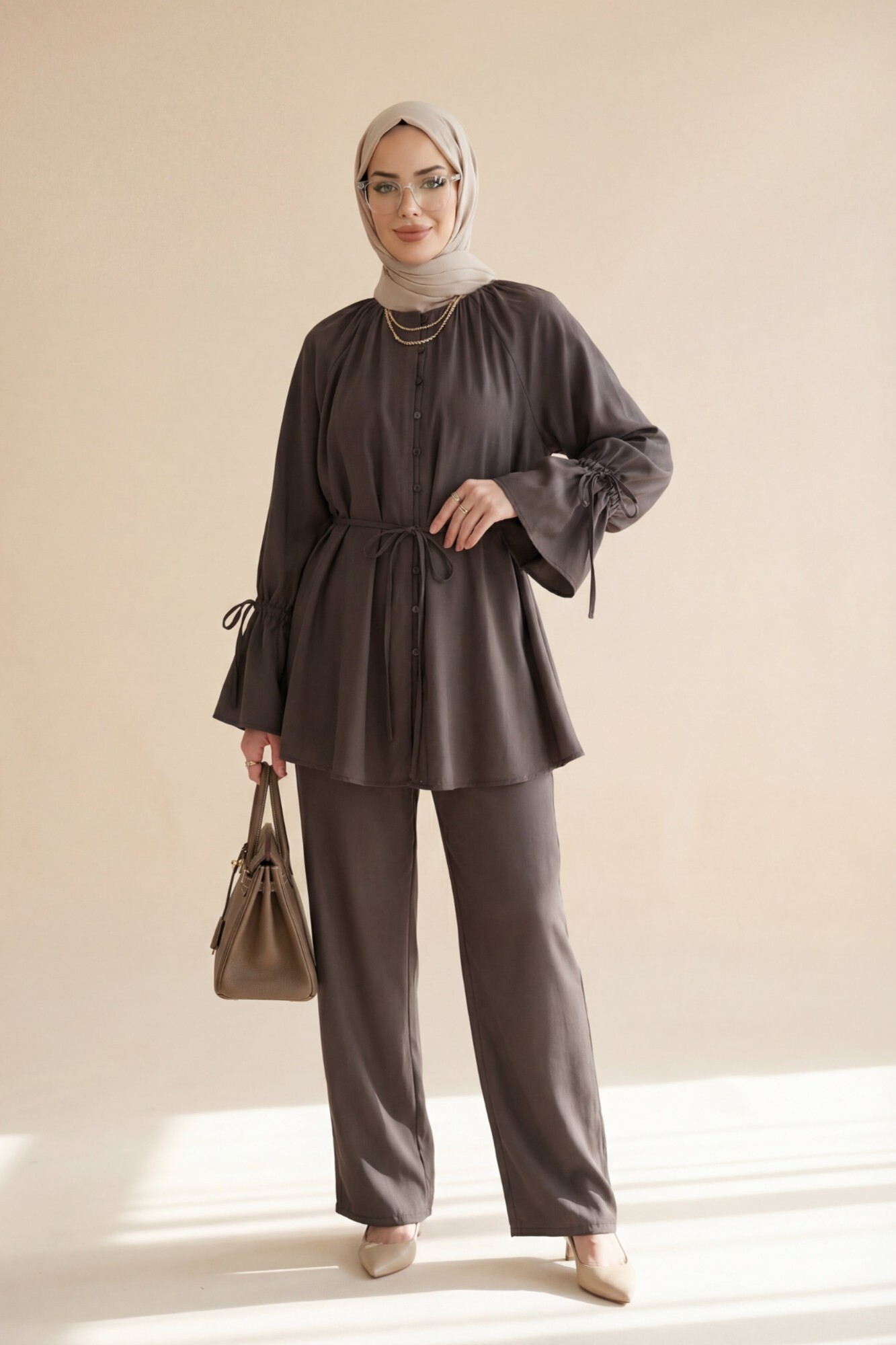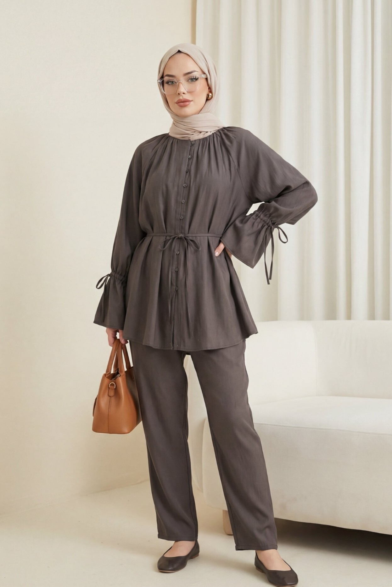 طقم من قطعتين بتفاصيل ياقة مكشكشة ورباط عند الخصر والأكمام. -بنى