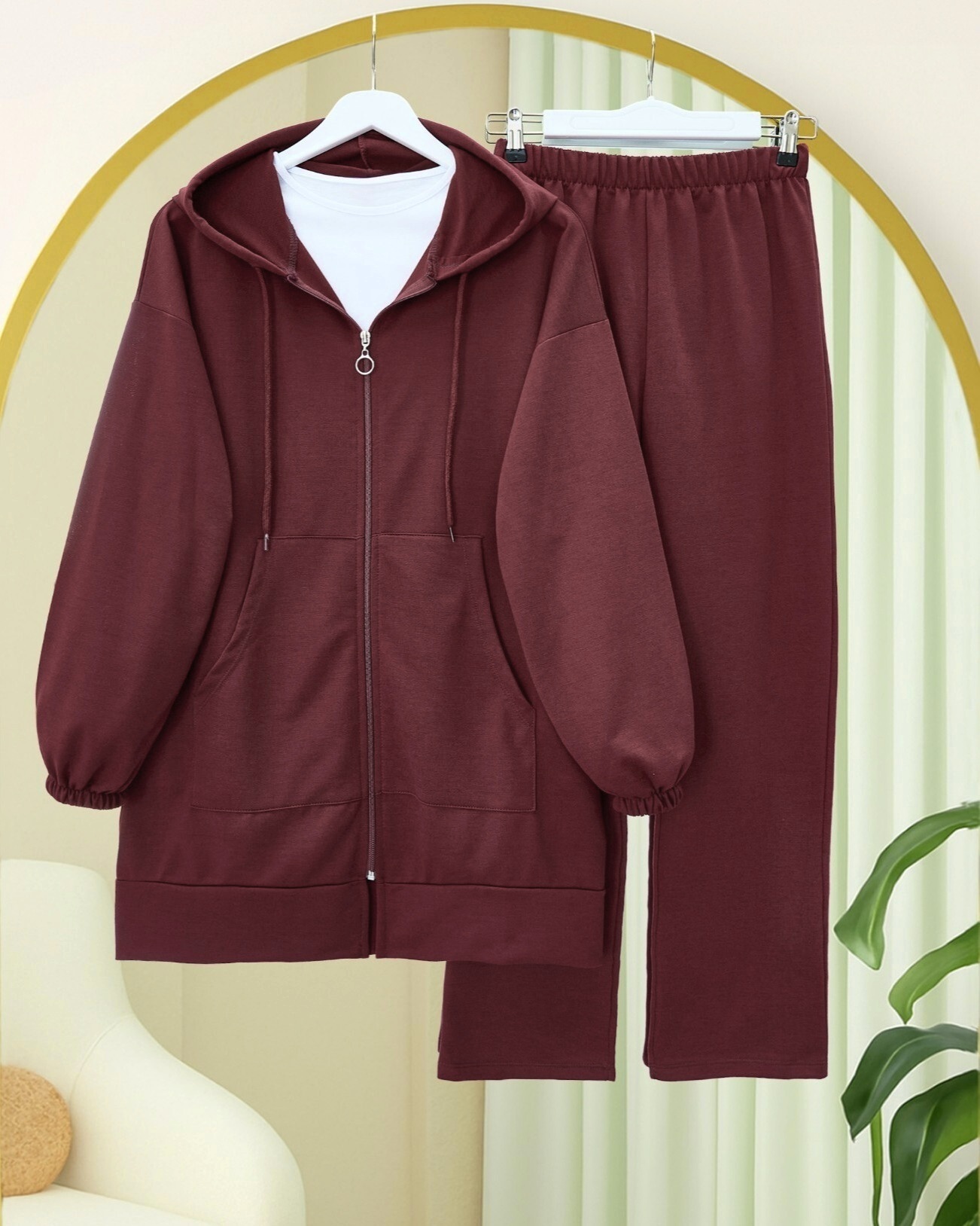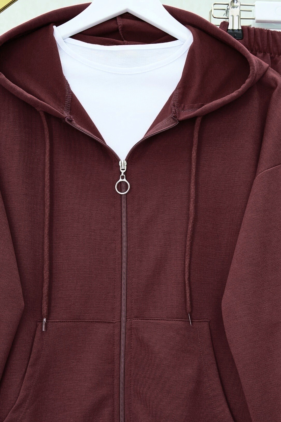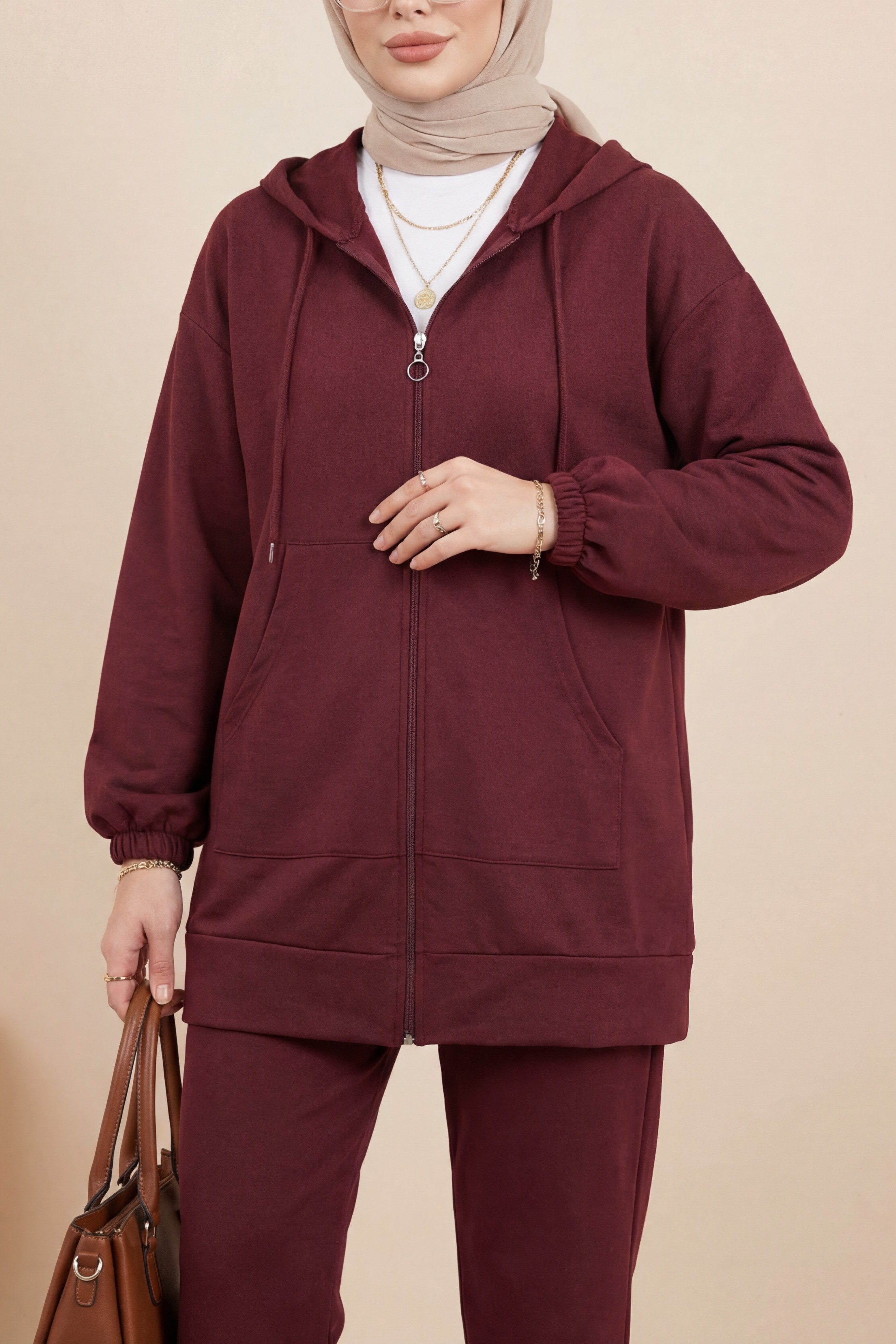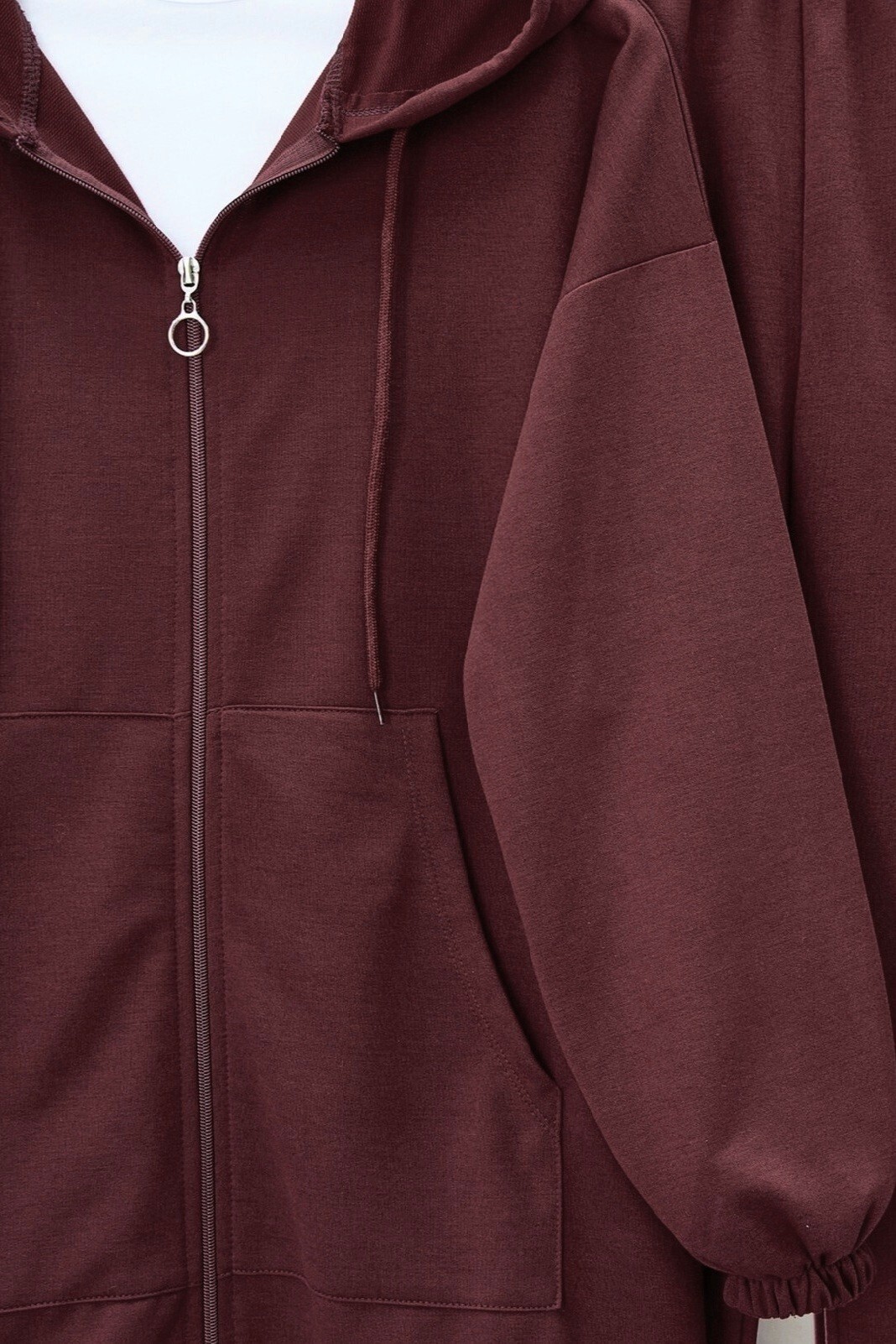 طقم قطن ممشط بغطاء للرأس بسحاب -بوردو