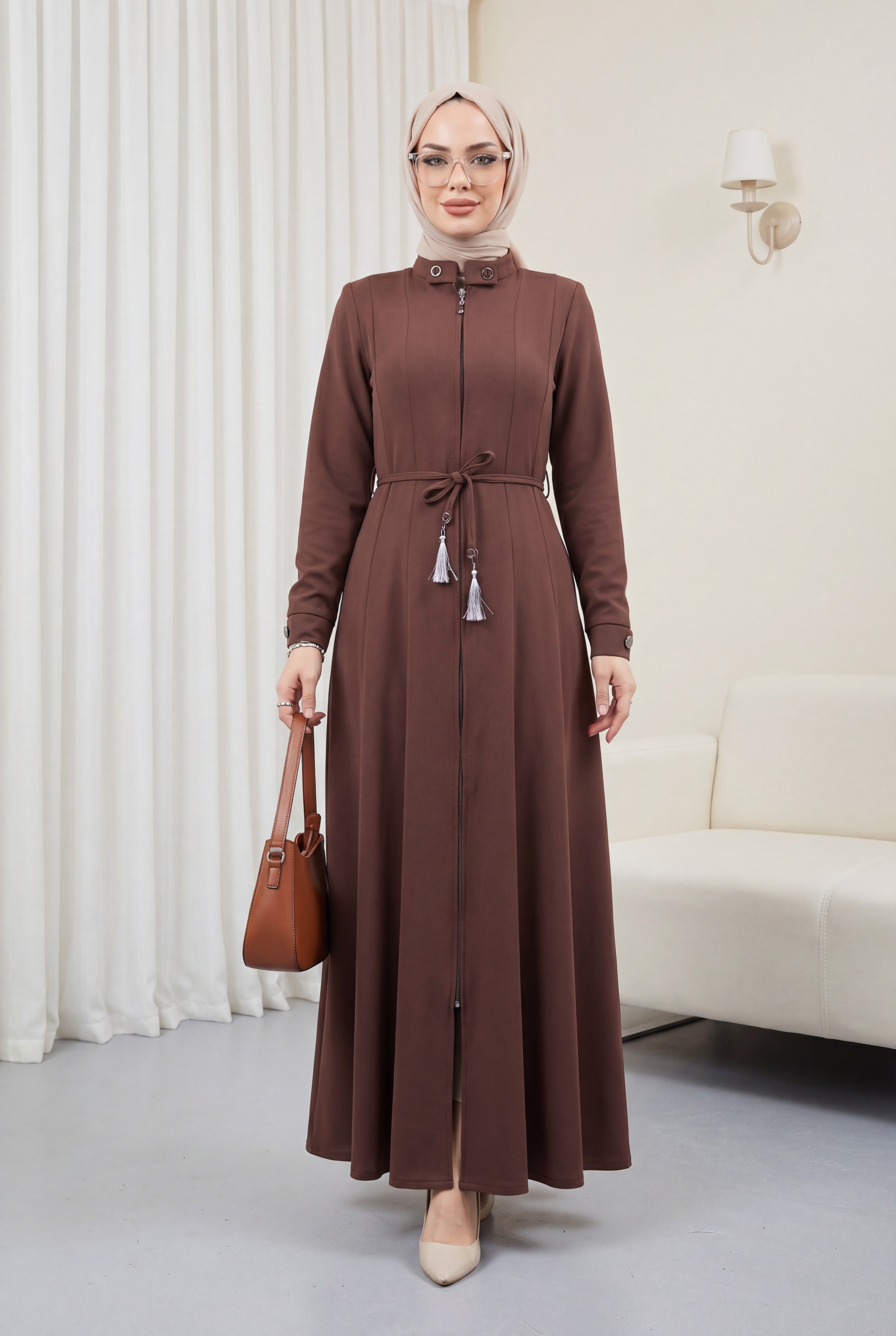 مميزات المنتج: هذا عباية مولانا جديدة للموسم، بتصميم ضيق وكسرات أنيقة. تتميز بتفاصيل أزرار عند الياقة والأكمام، وتُغلق بسحاب. تحتوي على جيبين عمليين، وأكتاف مبطنة، ورباط قابل للإزالة بنقشة محبوكة وشرابات عند الخصر. قد تختلف الألوان قليلاً بسبب ظروف التصوير.