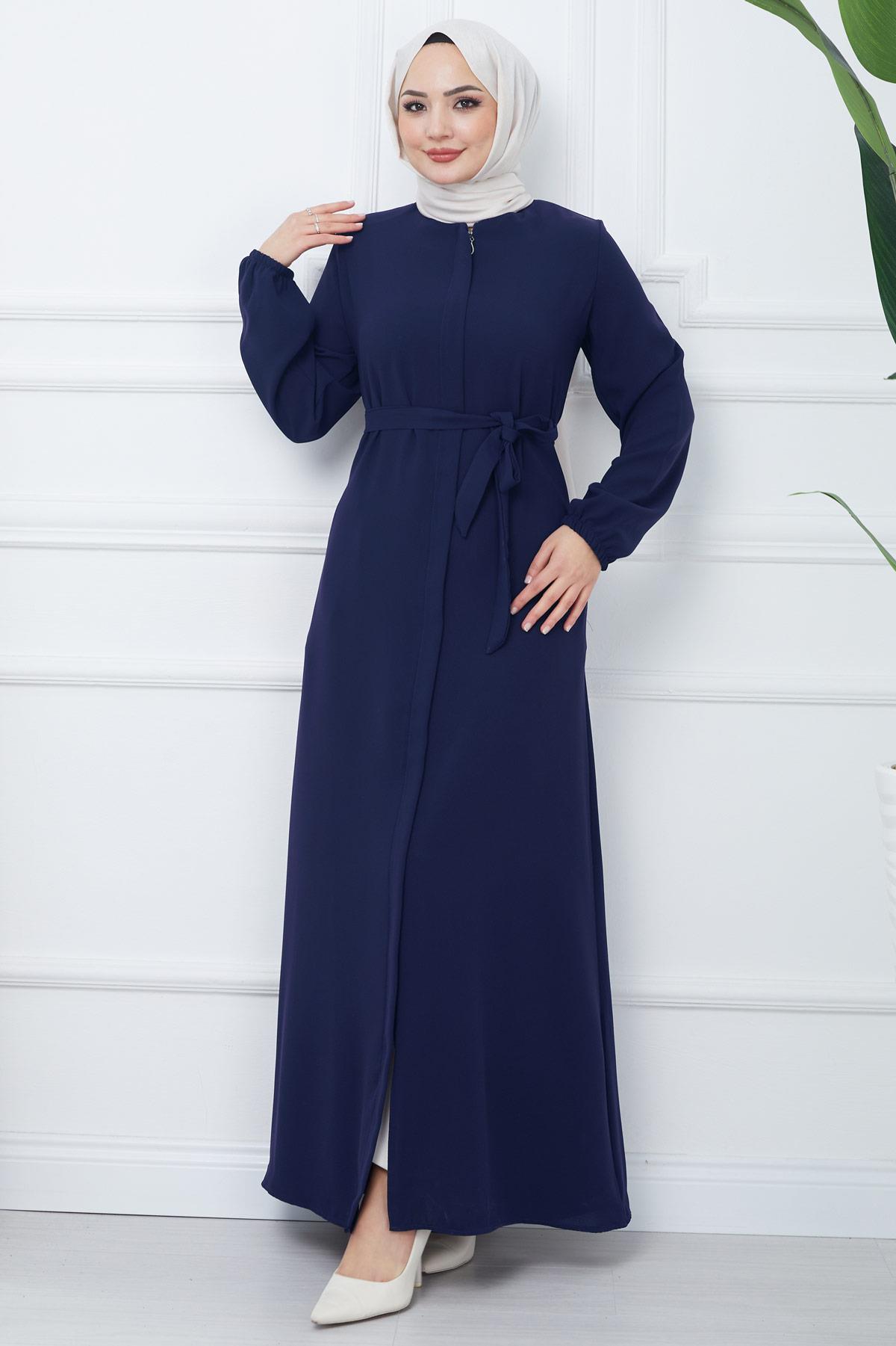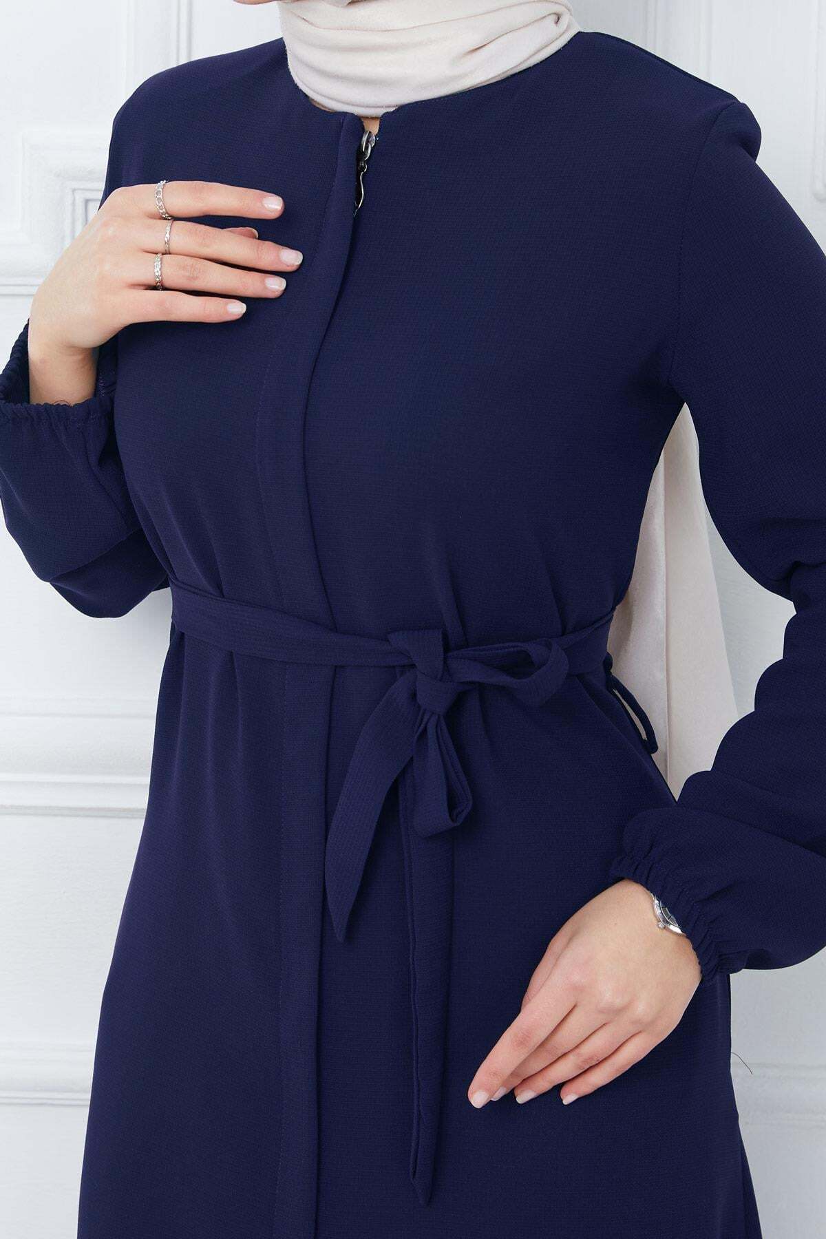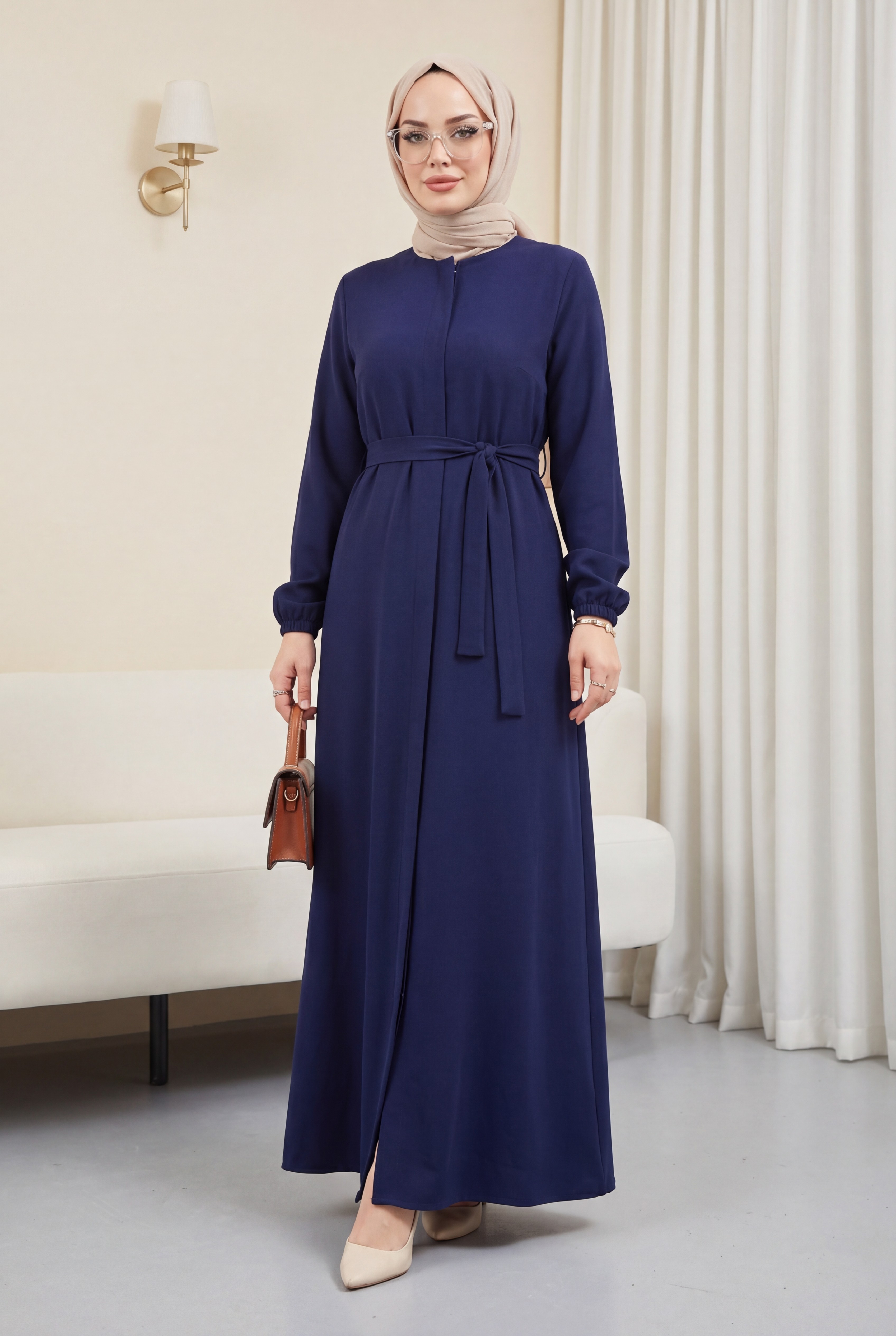 مميزات المنتج: عباية طويلة بسحاب أمامي مخفي. تحتوي على جيبين جانبيين، وحزام خصر، وأكتاف مبطنة، وأساور مطاطية. بدون بطانة. قد يختلف اللون قليلاً بسبب ظروف التصوير.