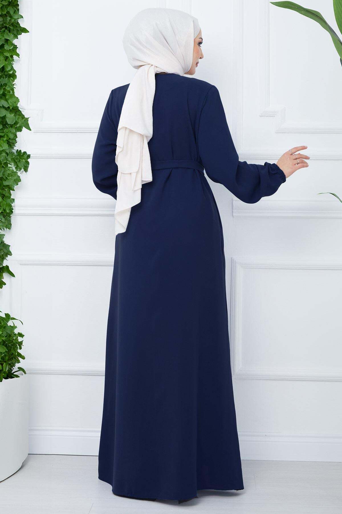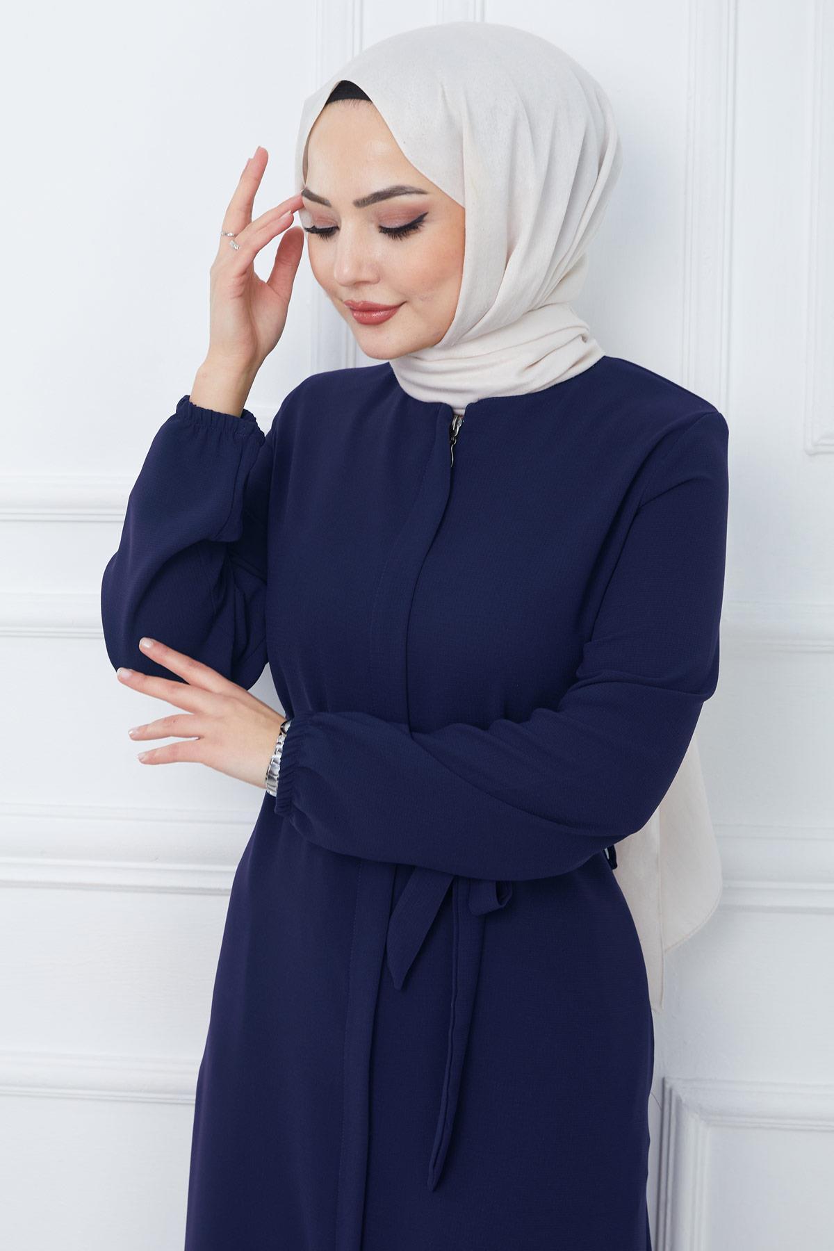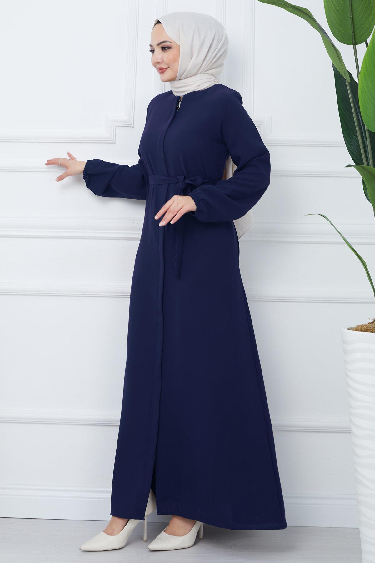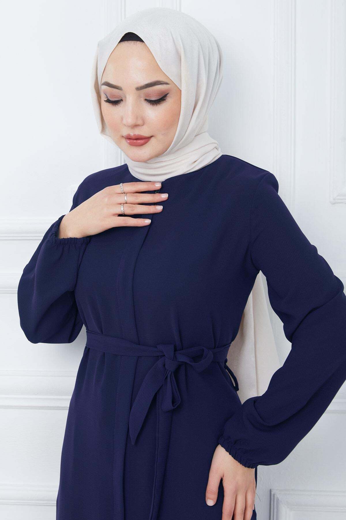 مميزات المنتج: عباية طويلة بسحاب أمامي مخفي. تحتوي على جيبين جانبيين، وحزام خصر، وأكتاف مبطنة، وأساور مطاطية. بدون بطانة. قد يختلف اللون قليلاً بسبب ظروف التصوير.