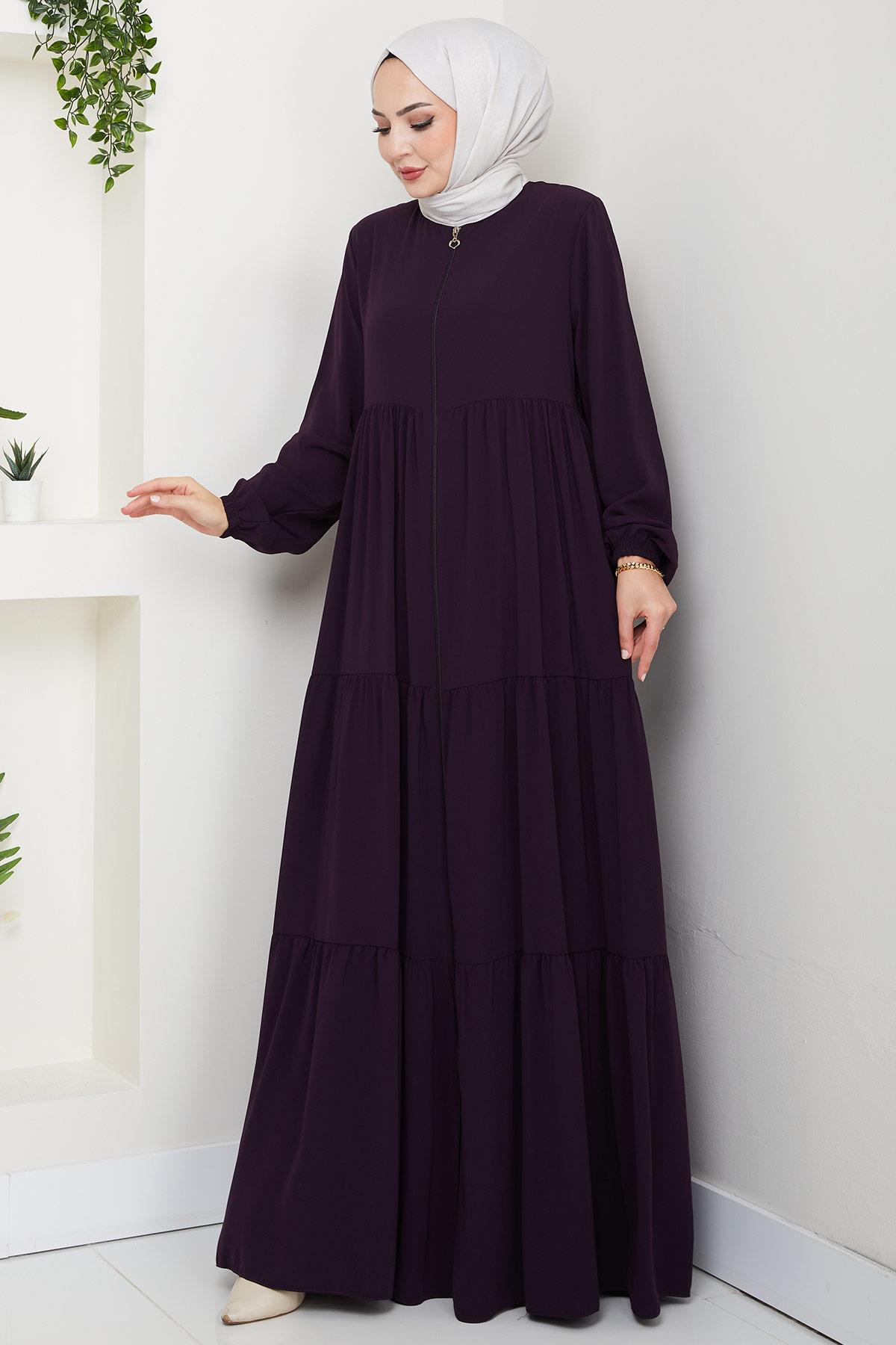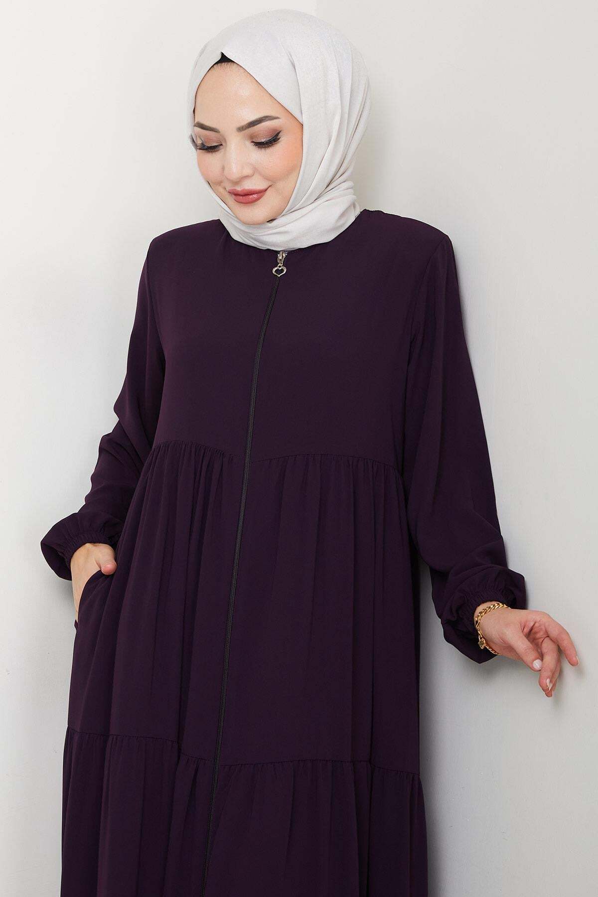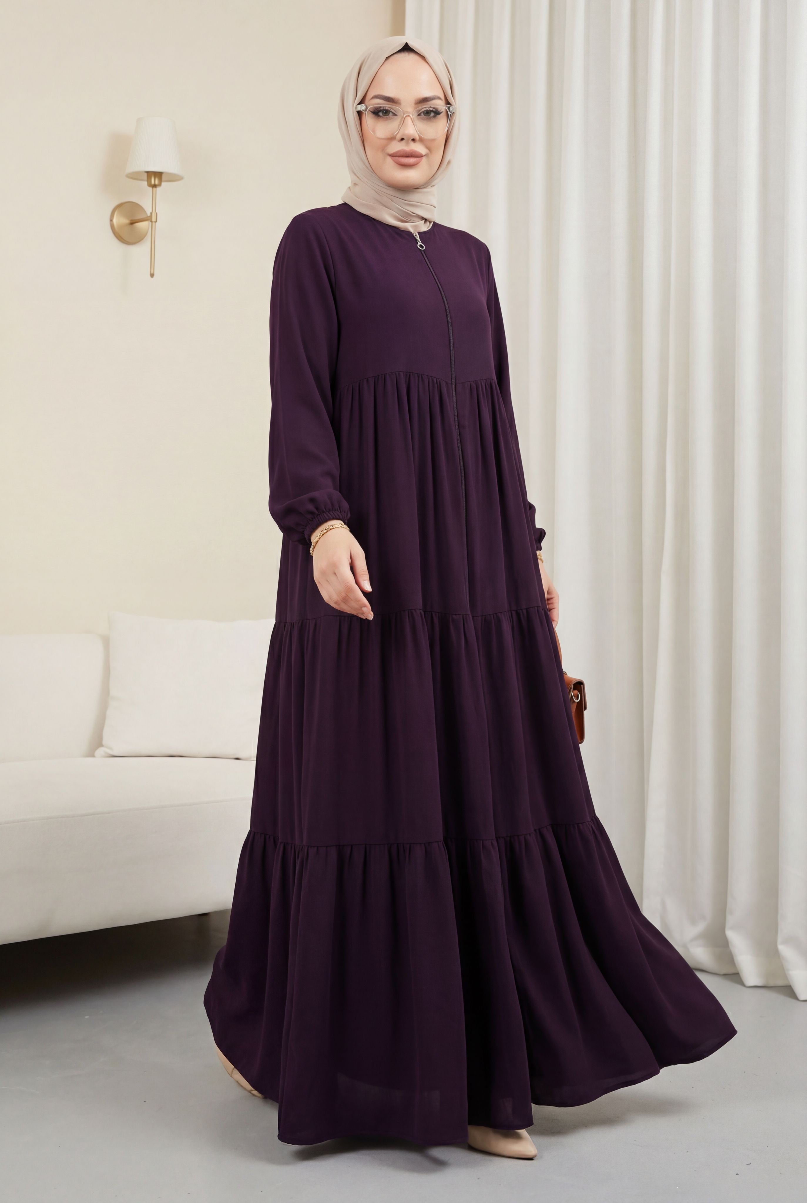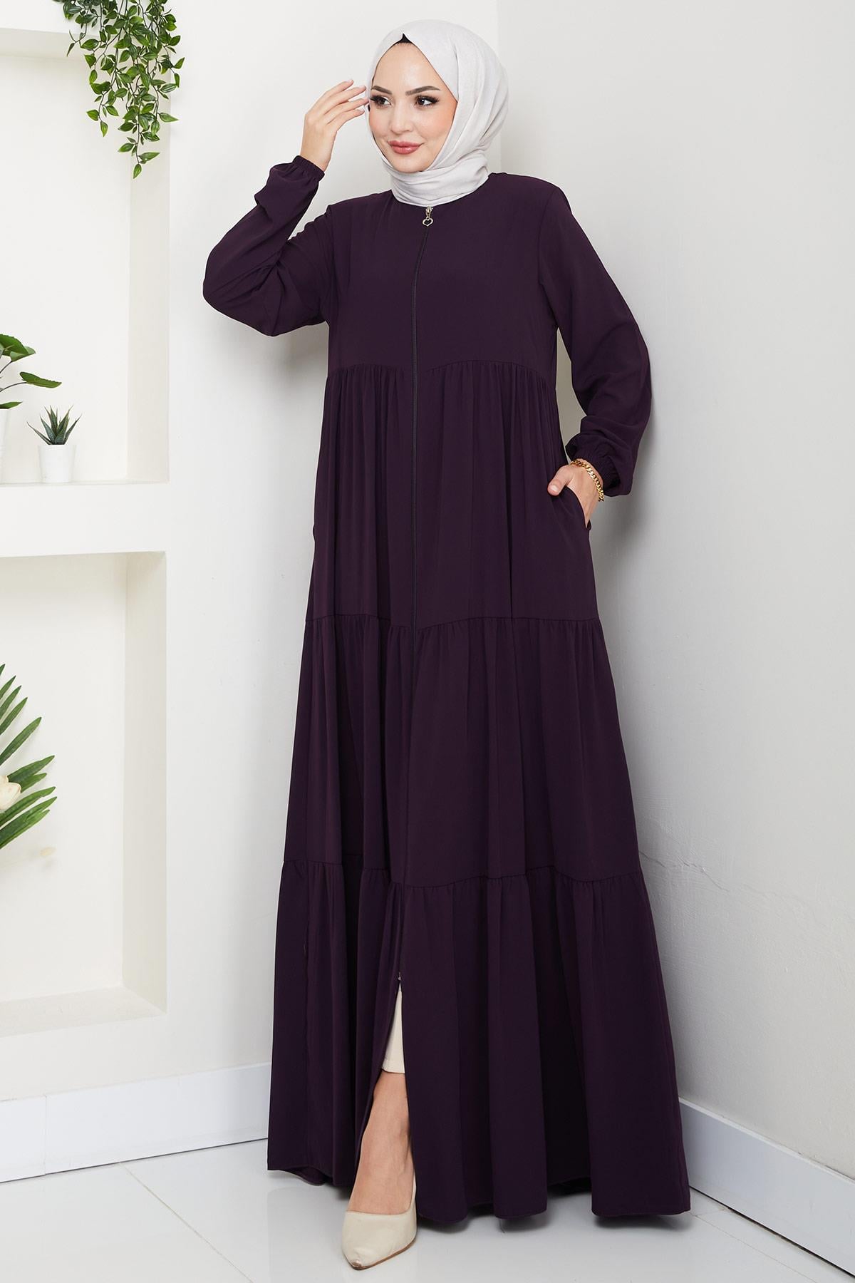 مميزات المنتج: عباية من حرير المدينة، متعددة الطبقات ومُجمّعة. تُغلق بسحاب أمامي. تتميز بأكتاف مبطنة وبدون بطانة. لها أساور مطاطية وجيوب جانبية. قد يكون هناك اختلاف طفيف في اللون بسبب ظروف التصوير.