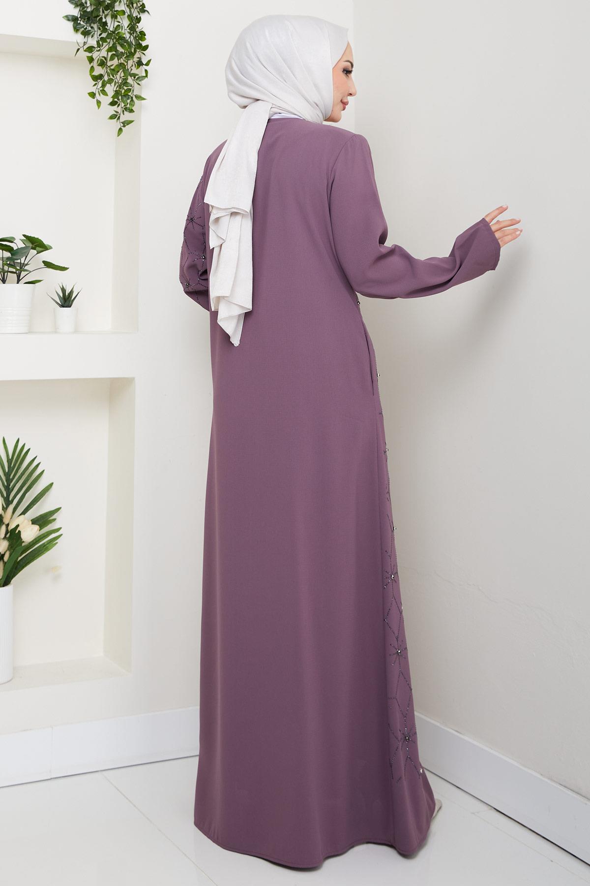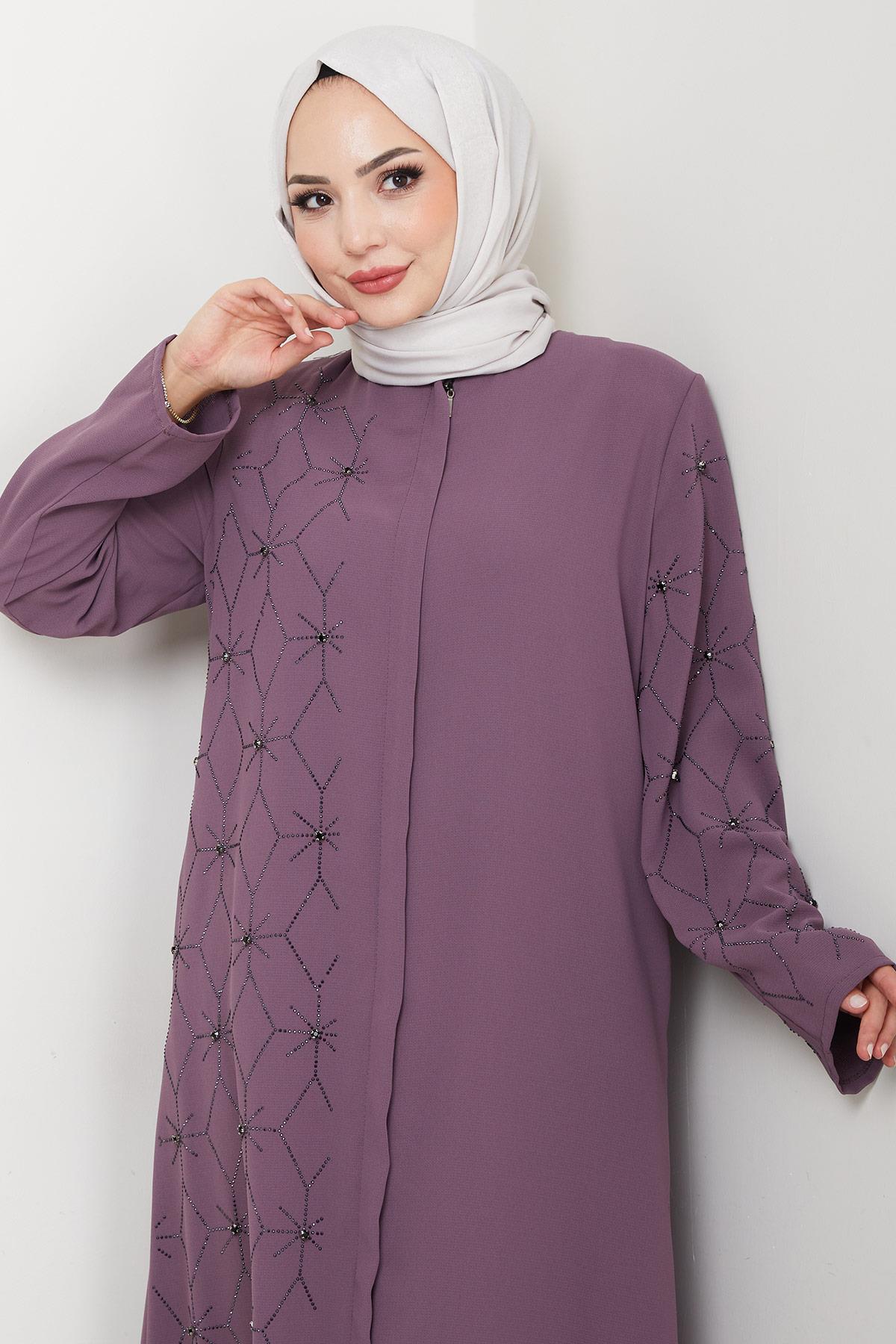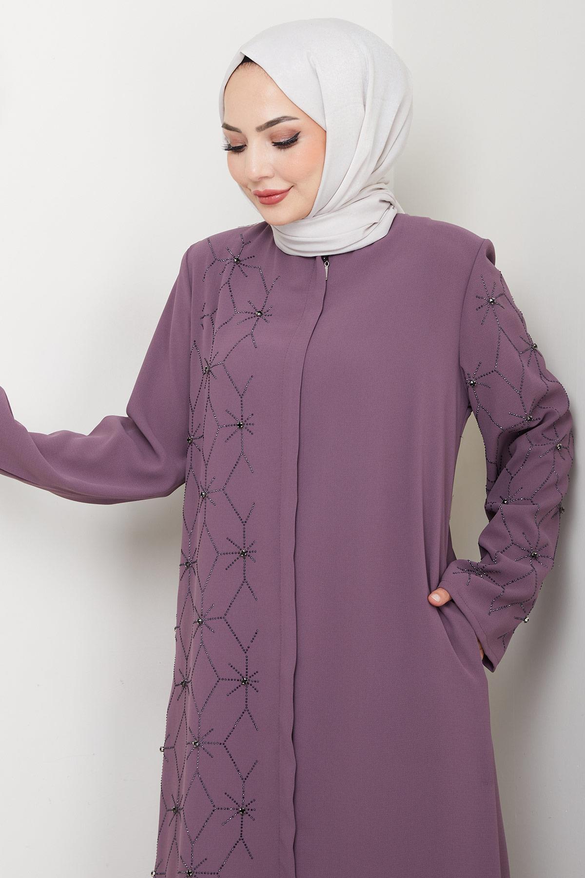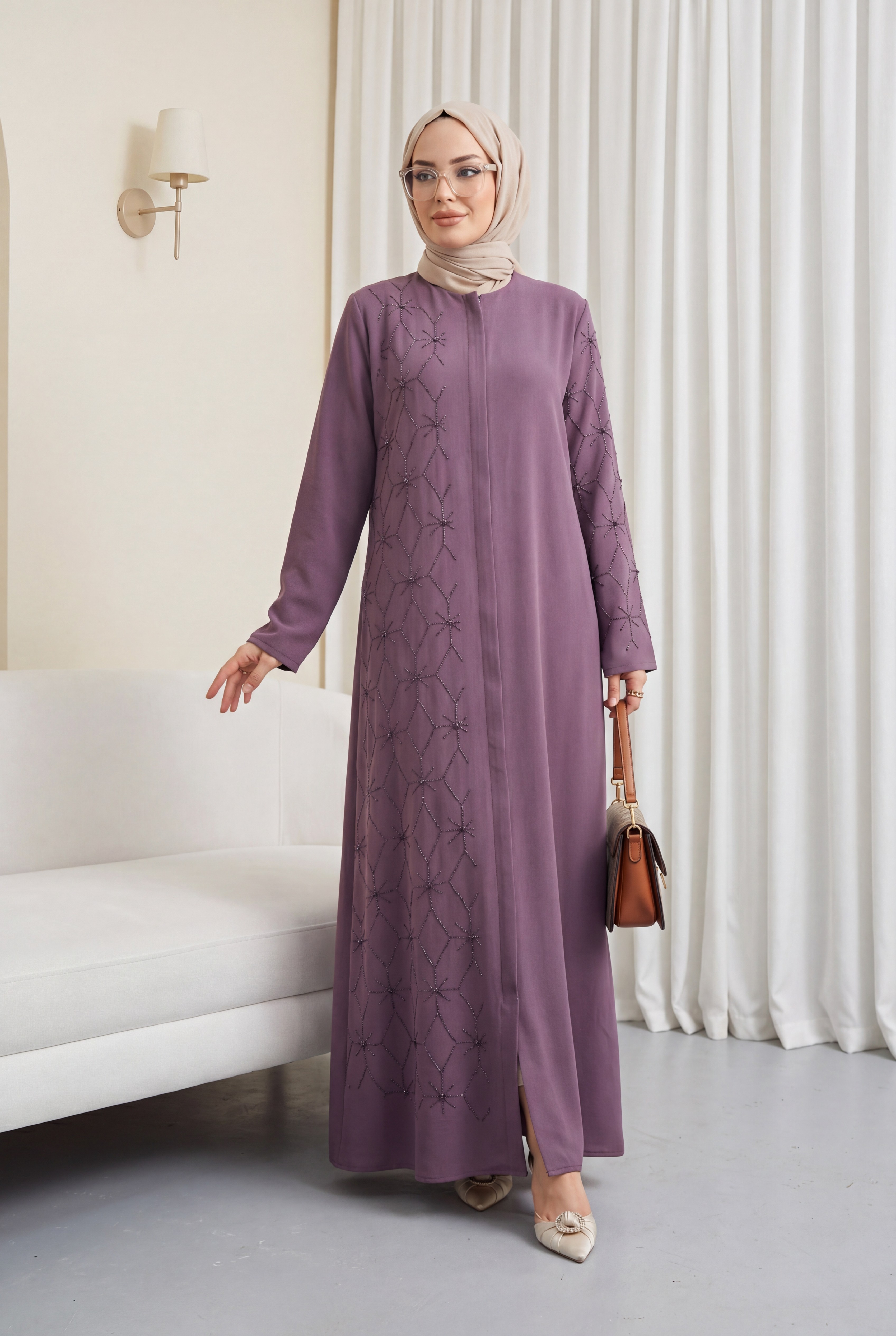 مواصفات عباية وردية اللون مزينة بنصف حجر مخفي HM2860
