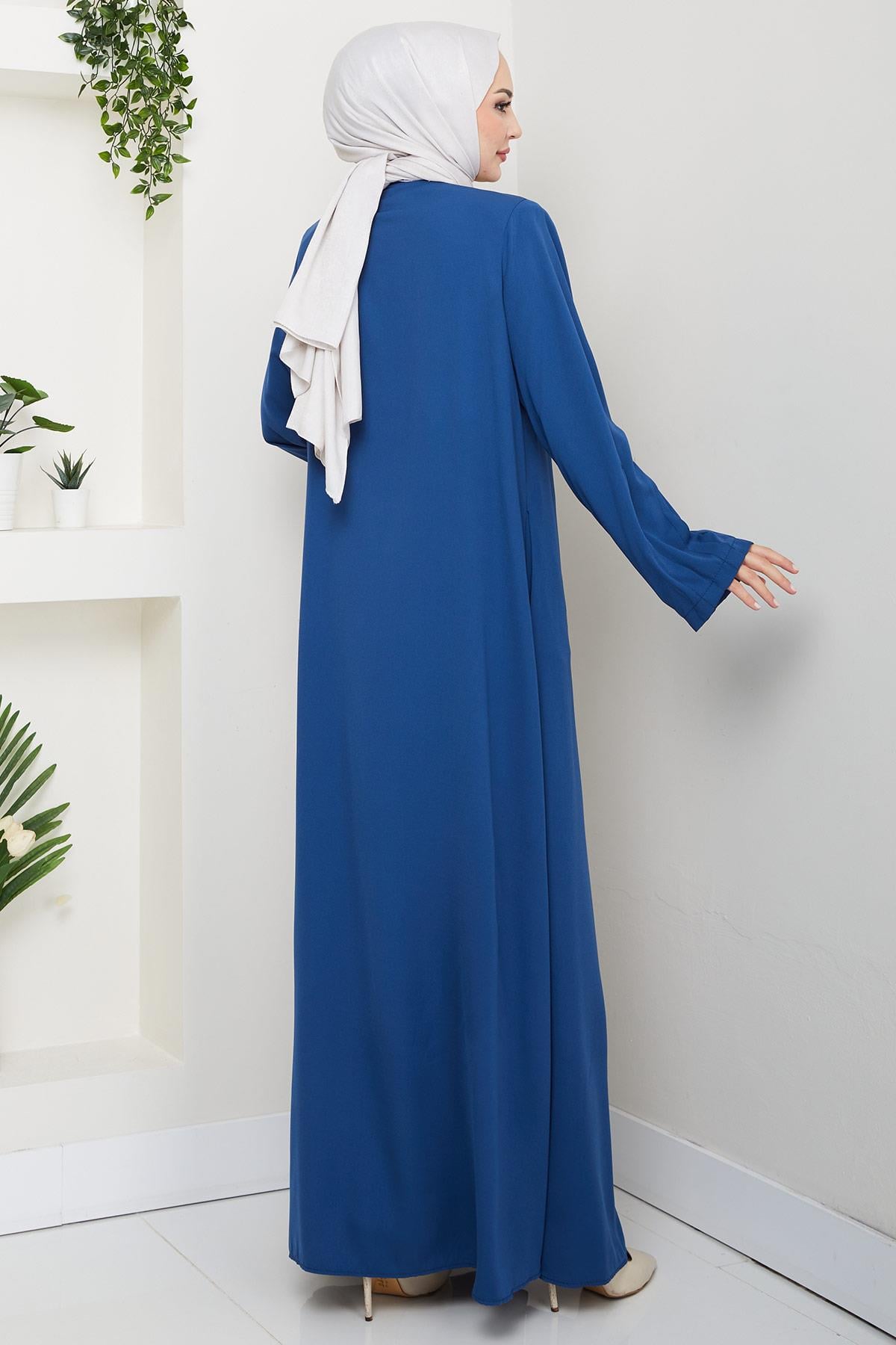 مميزات المنتج: عباية طويلة بياقة دائرية وأزرار أمامية، مزينة بتفاصيل ثنيات على الأكمام. تتميز بكتفين مبطنتين وجيوب جانبية، وهي غير مبطنة. قد يختلف اللون قليلاً بسبب ظروف التصوير.