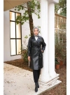 معطف واقٍ من المطر من الجلد، ذو صفين من الأزرار، وجيوب، ورباط عند الخصر.