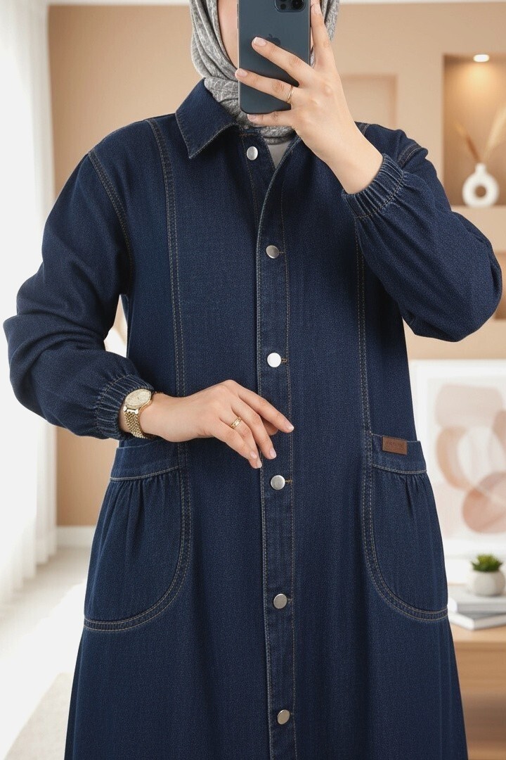 قبعة دنيم طويلة بأزرار معدنية مع جيب للحقيبة -كحلي