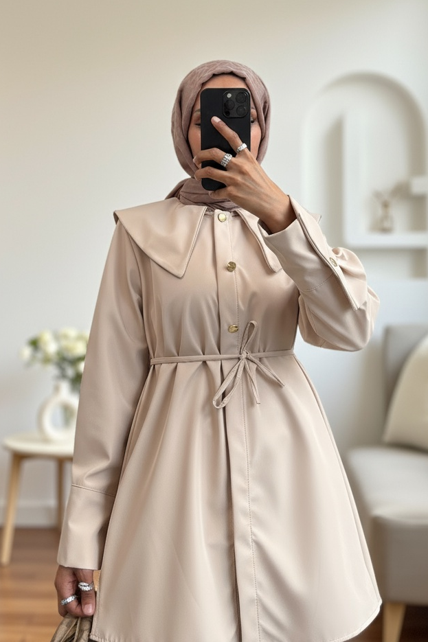 عباءة ربط واسعة ذات ياقة مربوطة حول الخصر -اللون البيج