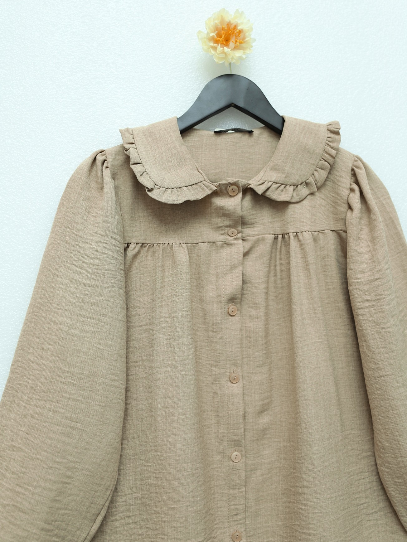 يعد نموذجنا من الكتان المصنوع من الكتان مع الزر الأمامي ، وياقة الأطفال وأساور الأكمام المطاطية من أشهر الموديلات في الموسم الجديد.