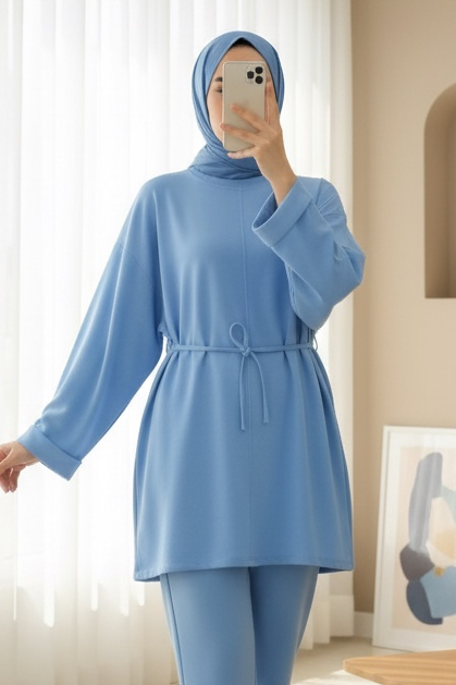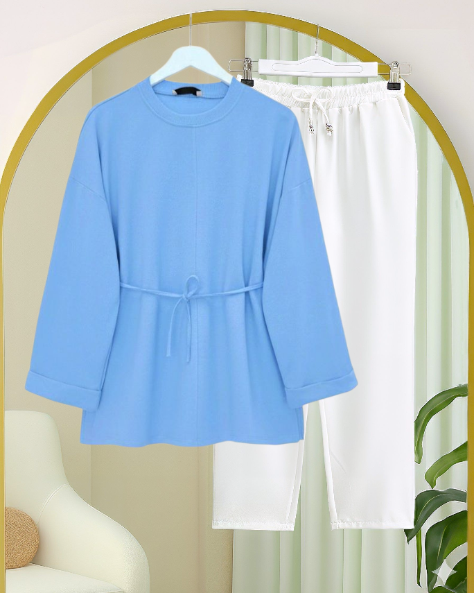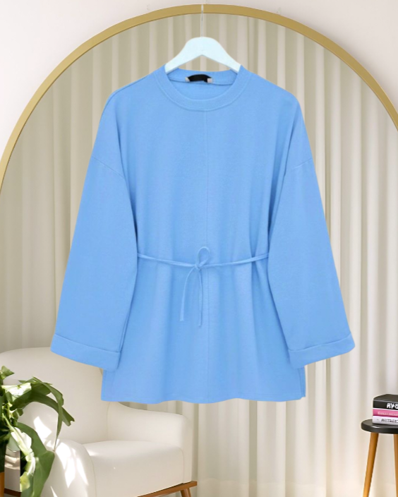 تونيك قطني ممشط مضغوط بأكمام مطوية وخصر مربوط وشق -أزرق