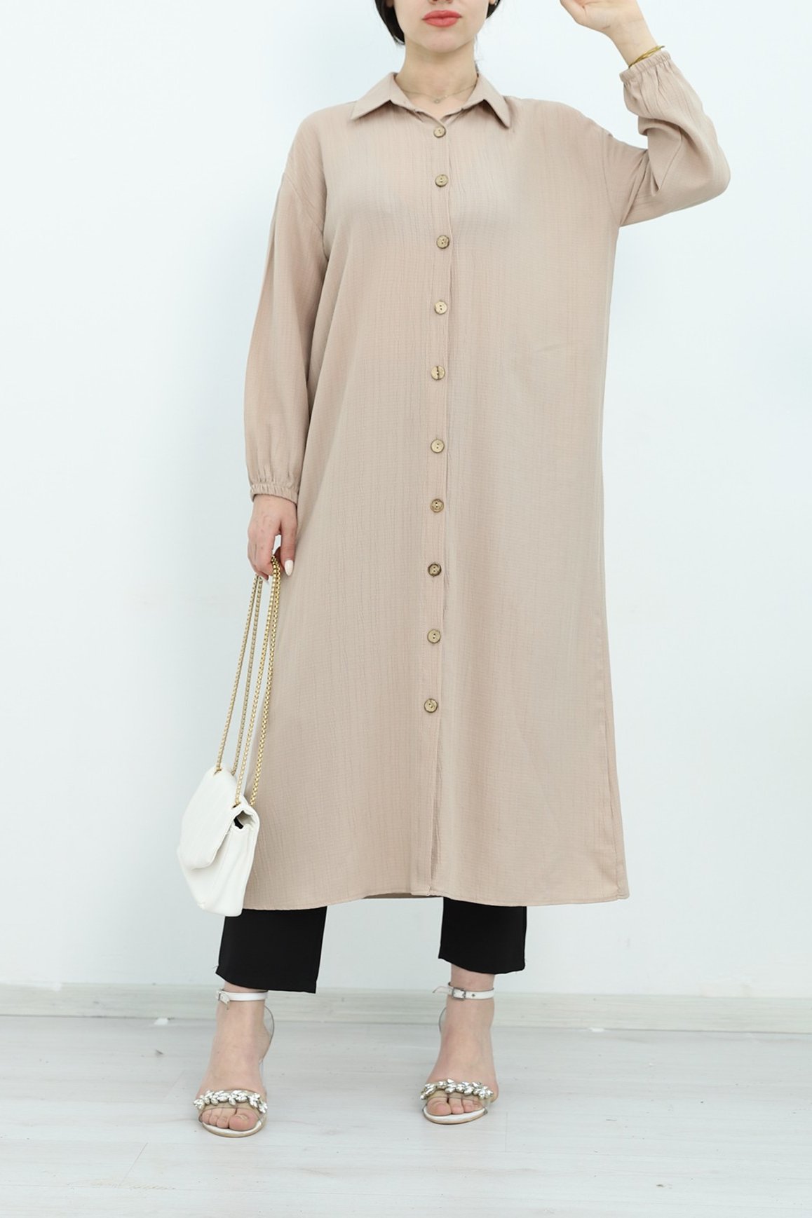 تونيك طويل مع أكمام مرنة وأزرار كاملة يتميز بتصميم عصري يجمع بين الأناقة والراحة. يوفر التفصيل المرن في الأكمام مظهرًا مريحًا، بينما يضيف النمط الكامل للأزرار لمسة من الأناقة. يوفر قماش الكرينكل الطويل الخفيف والمتين راحة في الارتداء. مثالي للاستخدام اليومي أو لإطلالات أنيقة، حيث يعزز هذا التونيك أناقتك.