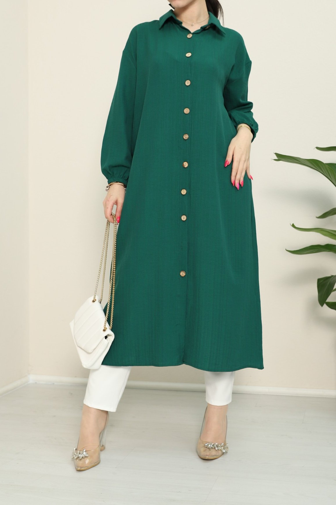 تونيك طويل مع أكمام مرنة وأزرار كاملة يتميز بتصميم عصري يجمع بين الأناقة والراحة. يوفر التفصيل المرن في الأكمام مظهرًا مريحًا، بينما يضيف النمط الكامل للأزرار لمسة من الأناقة. يوفر قماش الكرينكل الطويل الخفيف والمتين راحة في الارتداء. مثالي للاستخدام اليومي أو لإطلالات أنيقة، حيث يعزز هذا التونيك أناقتك.