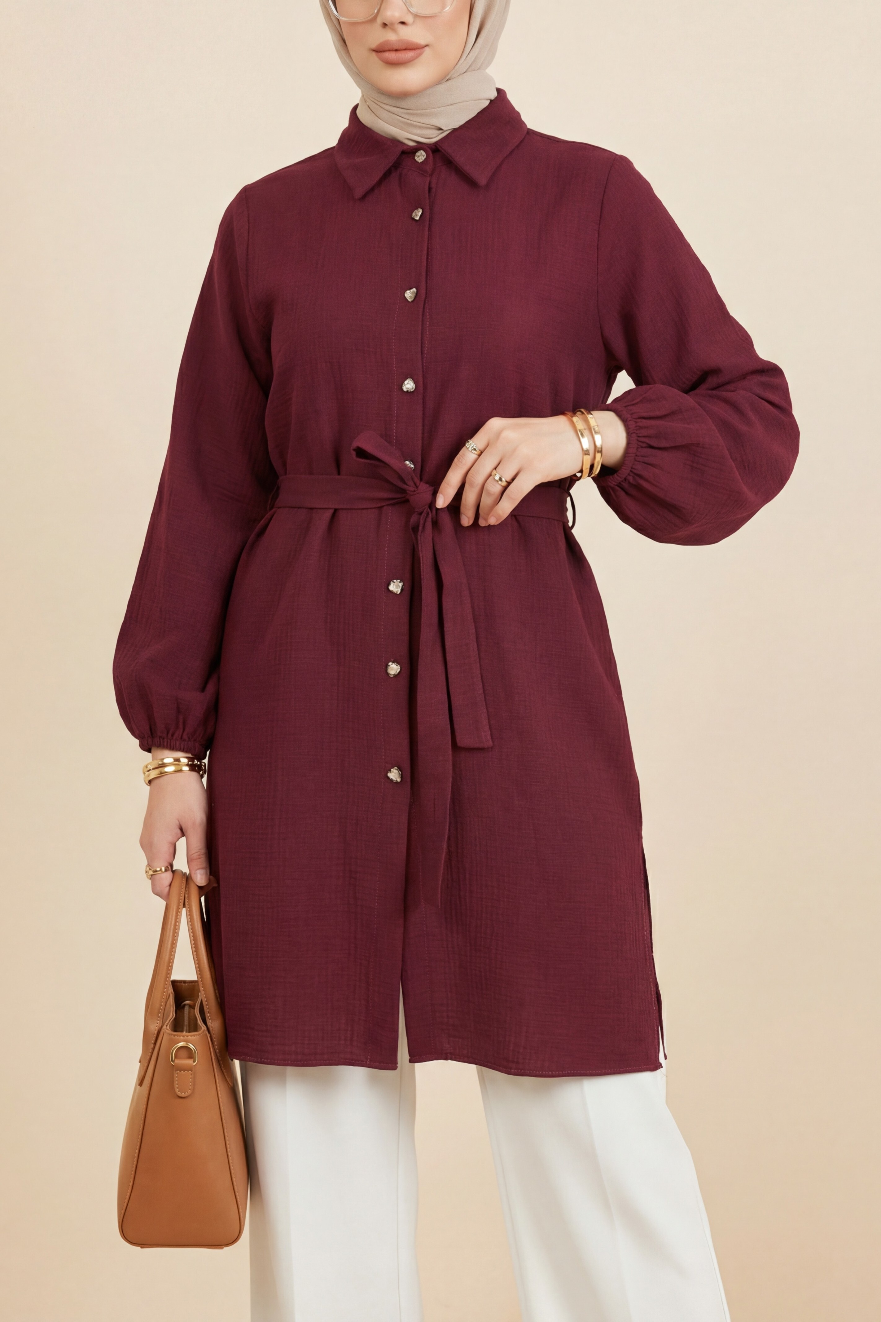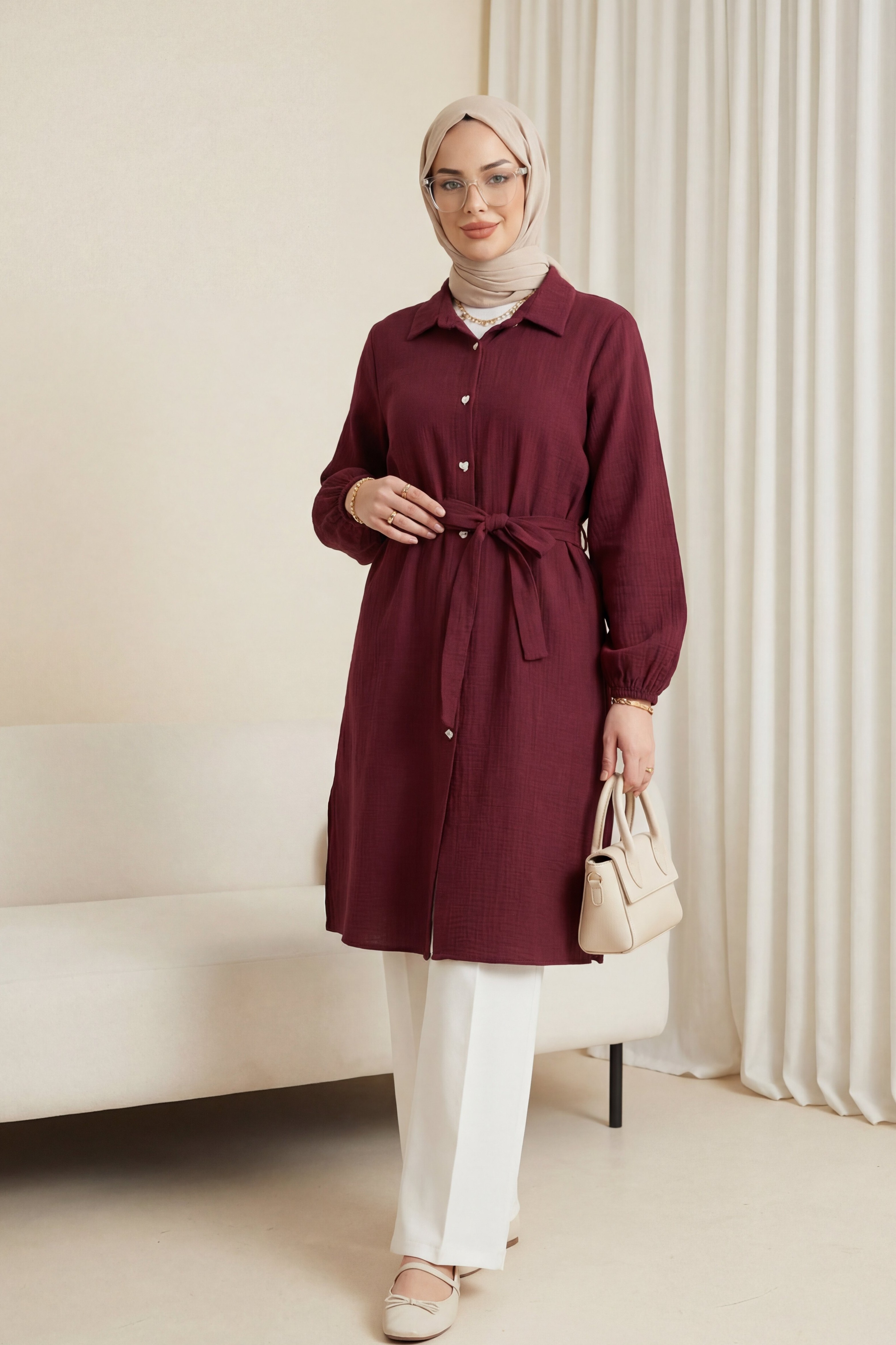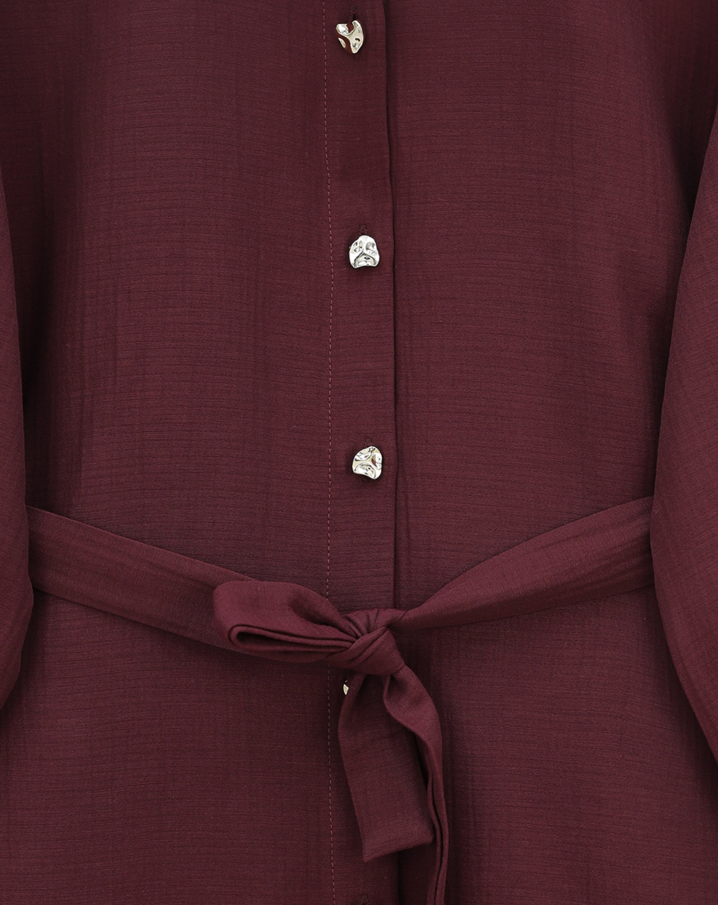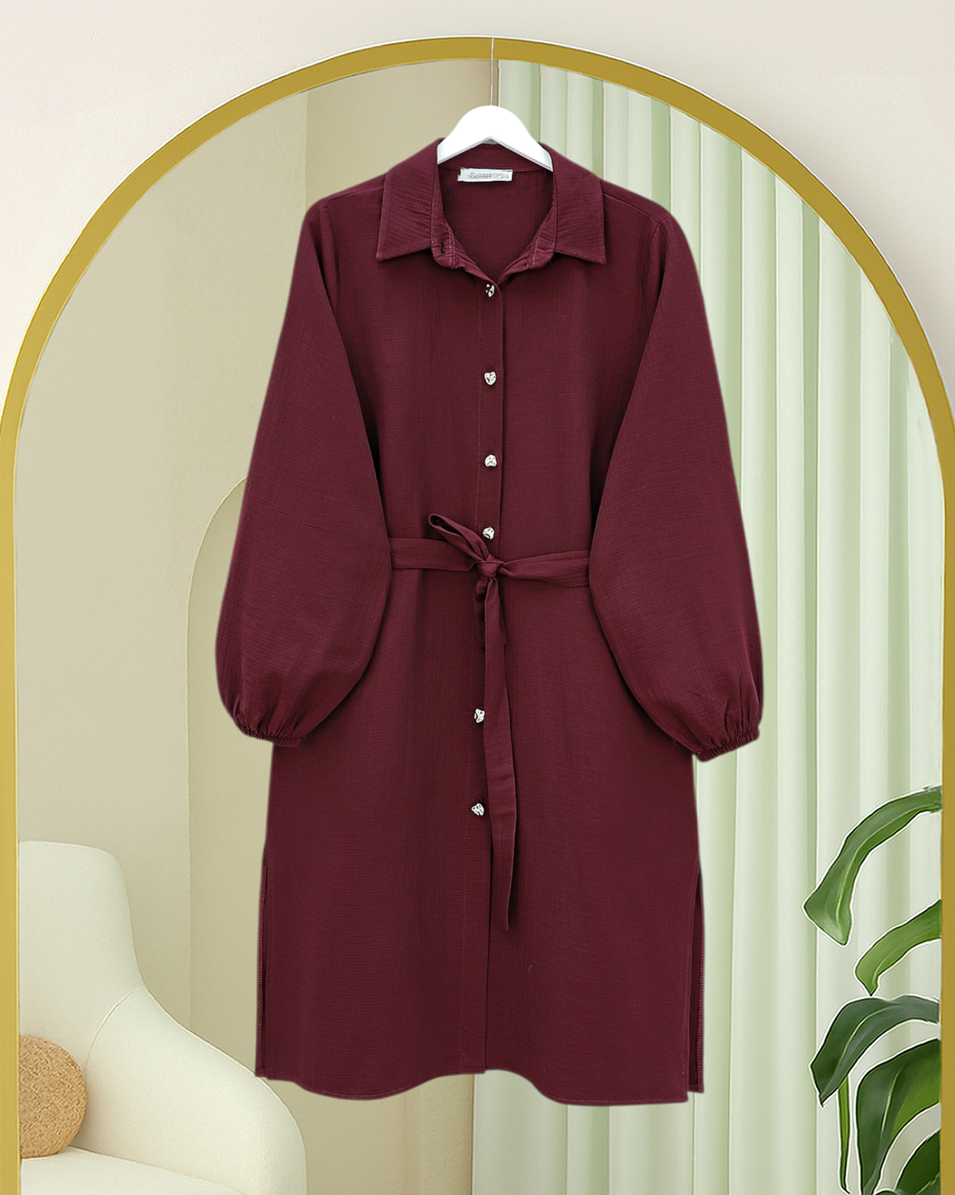 تونيك طويل من الموسلين بأساور مطاطية وخصر برباط -بوردو