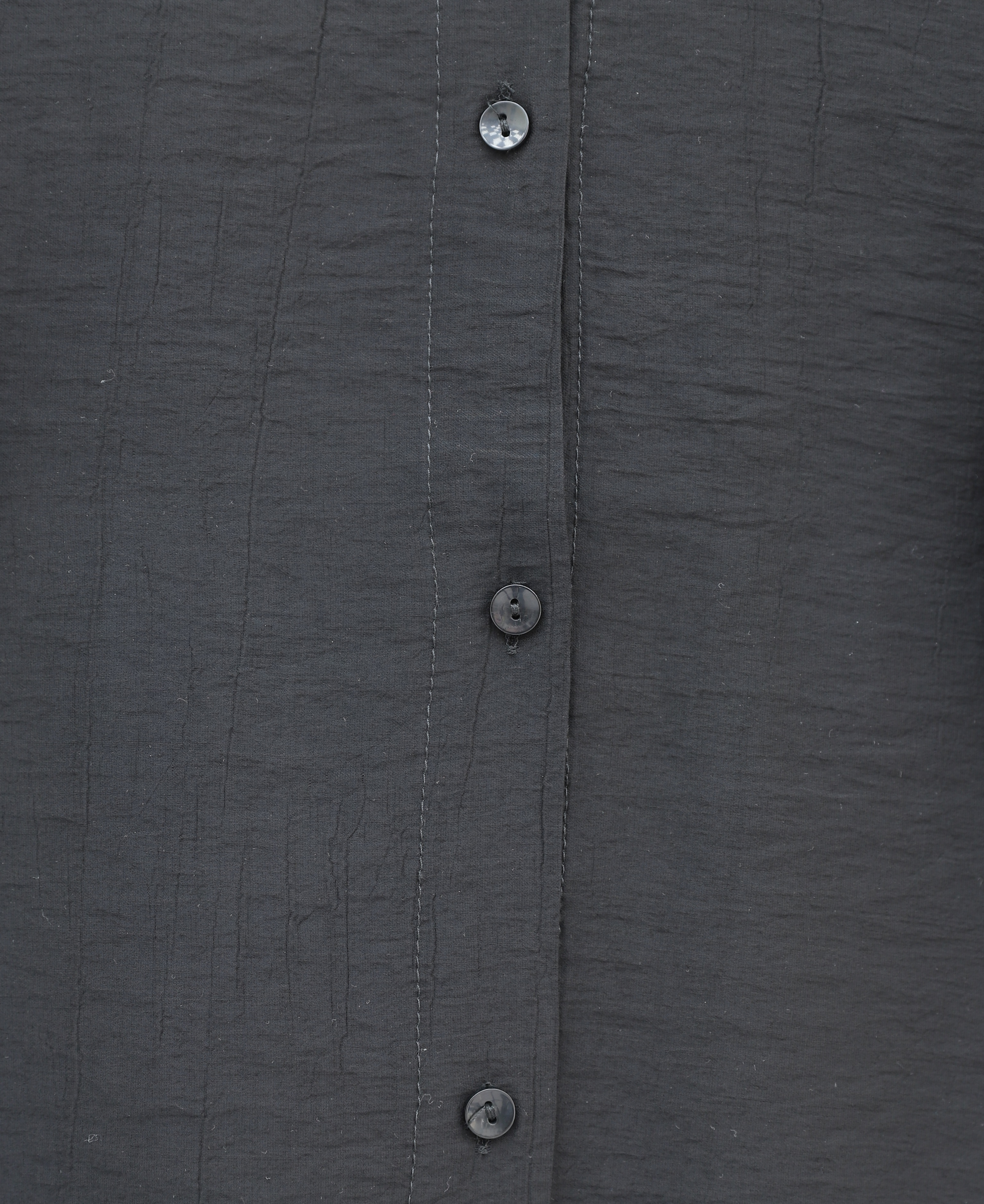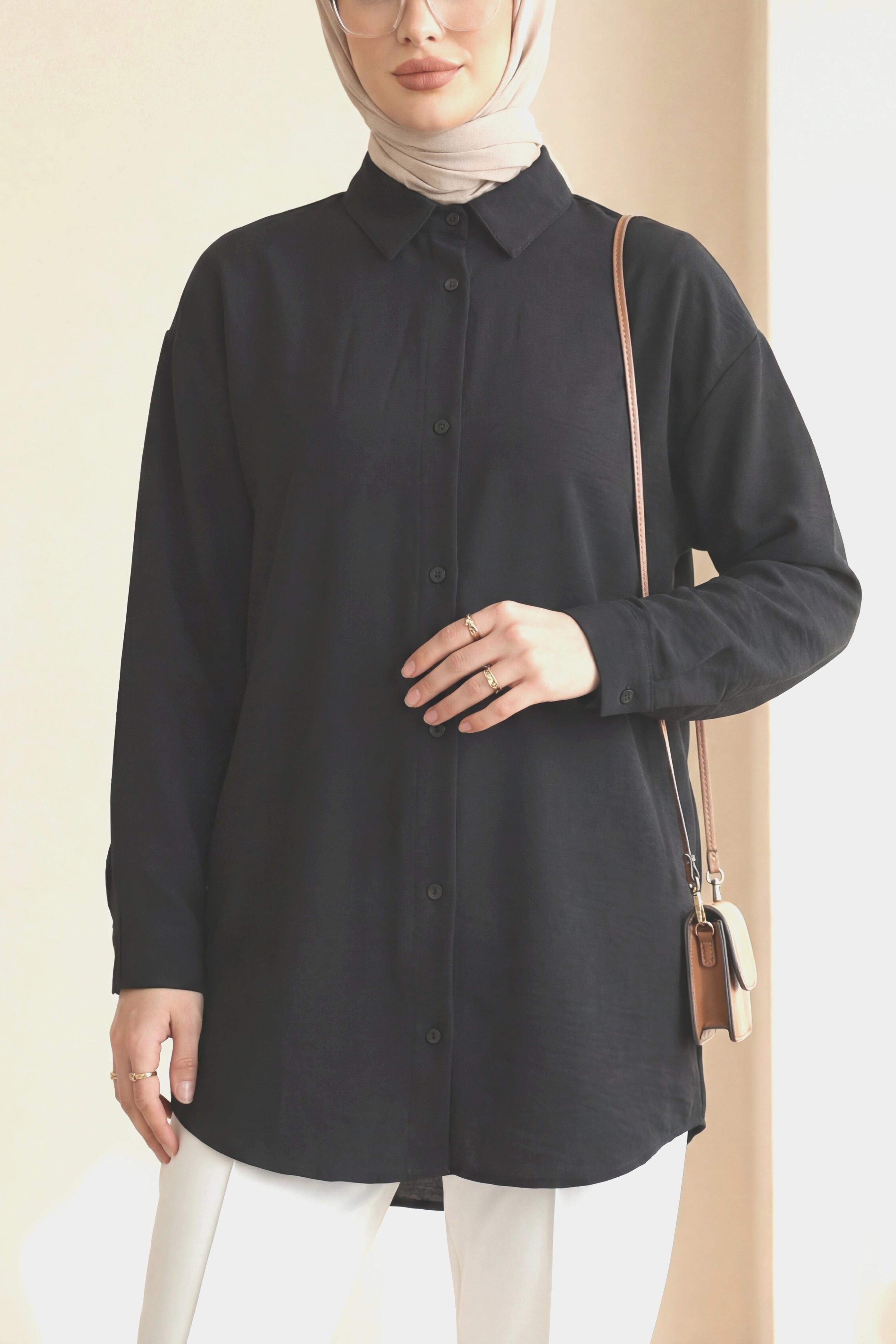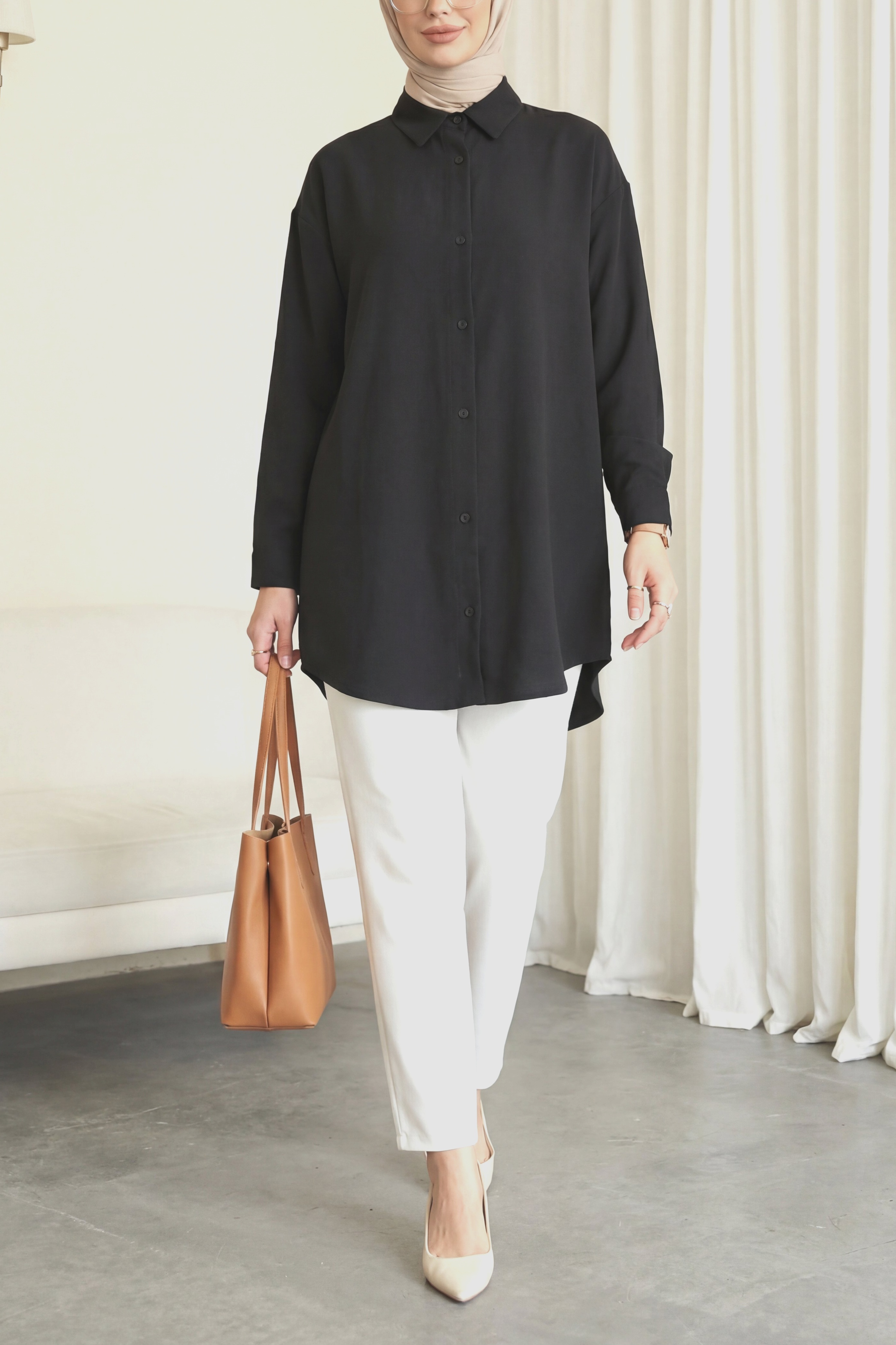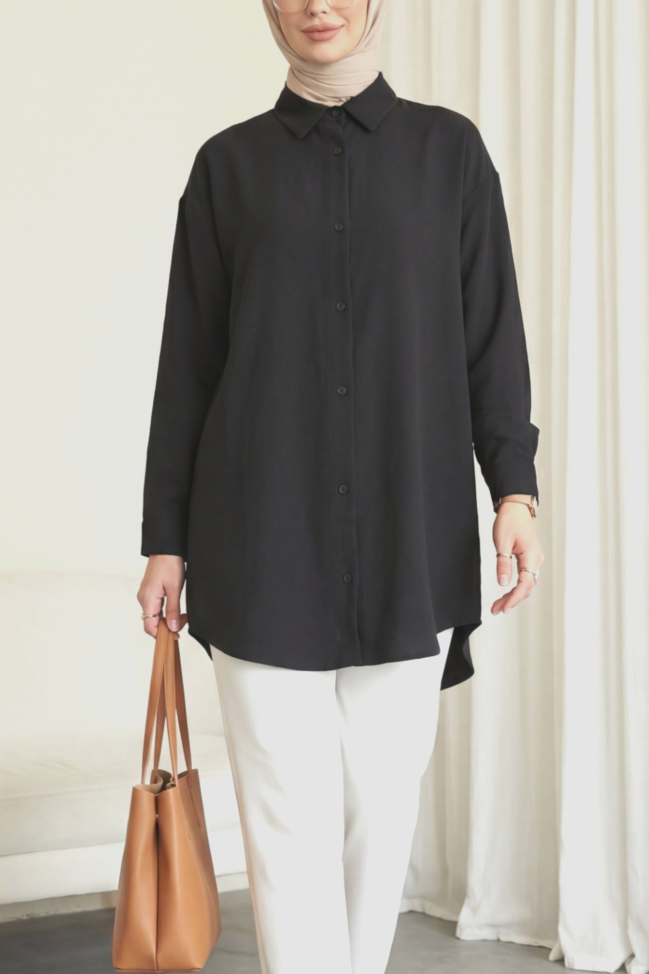 قميص بأزرار أمامية بقصة بيضاوية -أسود