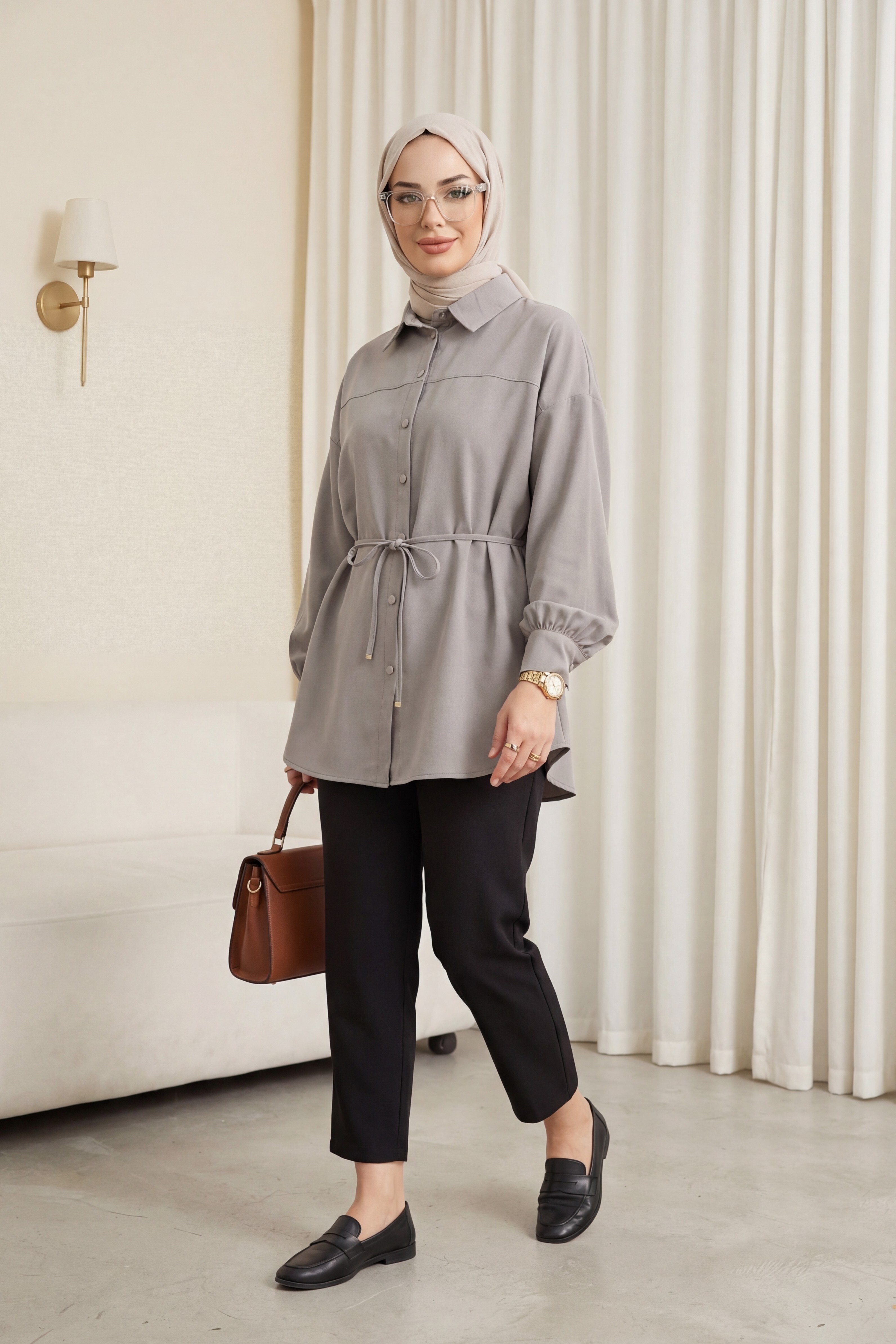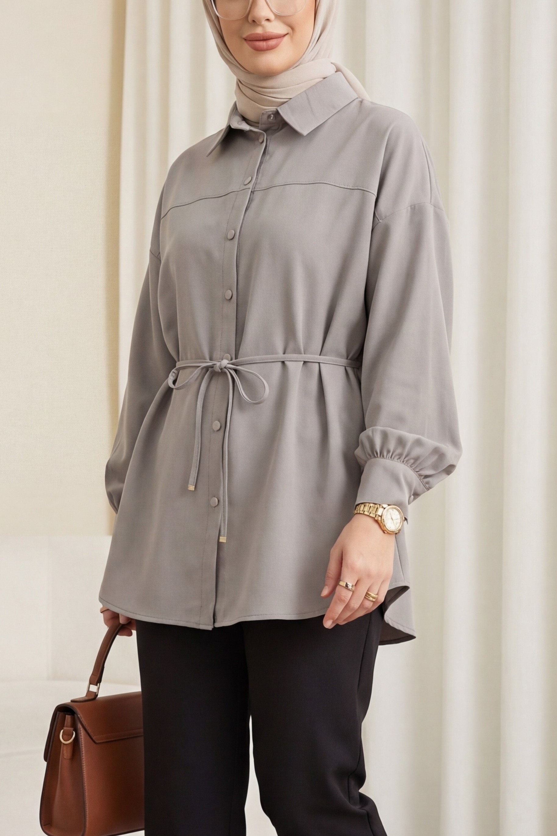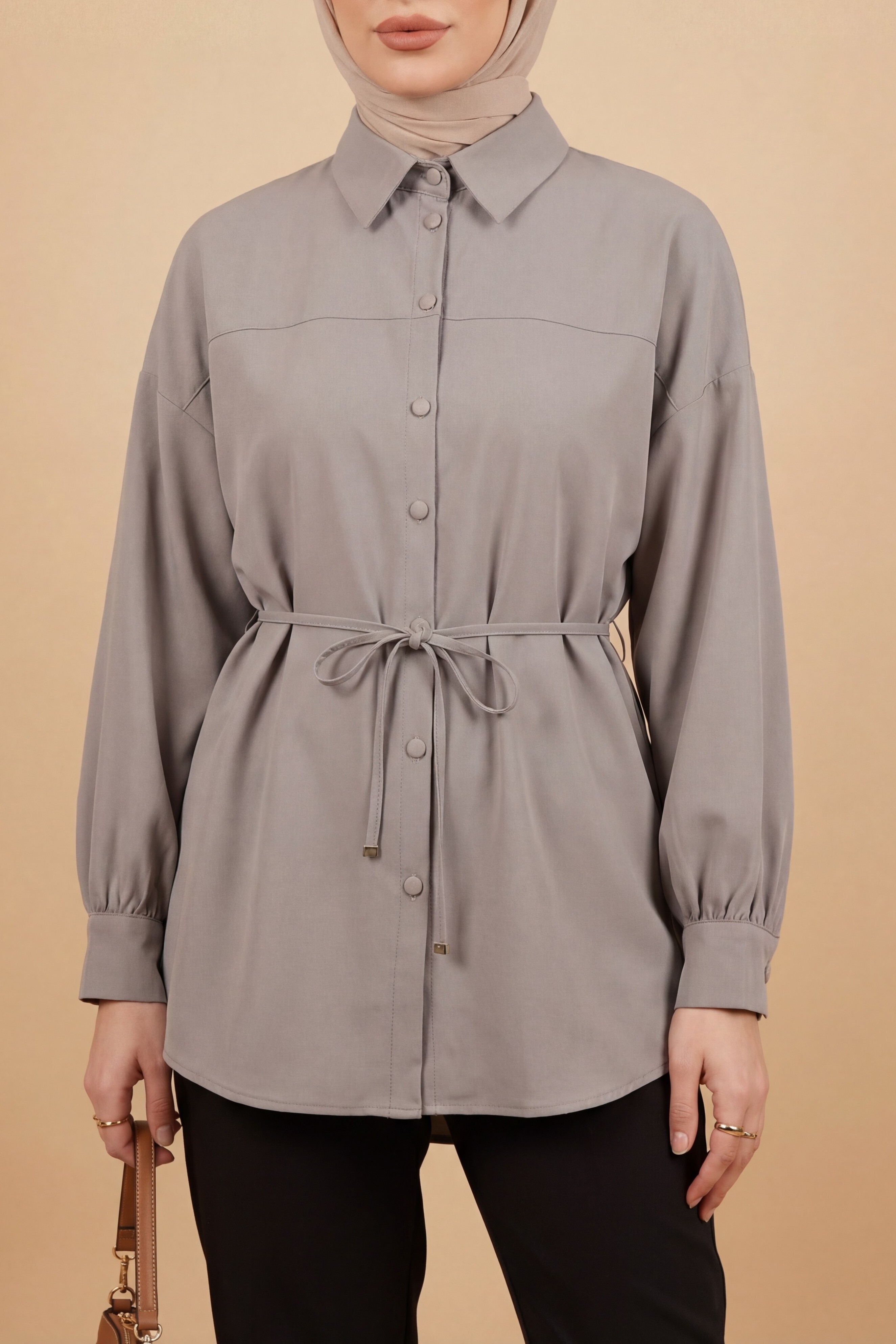 سترة طويلة واسعة من قماش المودال مع حزام وإغلاق بأزرار -اللون الرمادي