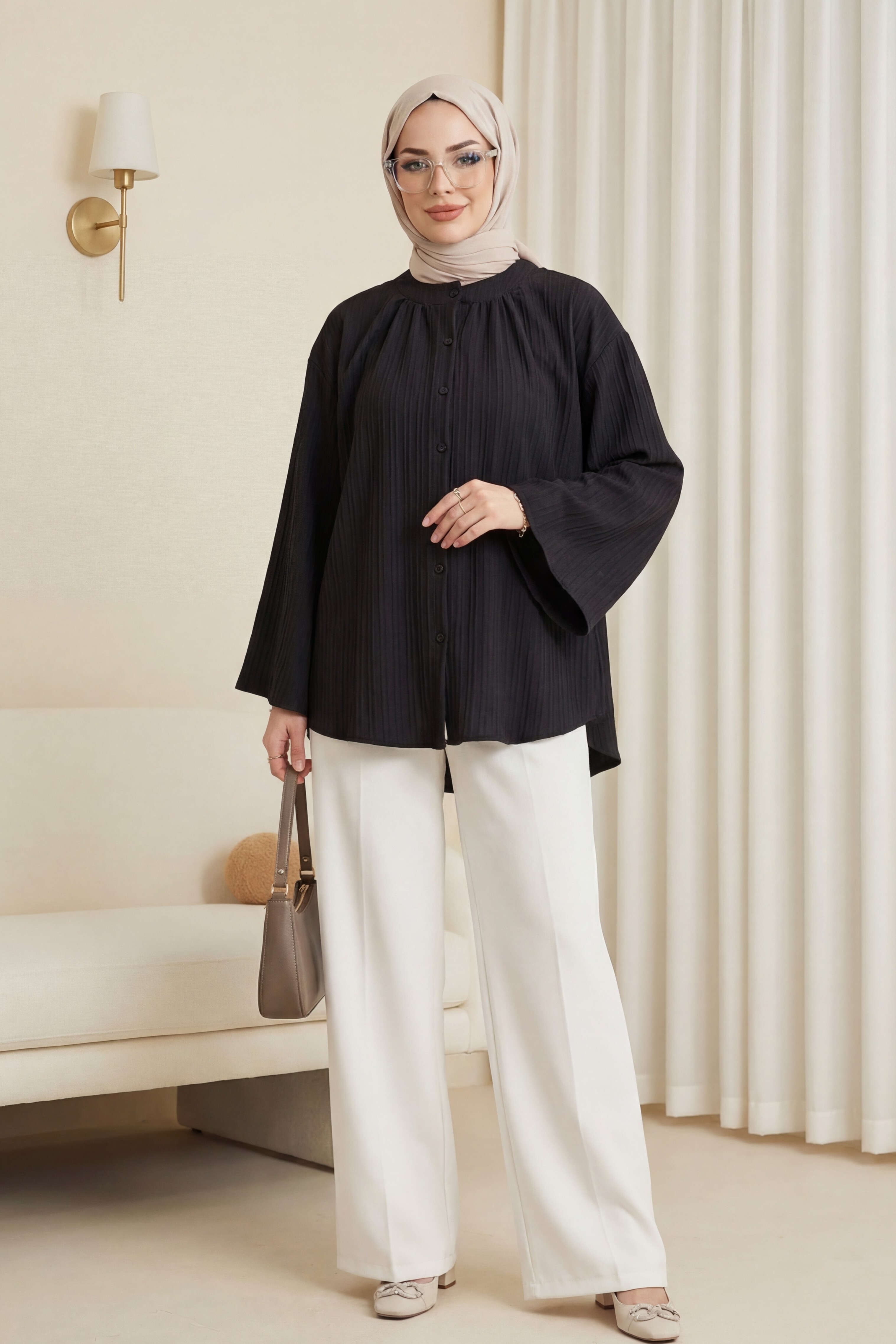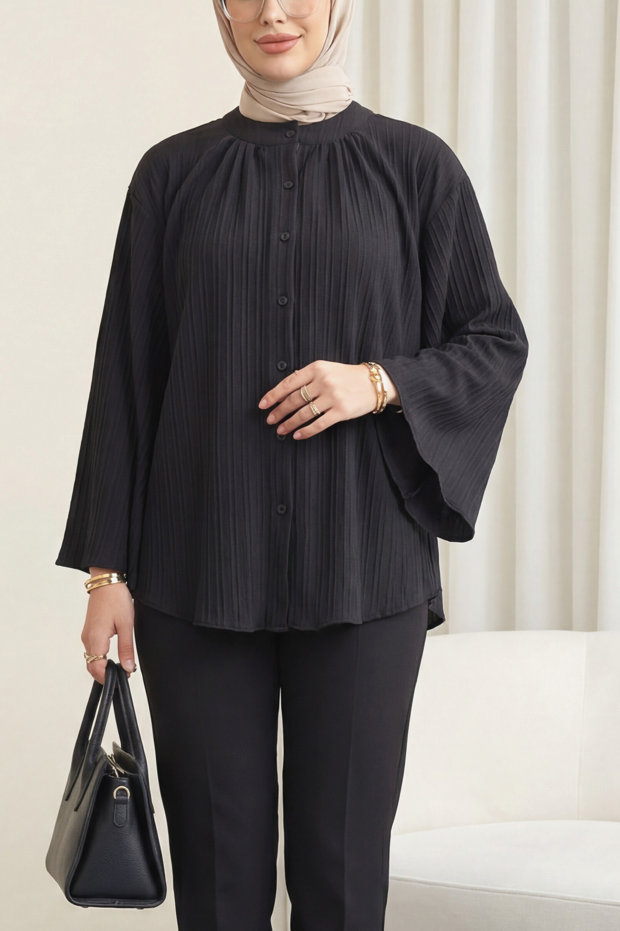سترة سيينا ذات ياقة دائرية وأزرار وأكمام إسبانية -أسود