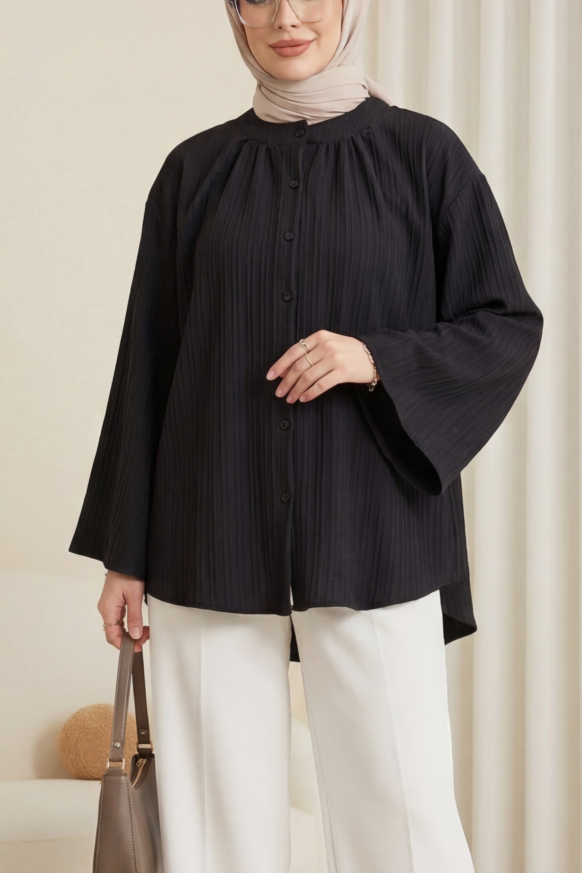 قميص بوبلين مع تفاصيل عباءة وياقة قائمة -وردي