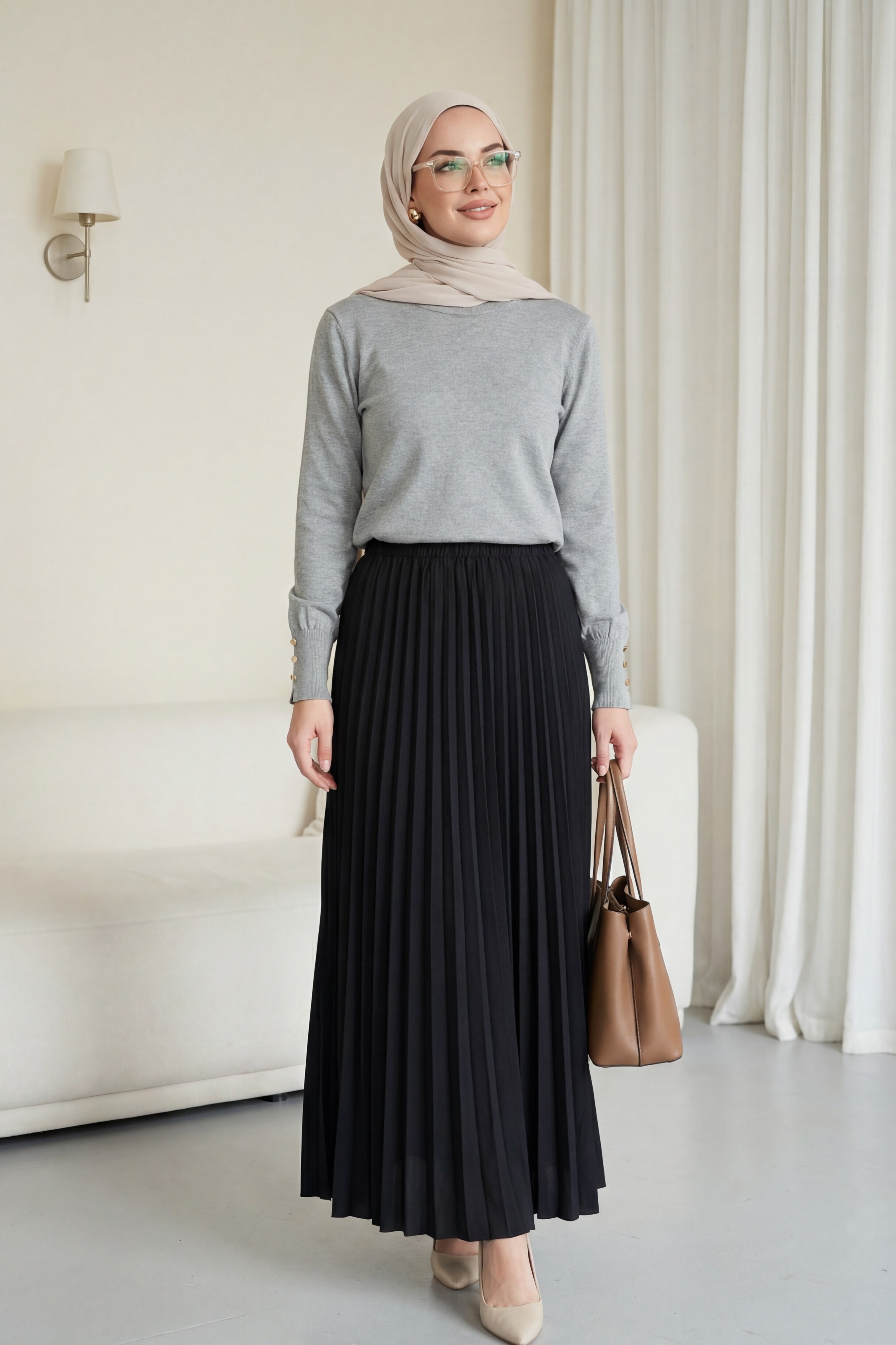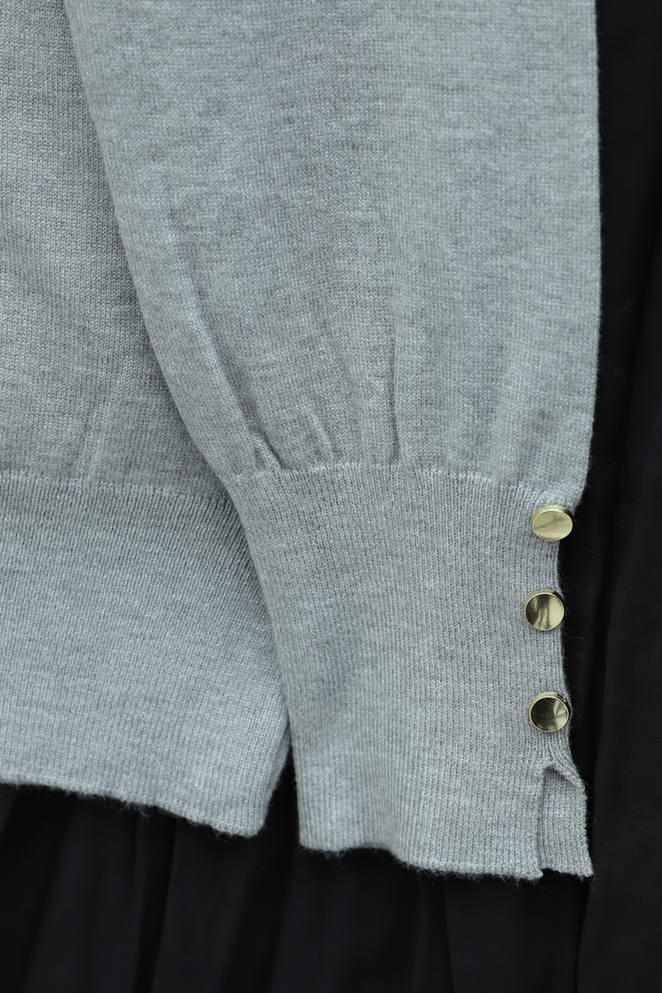 تونيك محبوك برقبة دائرية وتفاصيل أزرار على الأكمام -رمادي فاتح