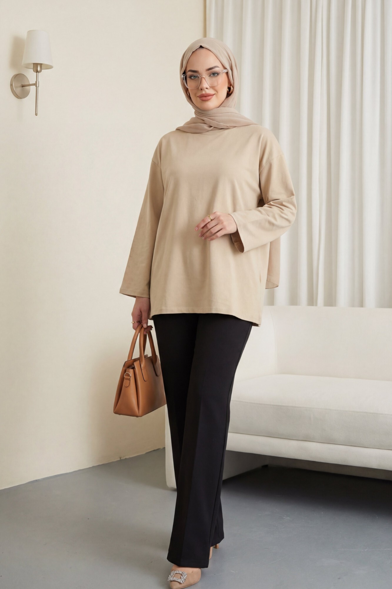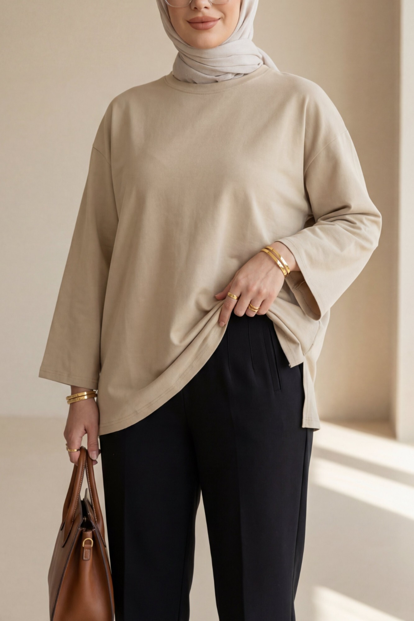 تونيك قطني فضفاض برقبة دائرية -بيج كاشف