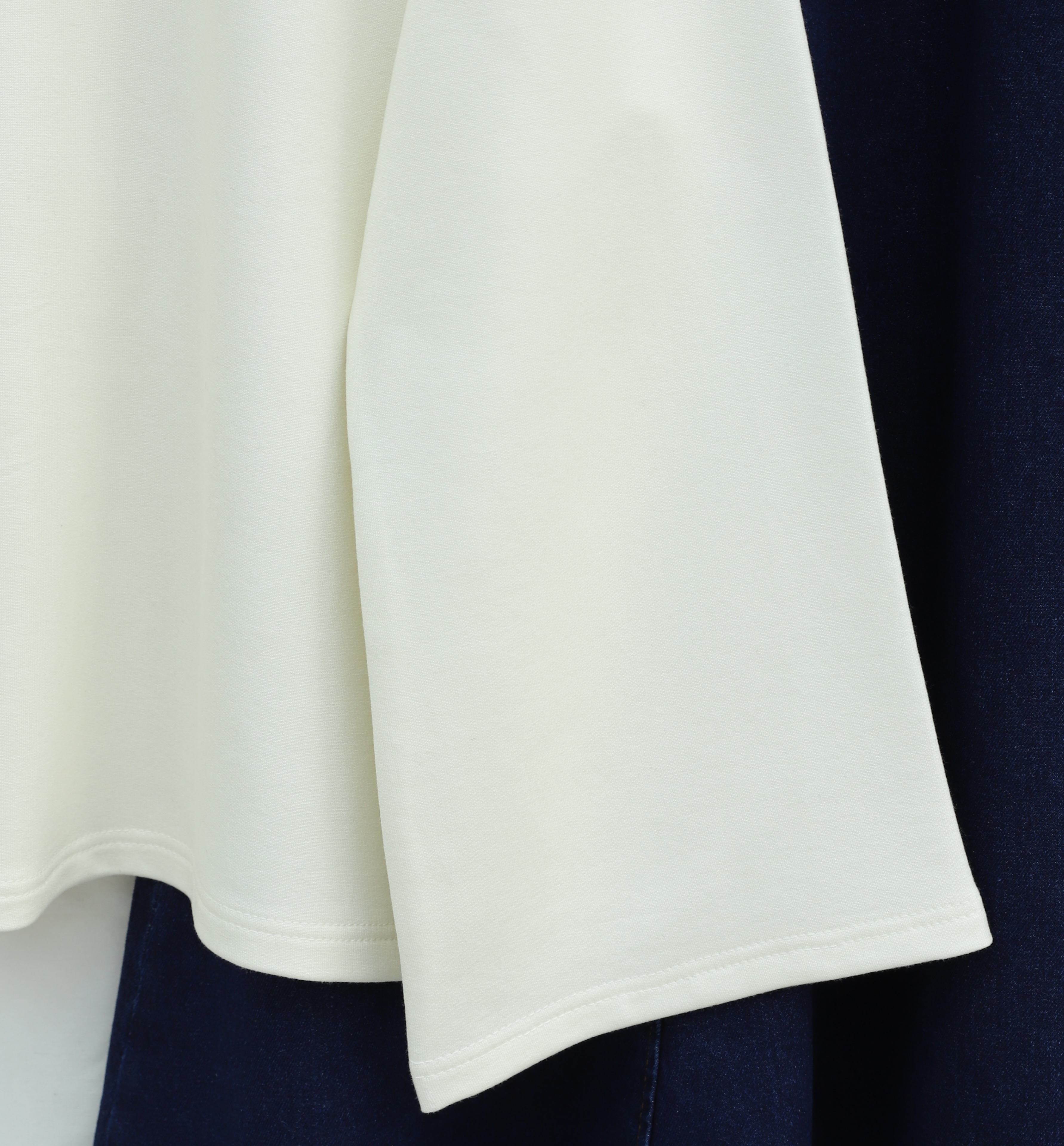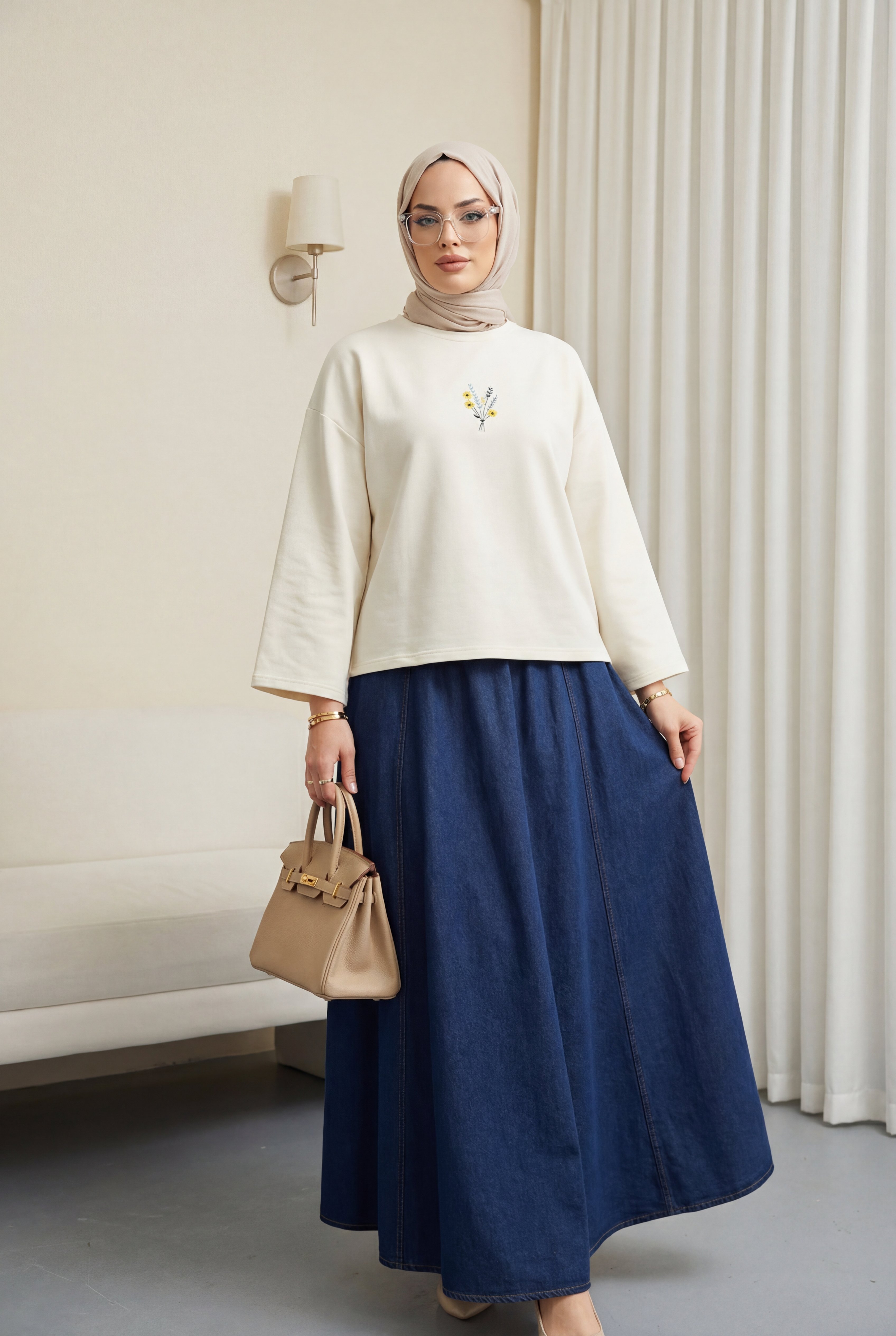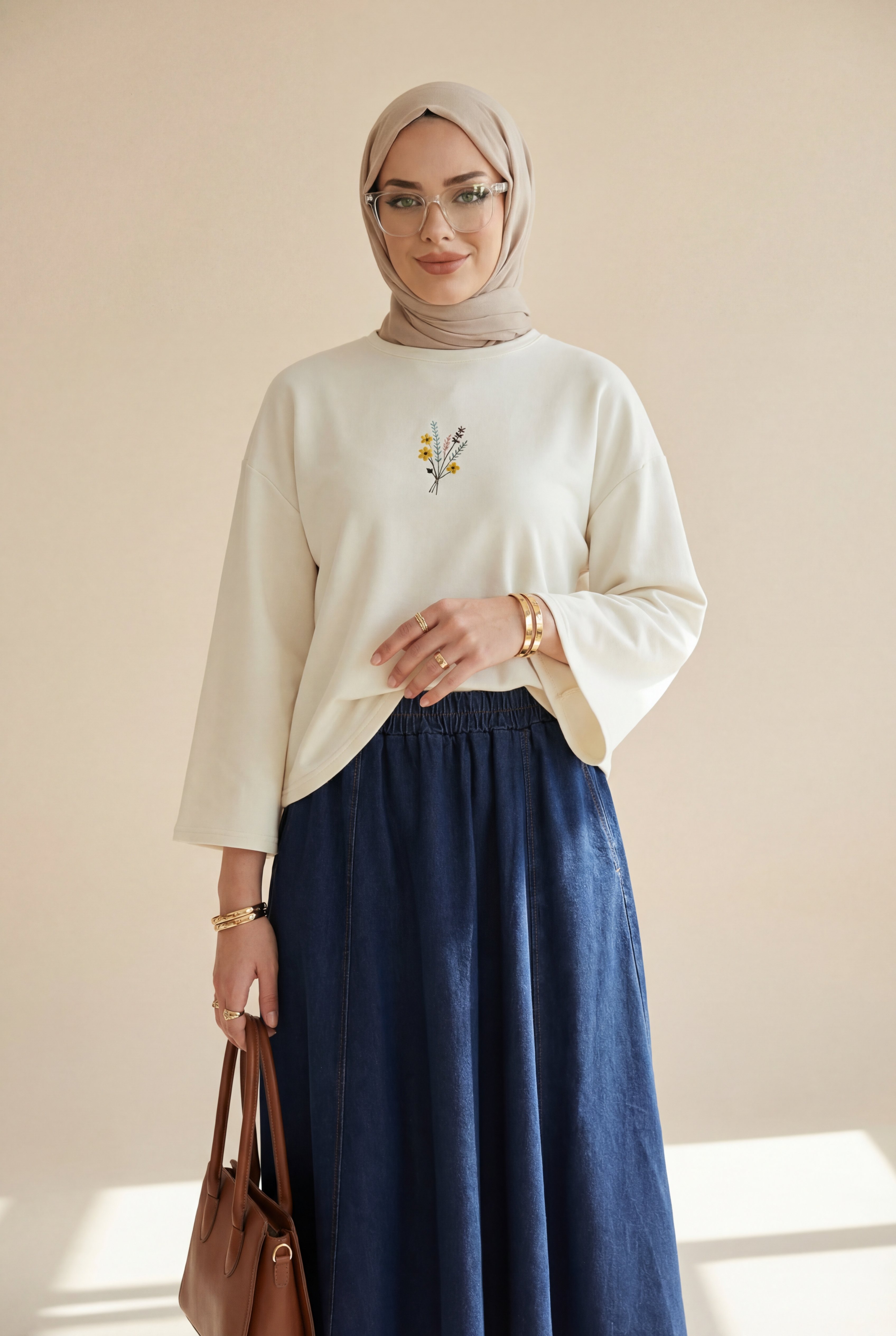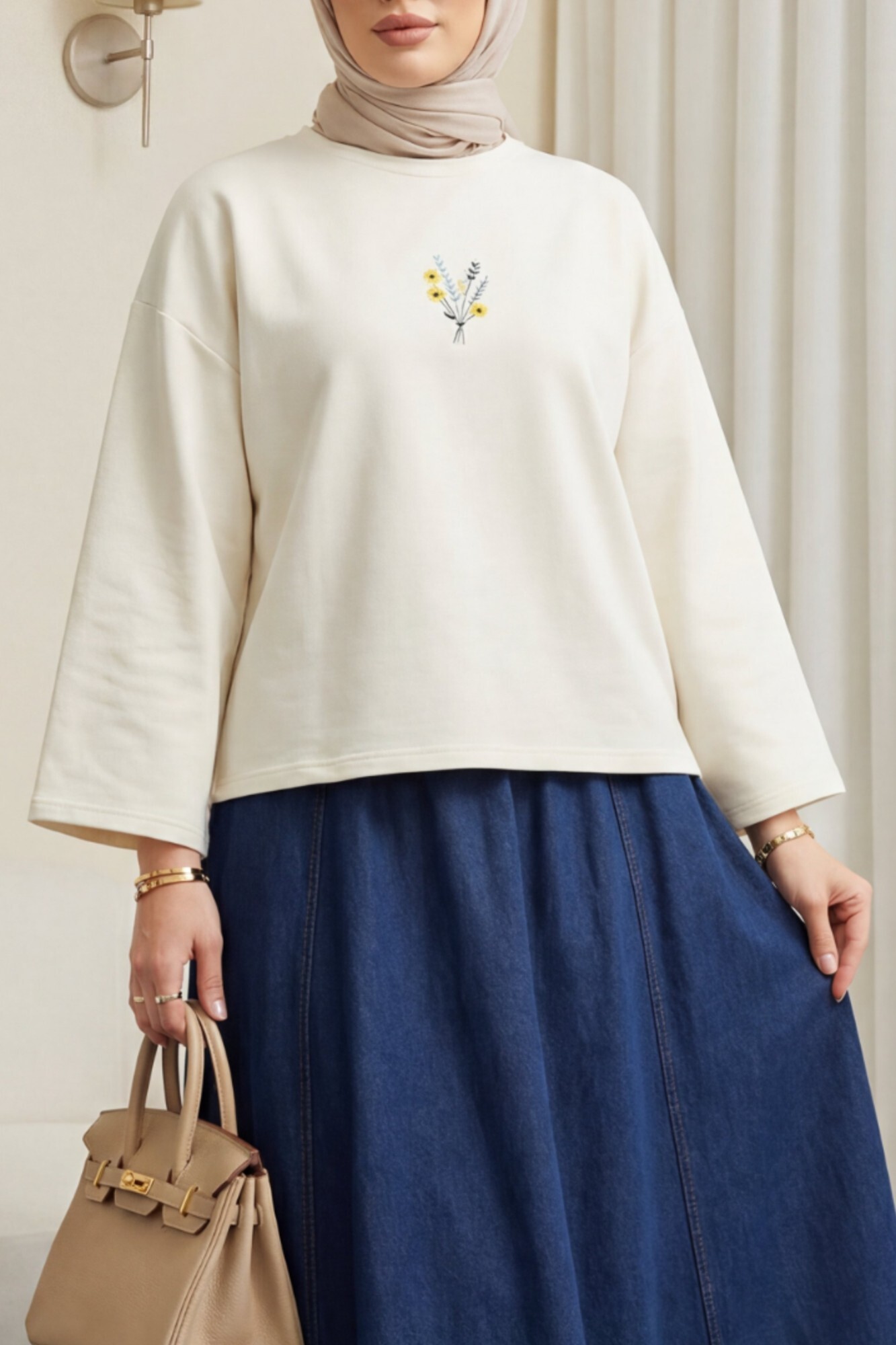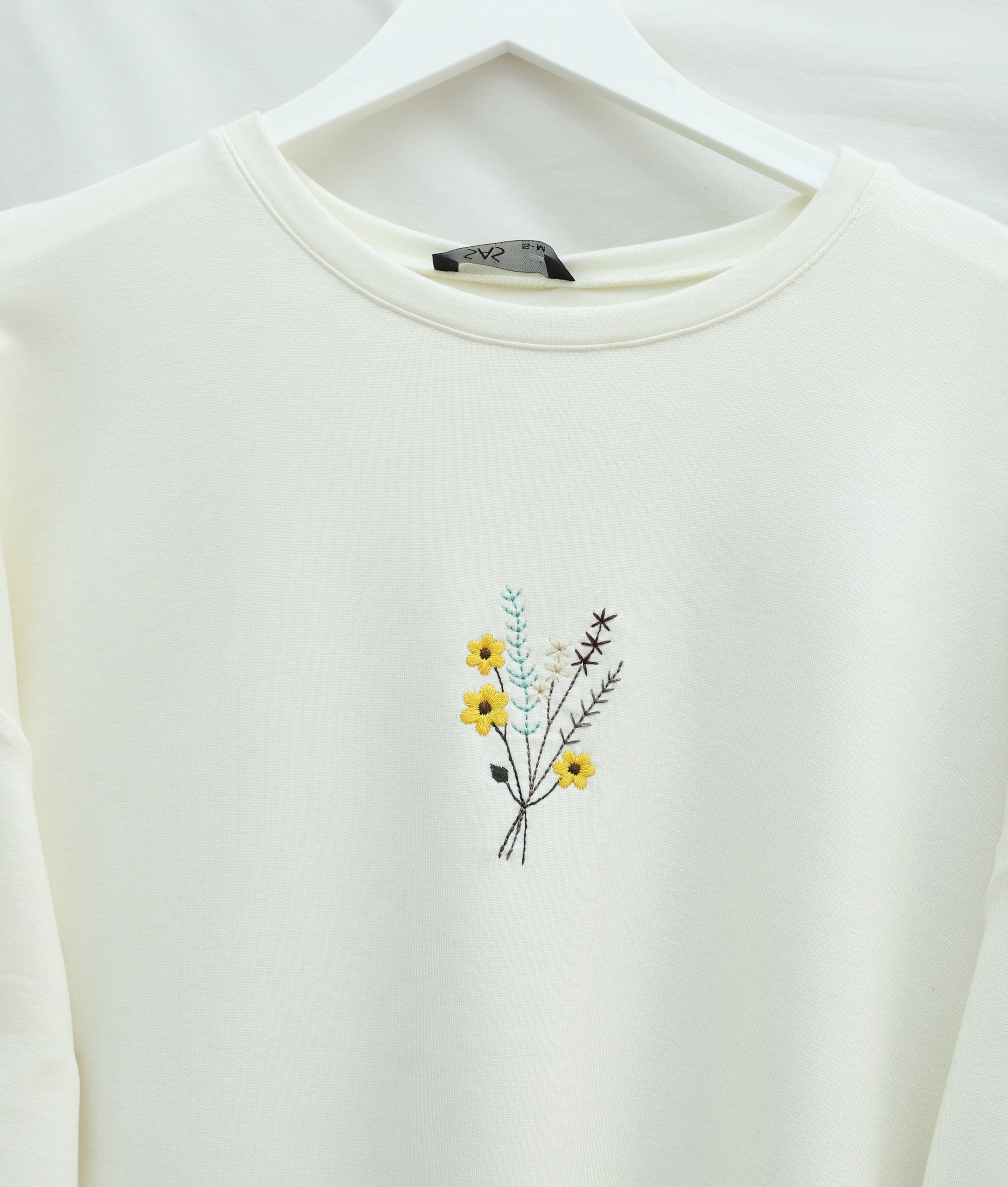 بلوزة جيرسي فضفاضة برقبة دائرية مزينة بتطريزات زهرية في الأمام -أبيض سكري