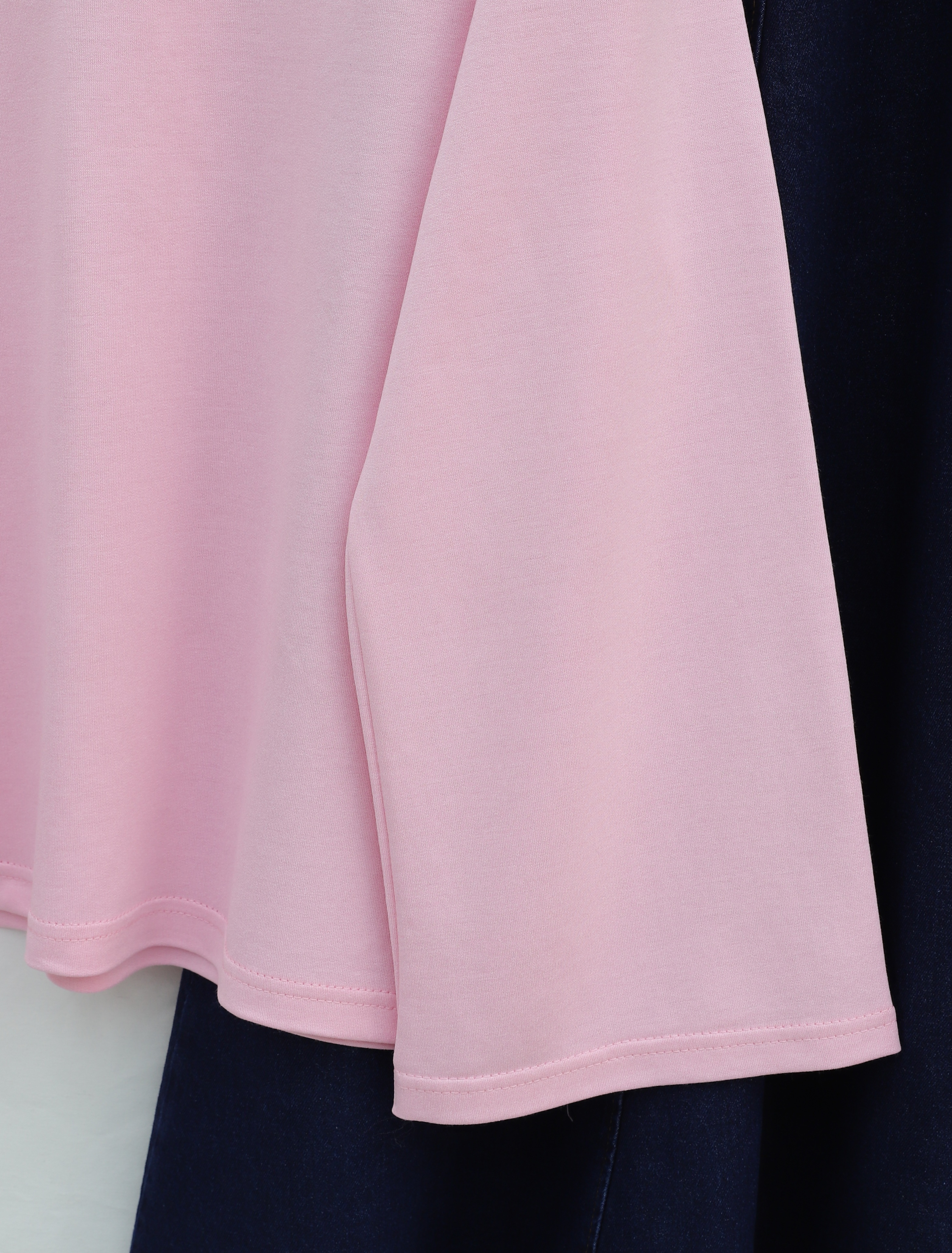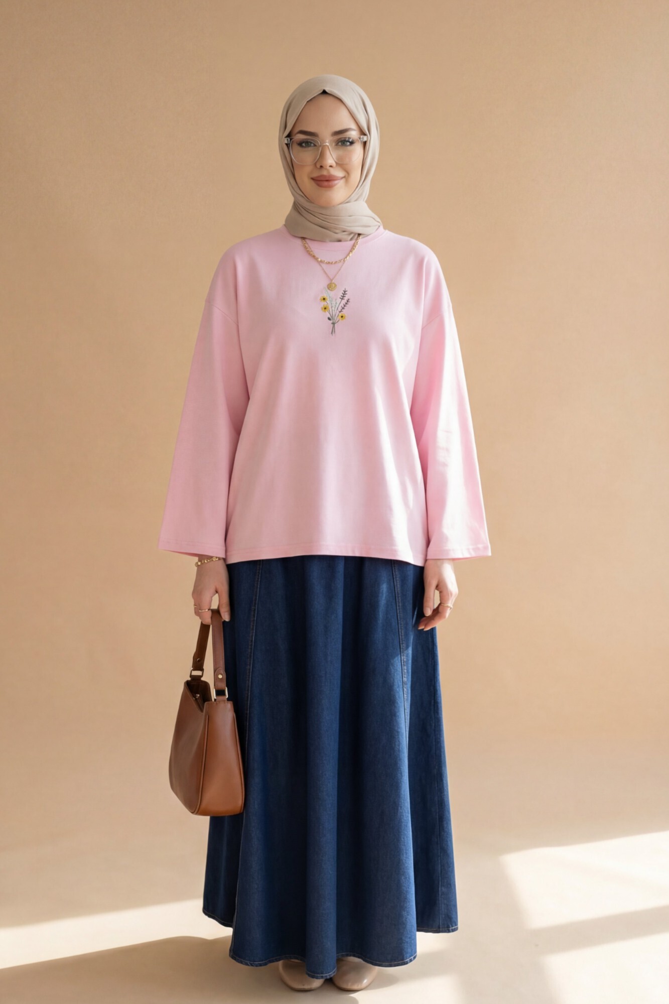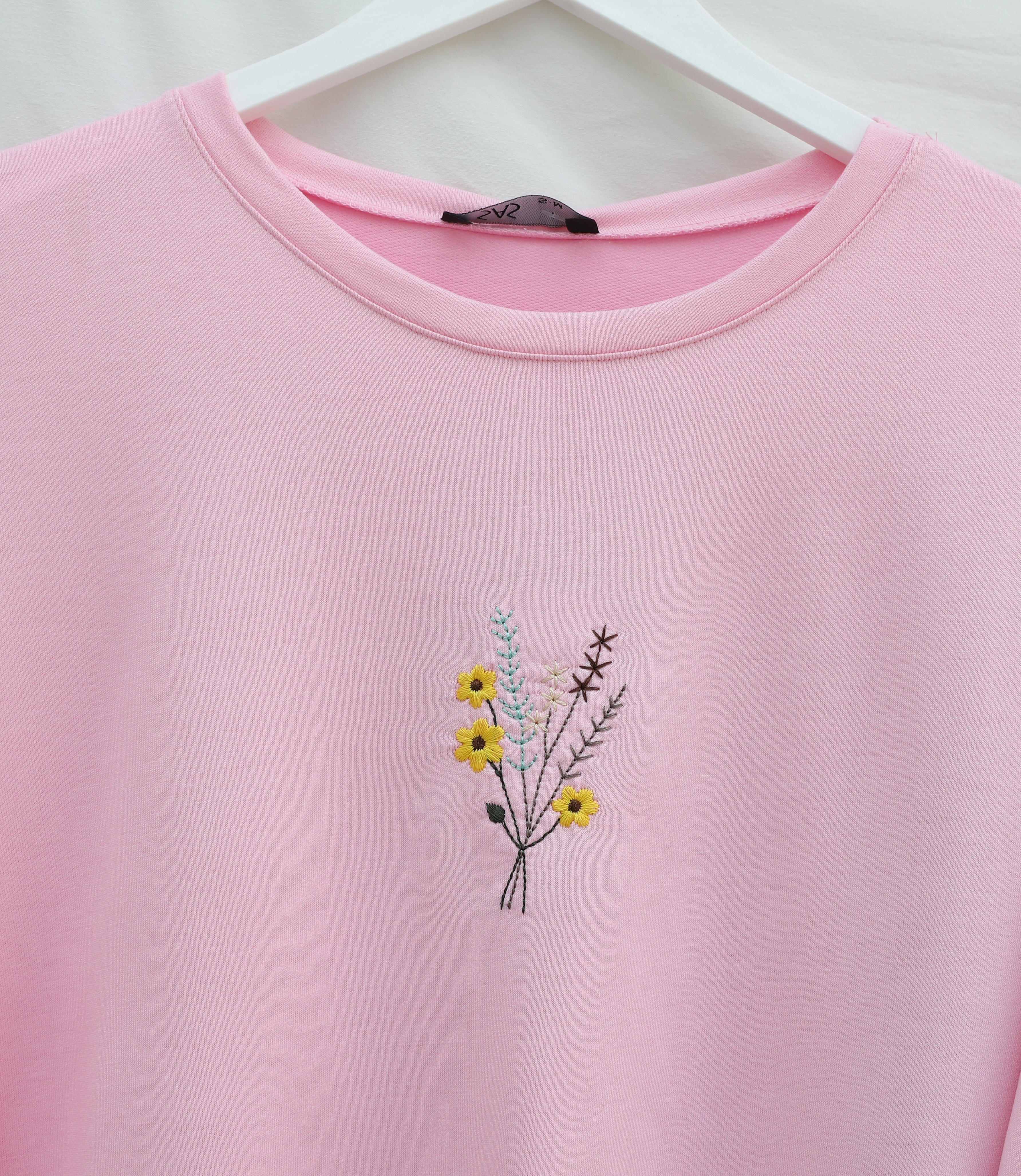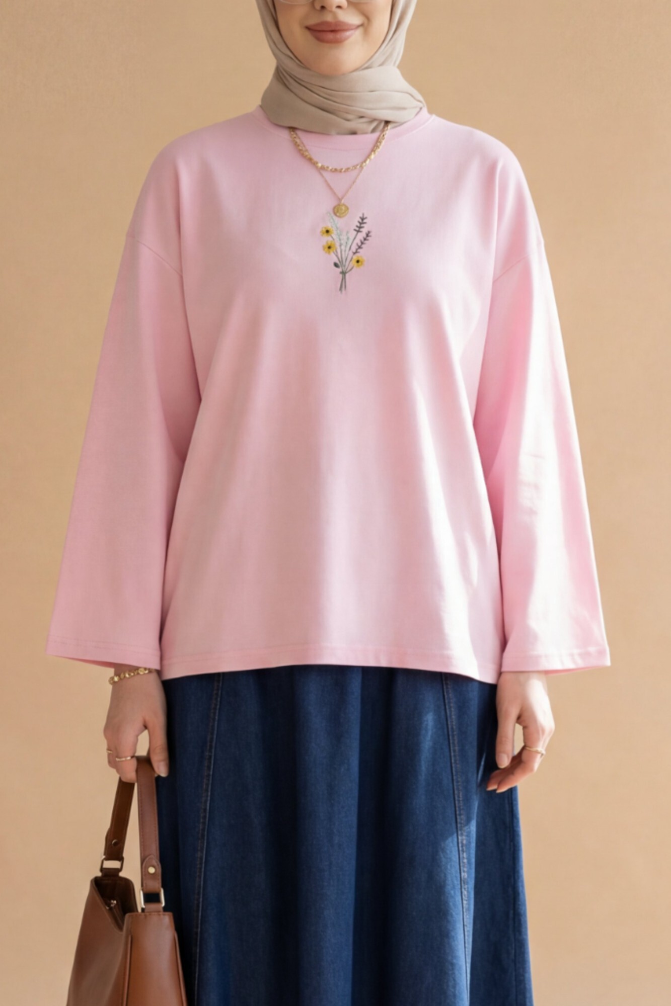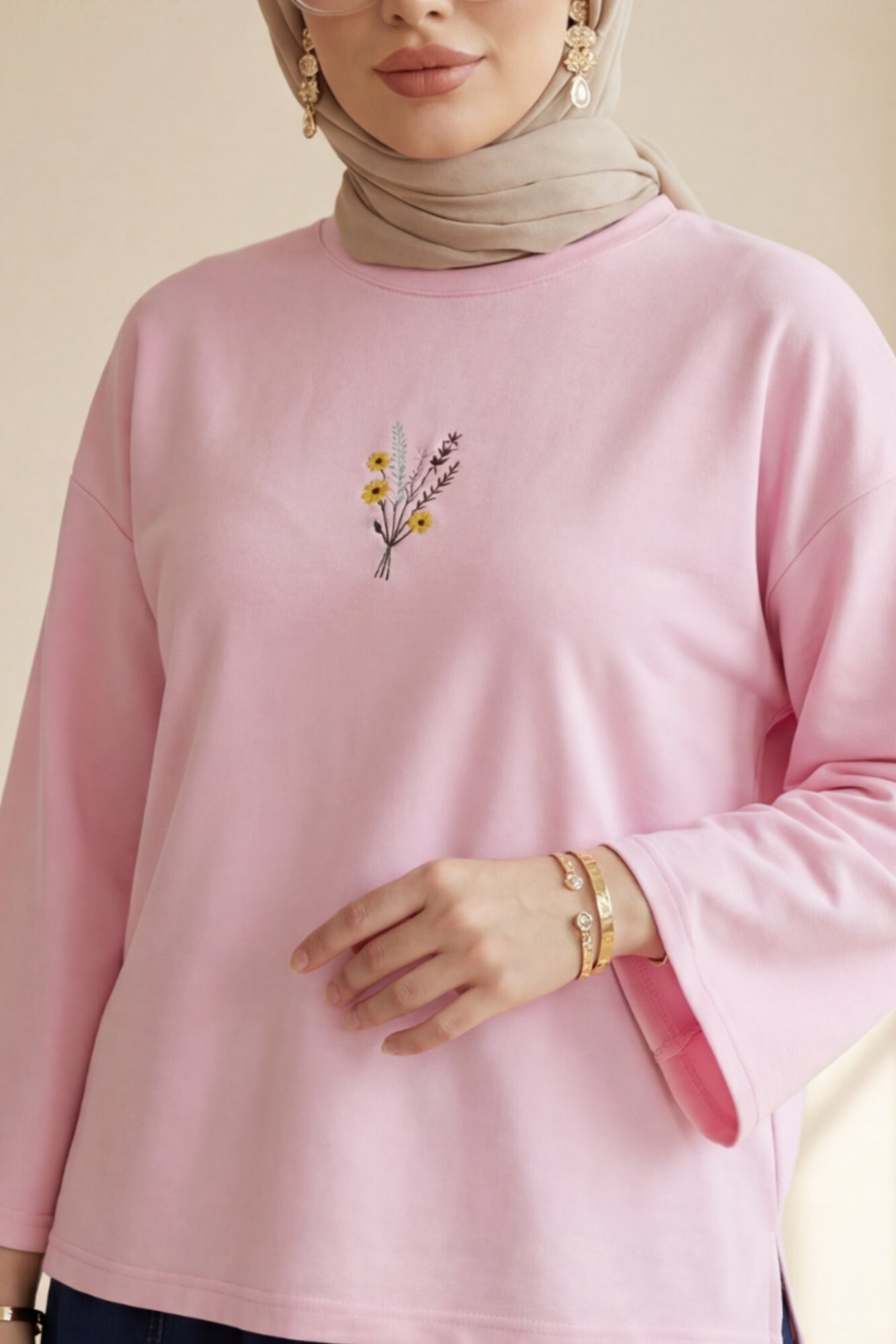بلوزة جيرسي فضفاضة برقبة دائرية مزينة بتطريزات زهرية في الأمام -وردي