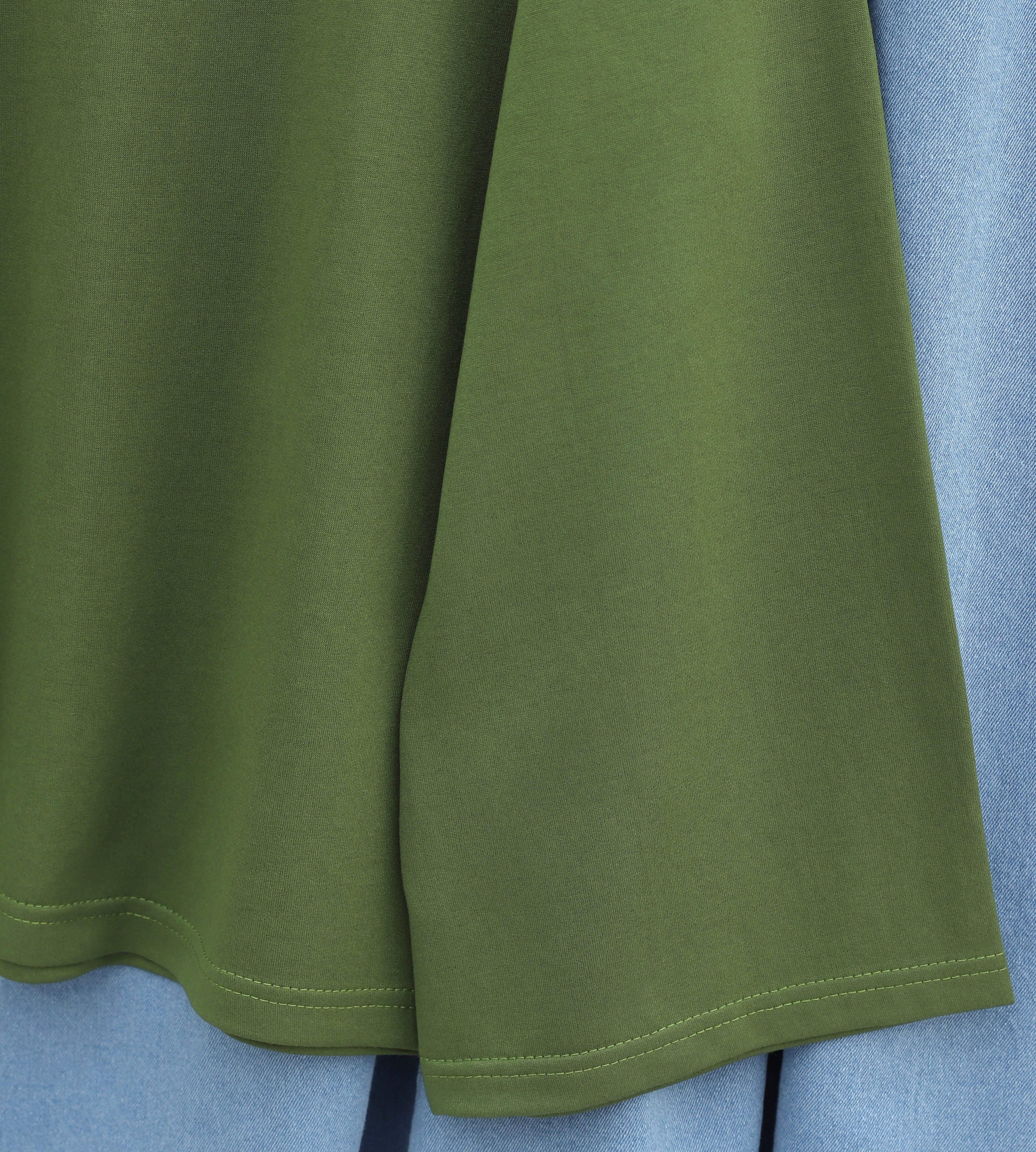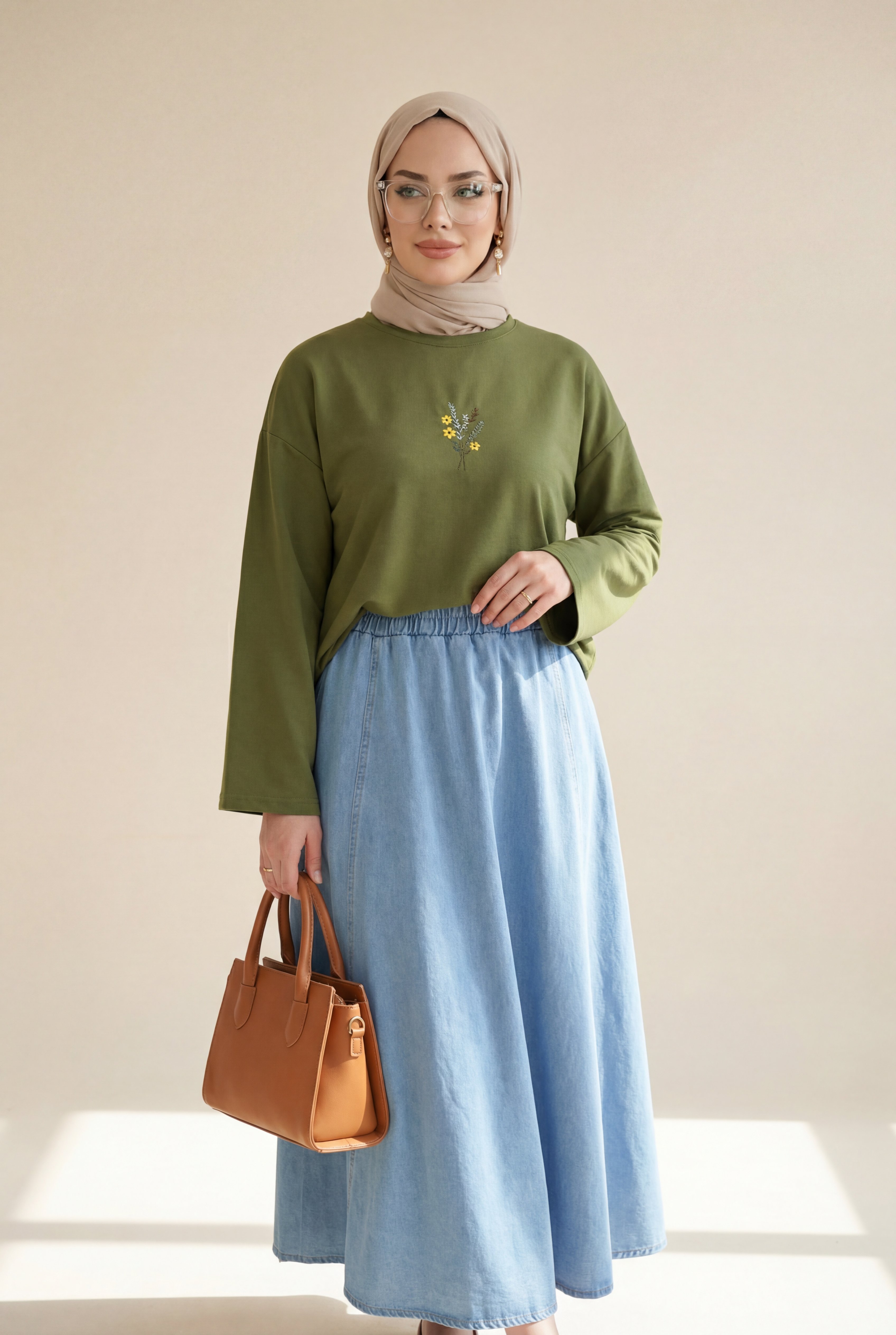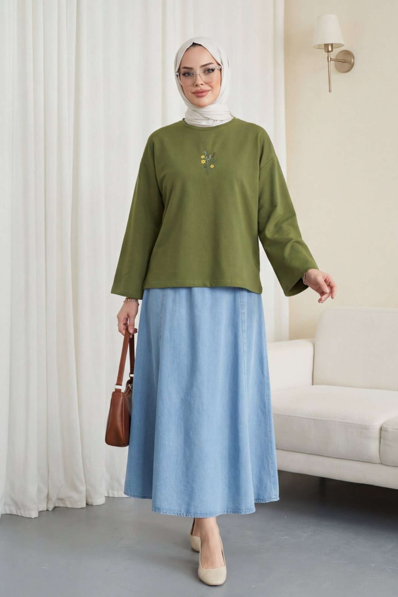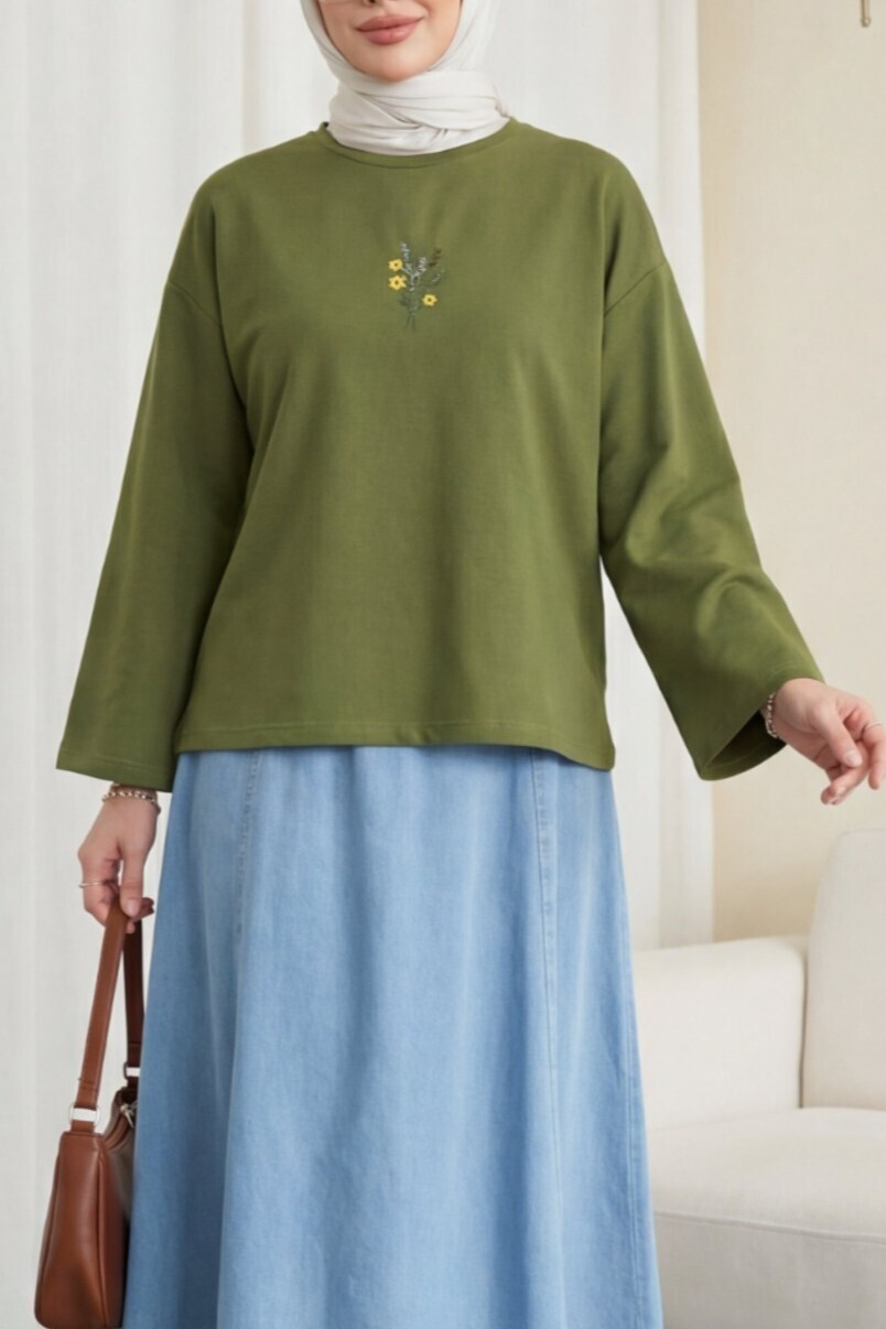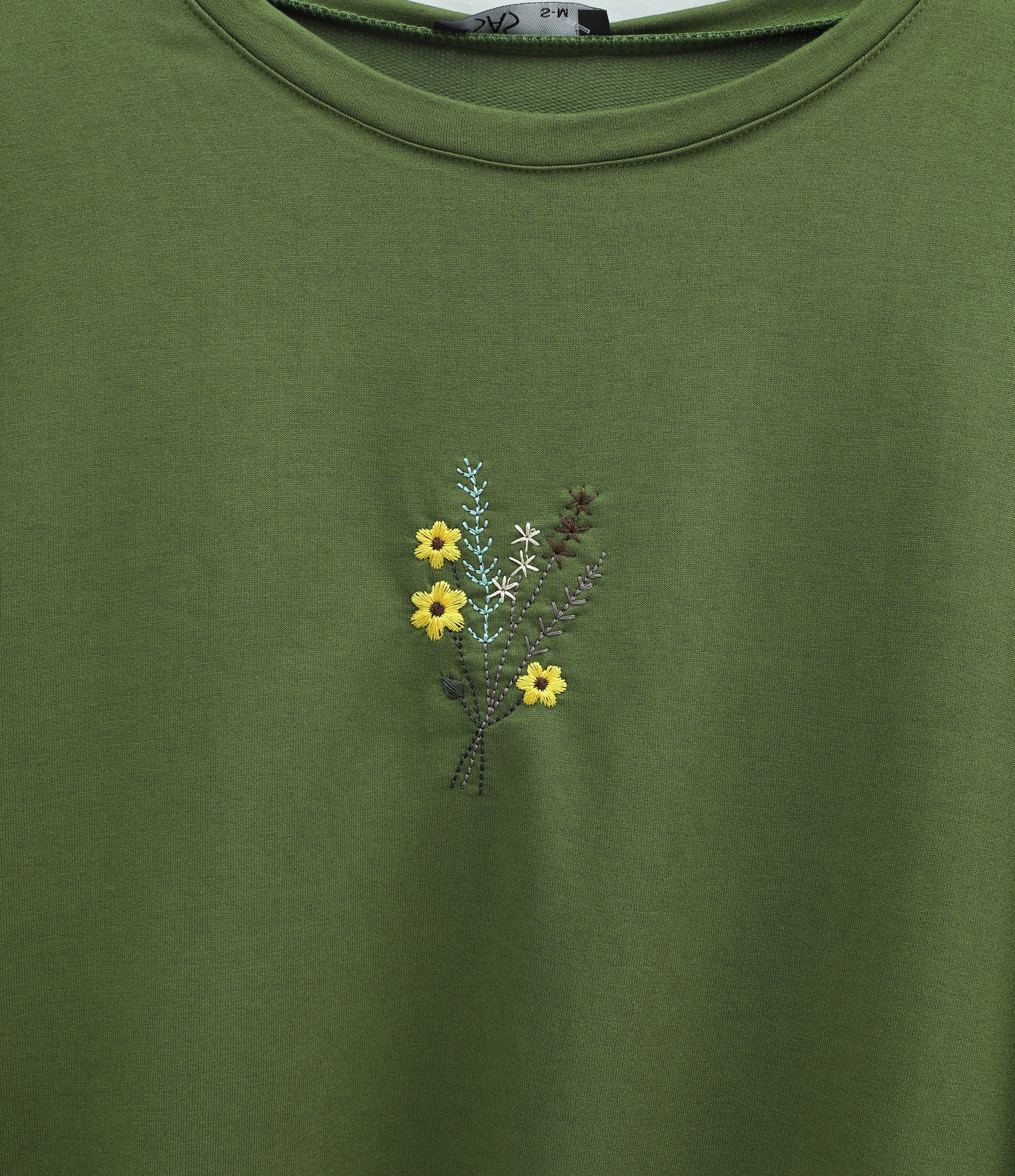 بلوزة جيرسي فضفاضة برقبة دائرية مزينة بتطريزات زهرية في الأمام -أخضر