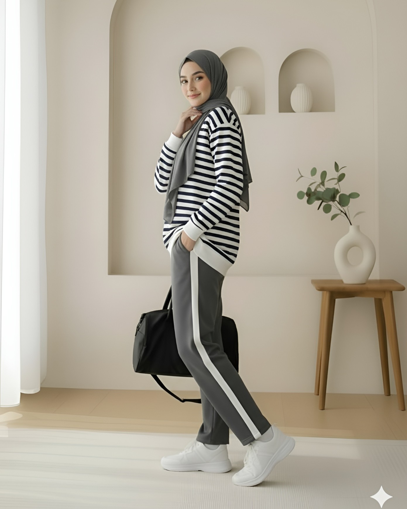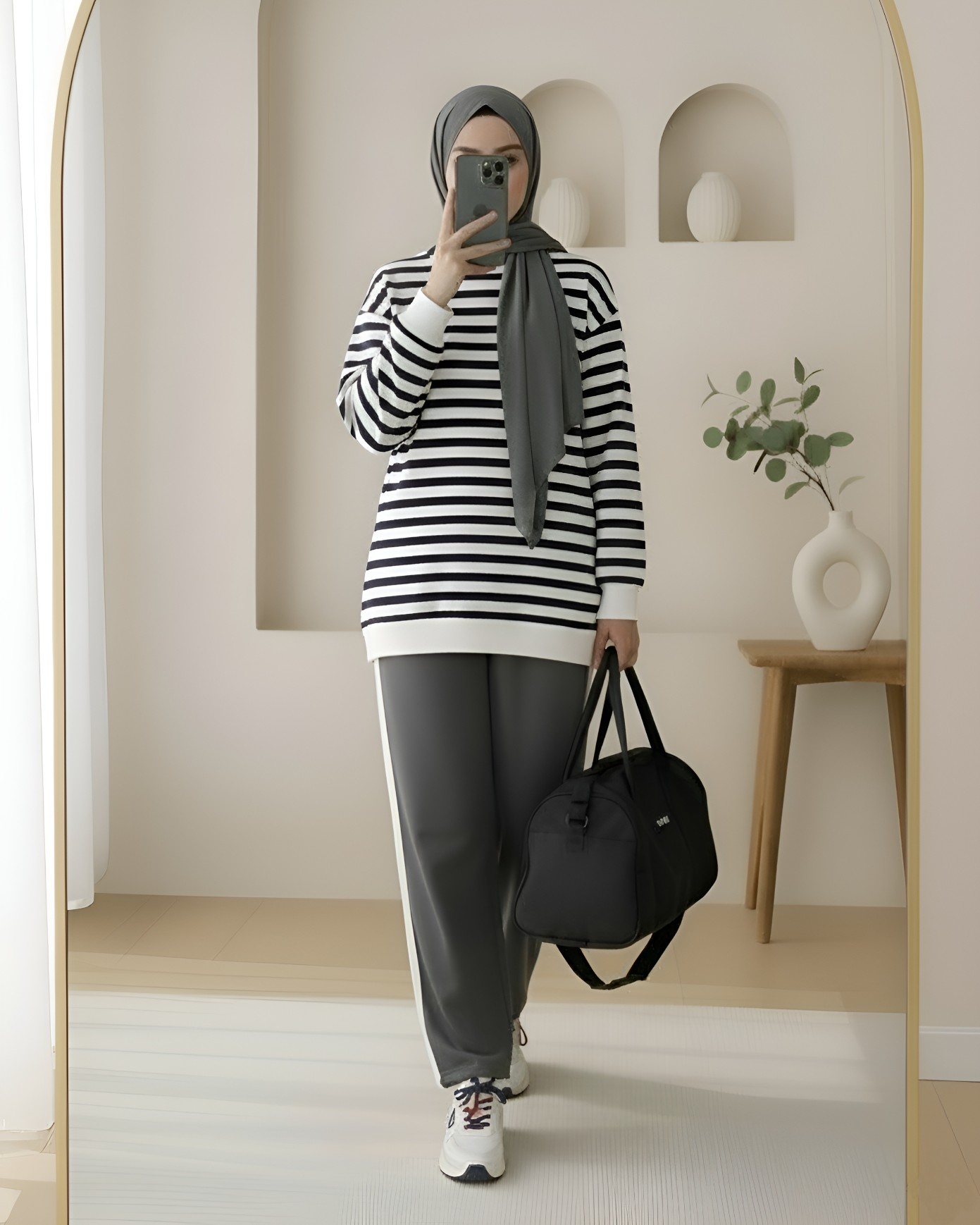 يعتبر موديل السترة ذات الرقبة الدائرية والمخططة والمزودة بتنورة مشقوقة من بين الموديلات الأكثر شعبية للموسم الجديد.