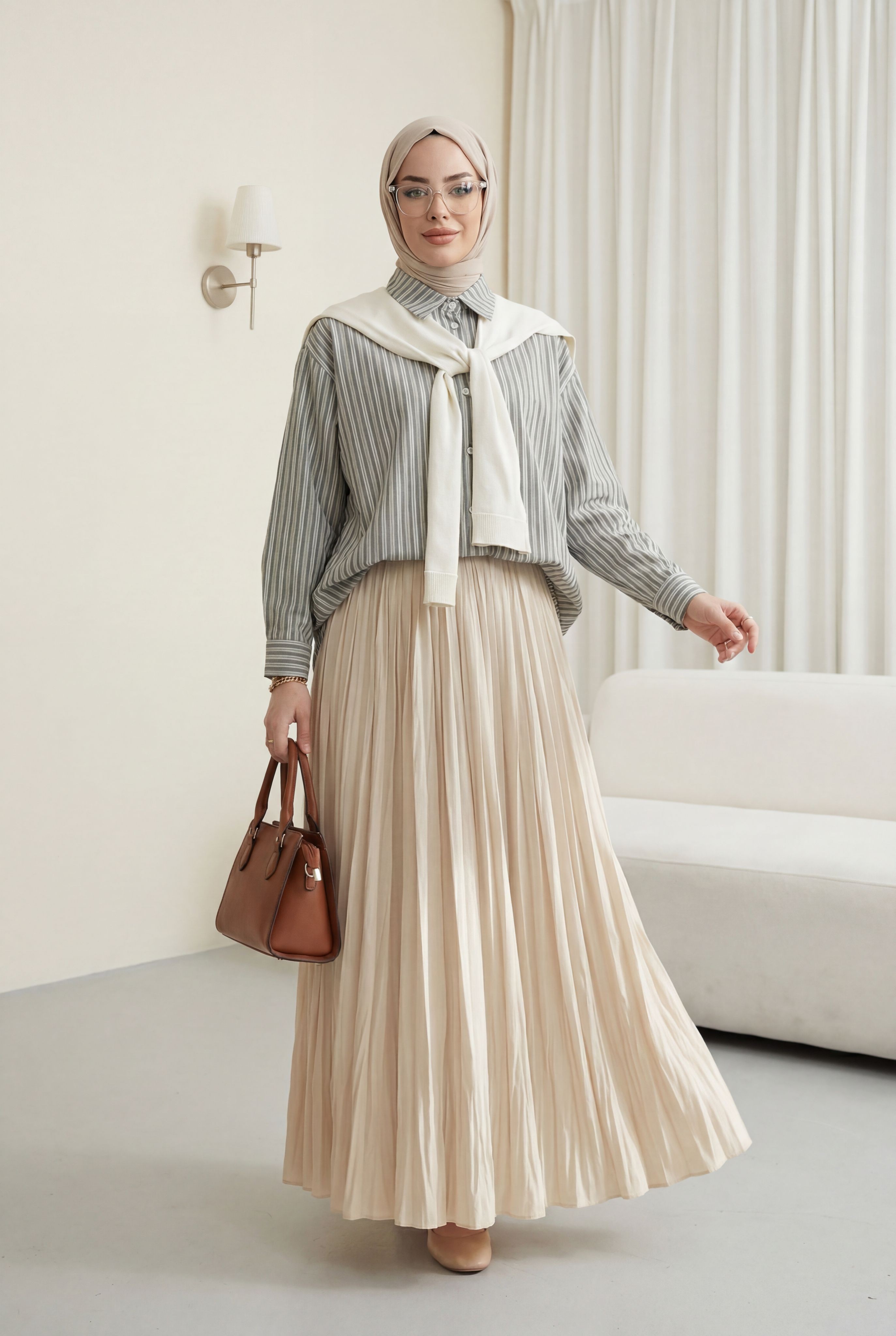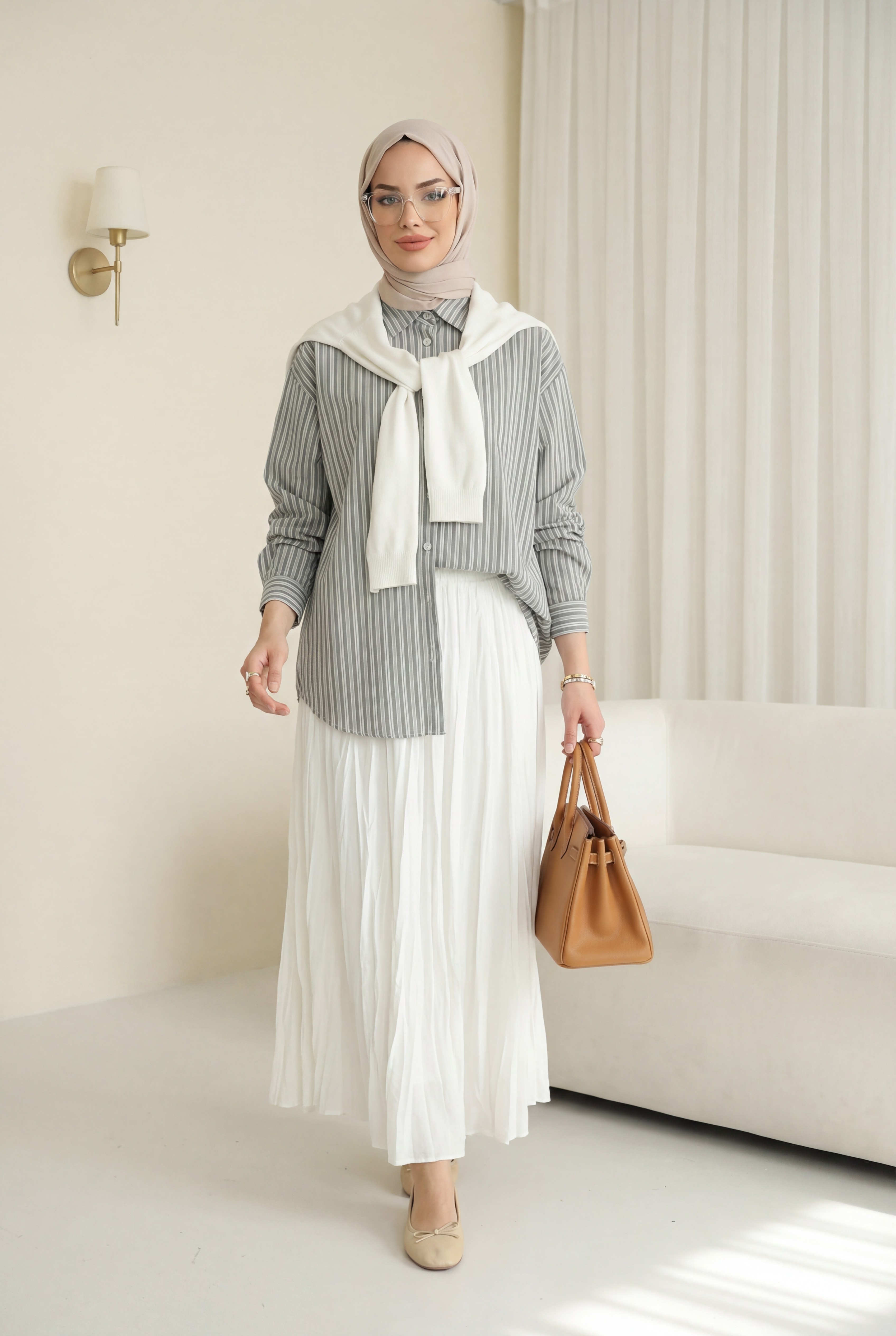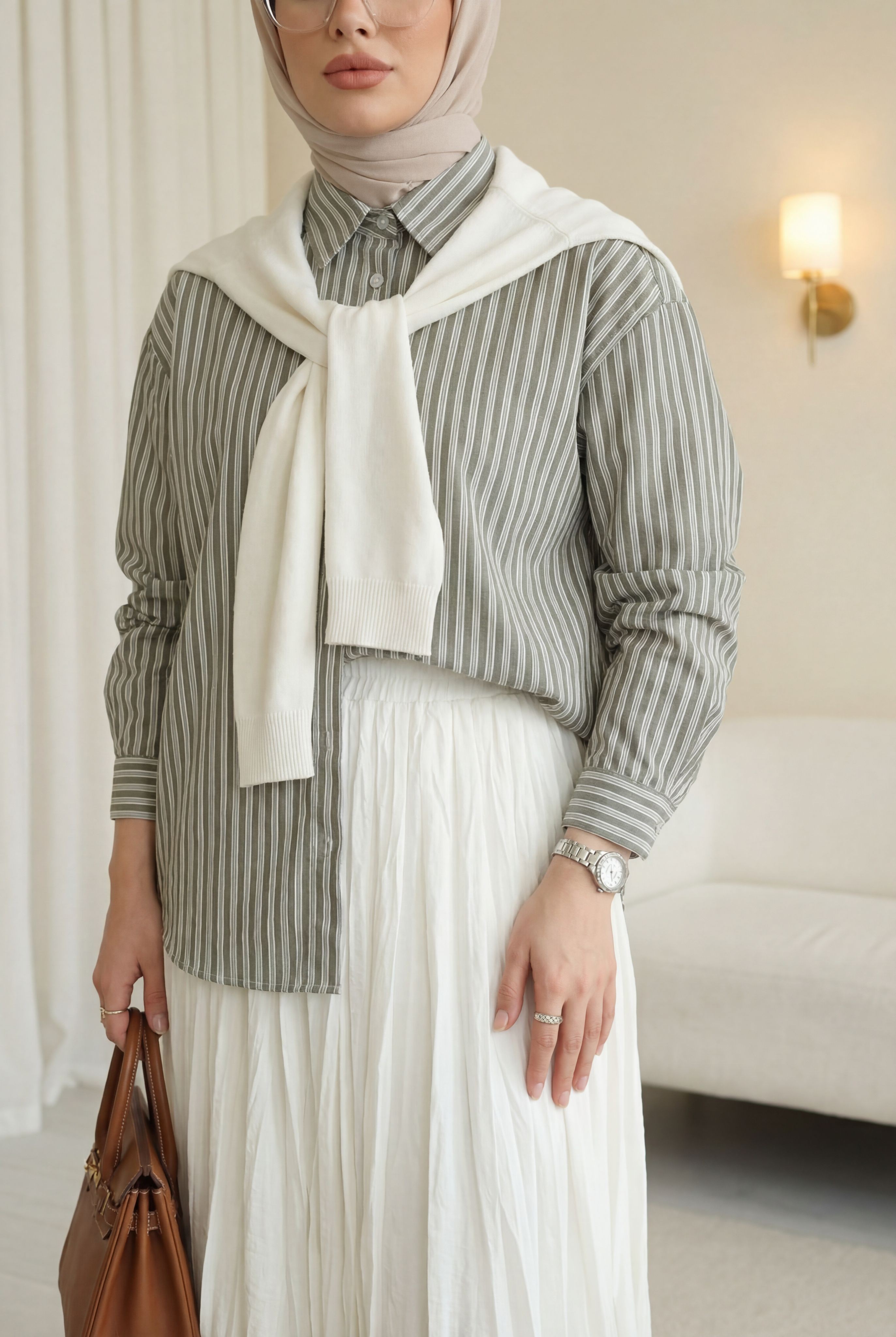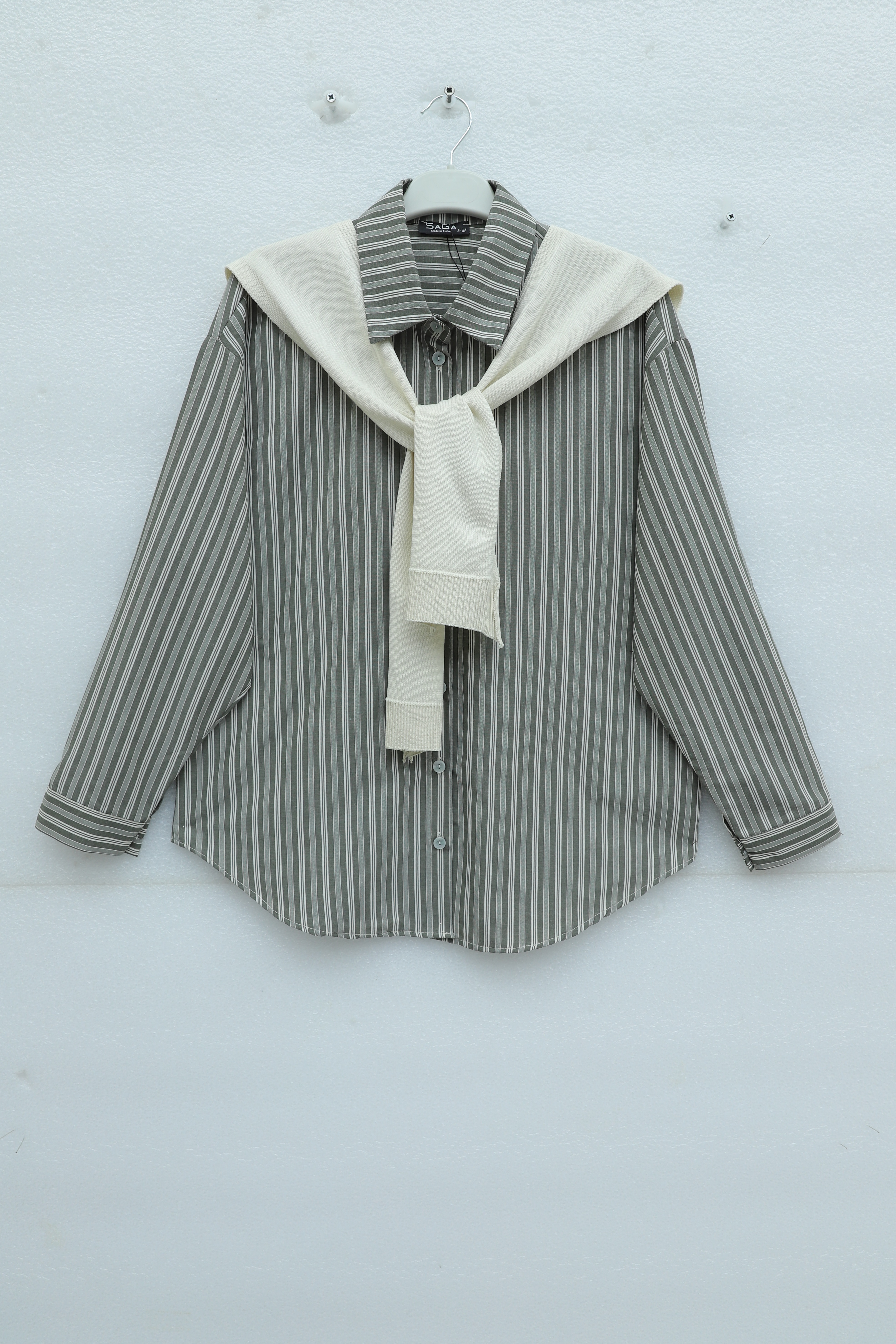 قميص كتان مخطط بتفاصيل وشاح محبوك -خاكي
