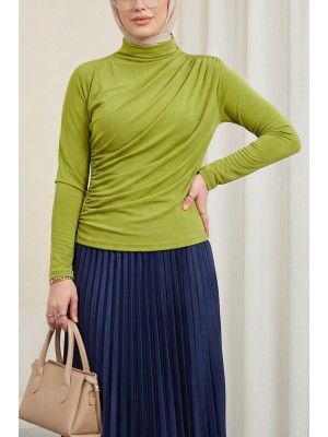 بلوزة ساندي بطيات نصف ياقة -زيت أخضر