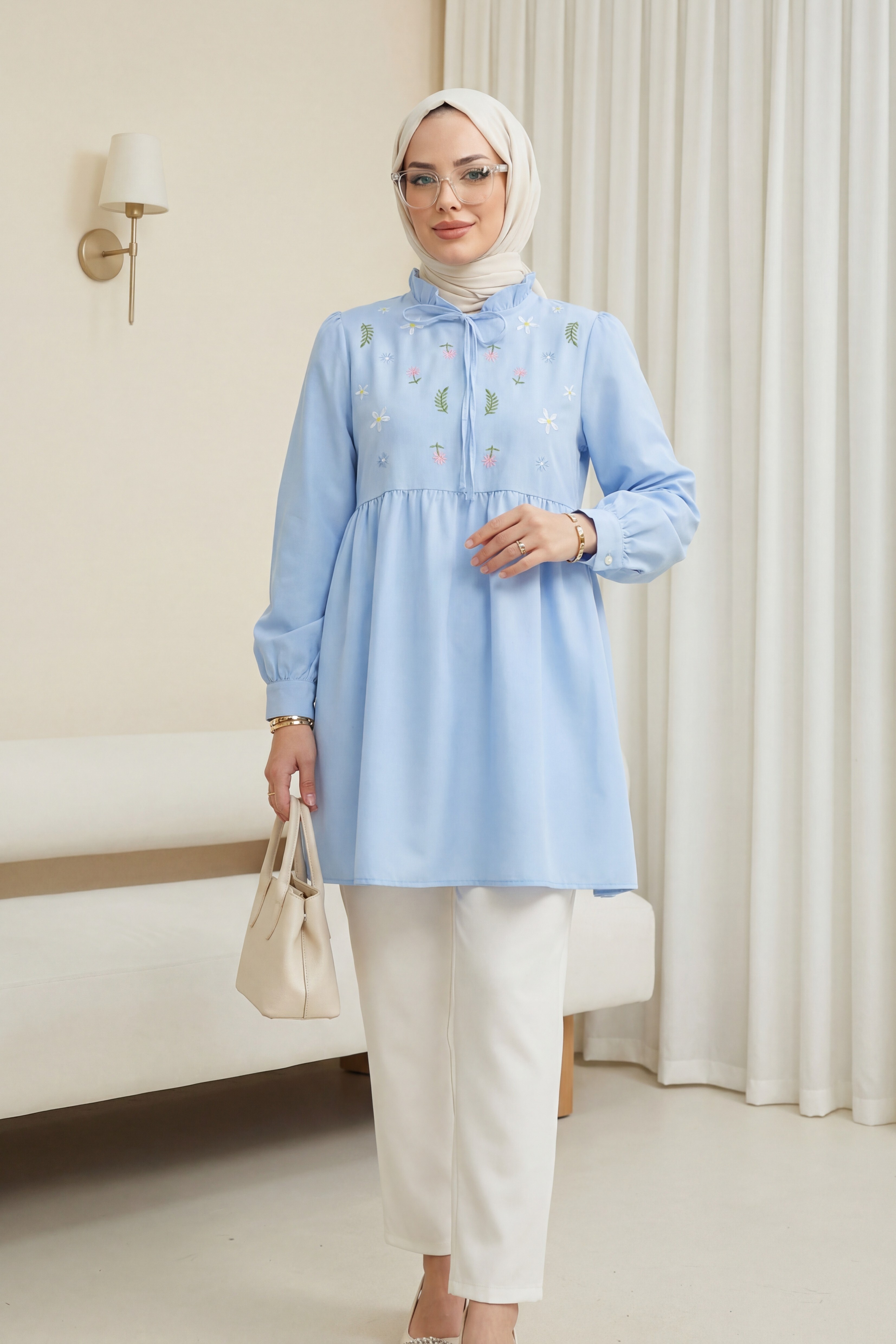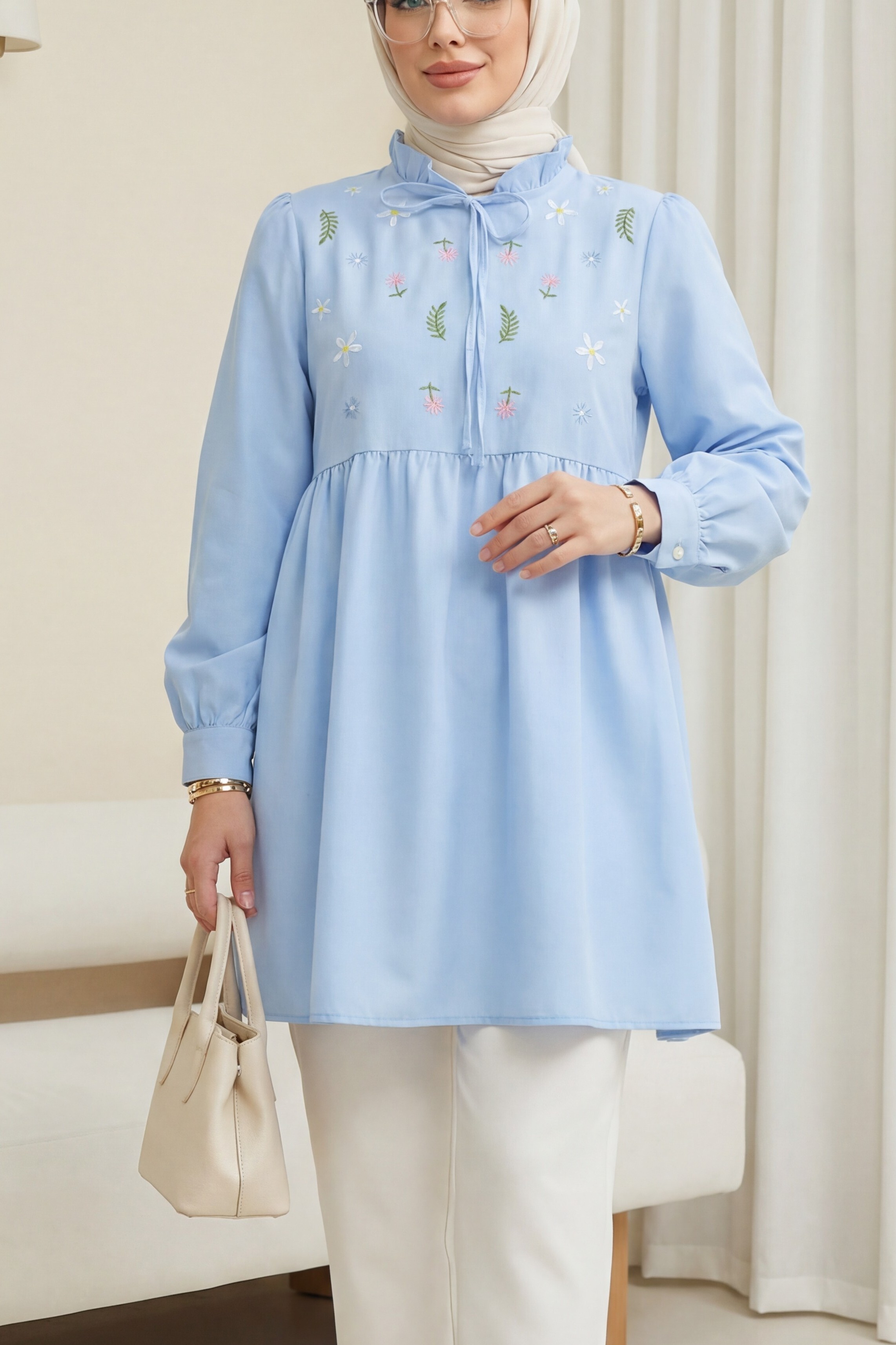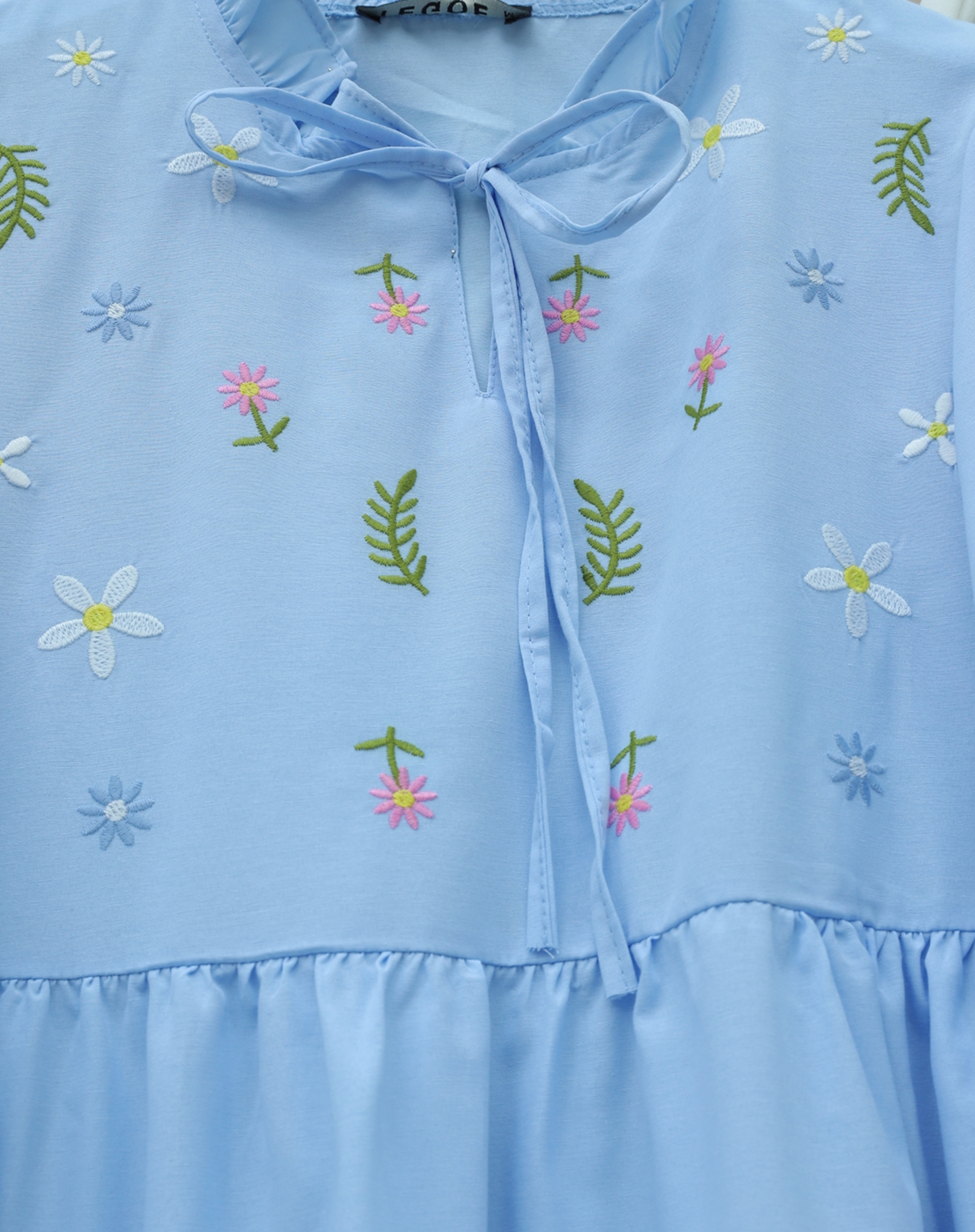 تونيك من قماش البوبلين مكشكش بياقة على شكل حرف V وربطة عنق، مزين بتطريزات زهرية -ريشي