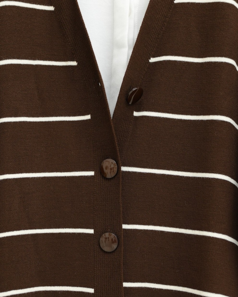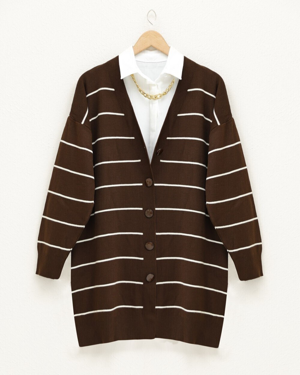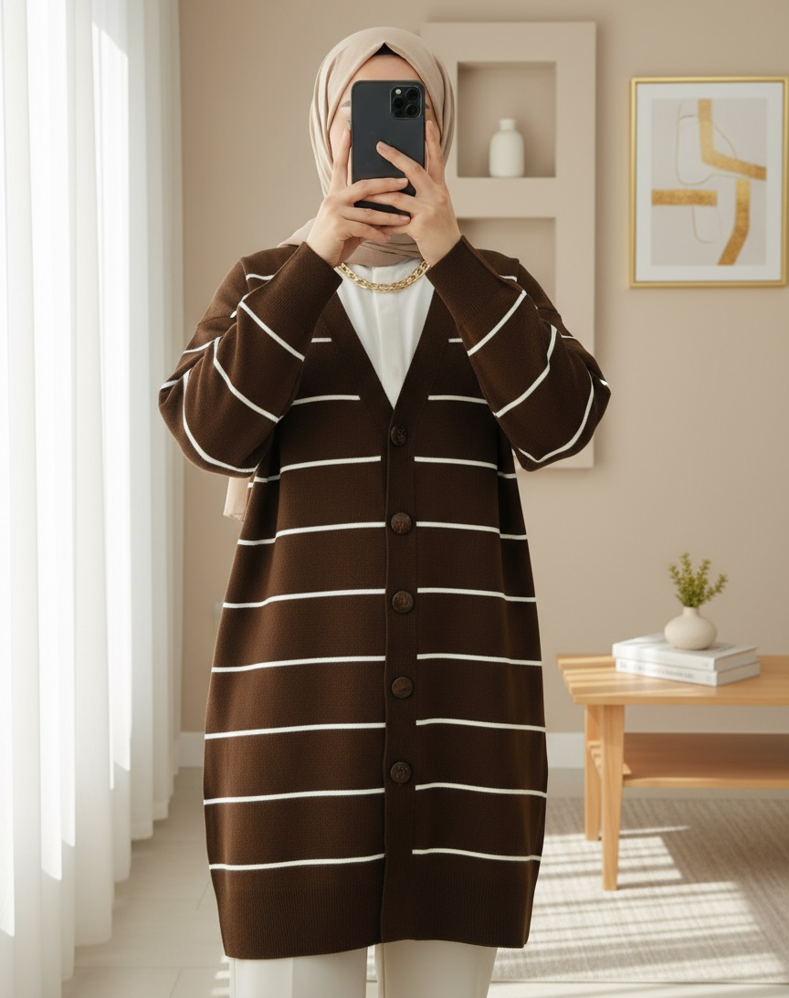 يعتبر موديل السترة المحبوكة المخططة والمزودة بأزرار أمامية من بين الموديلات الأكثر شعبية للموسم الجديد.