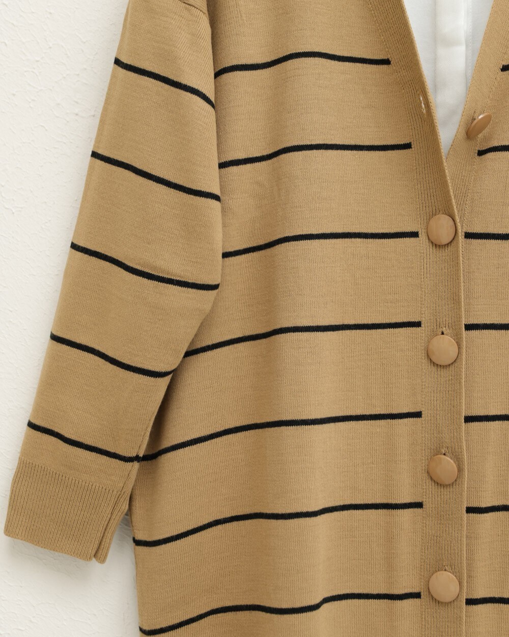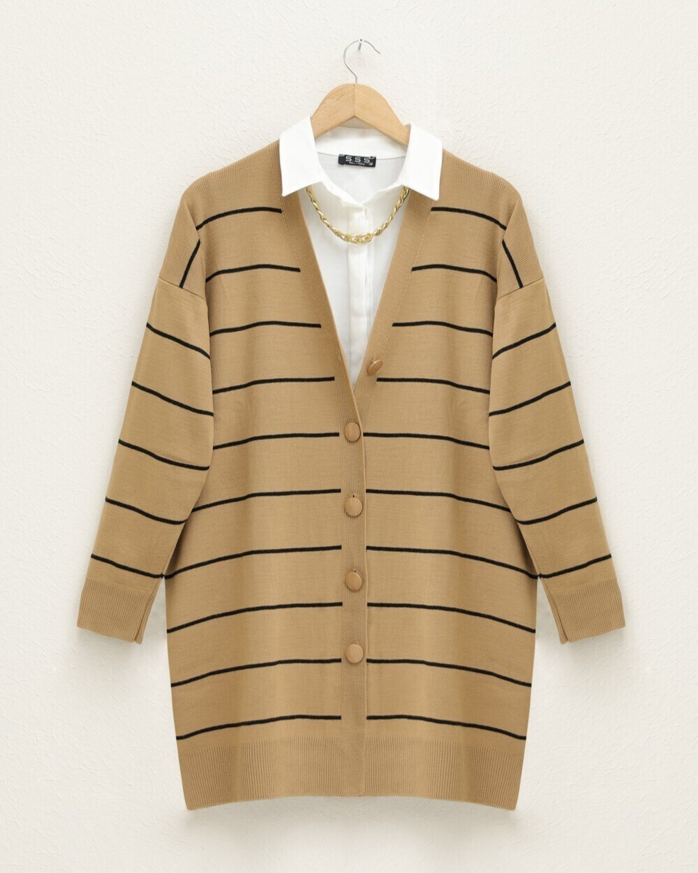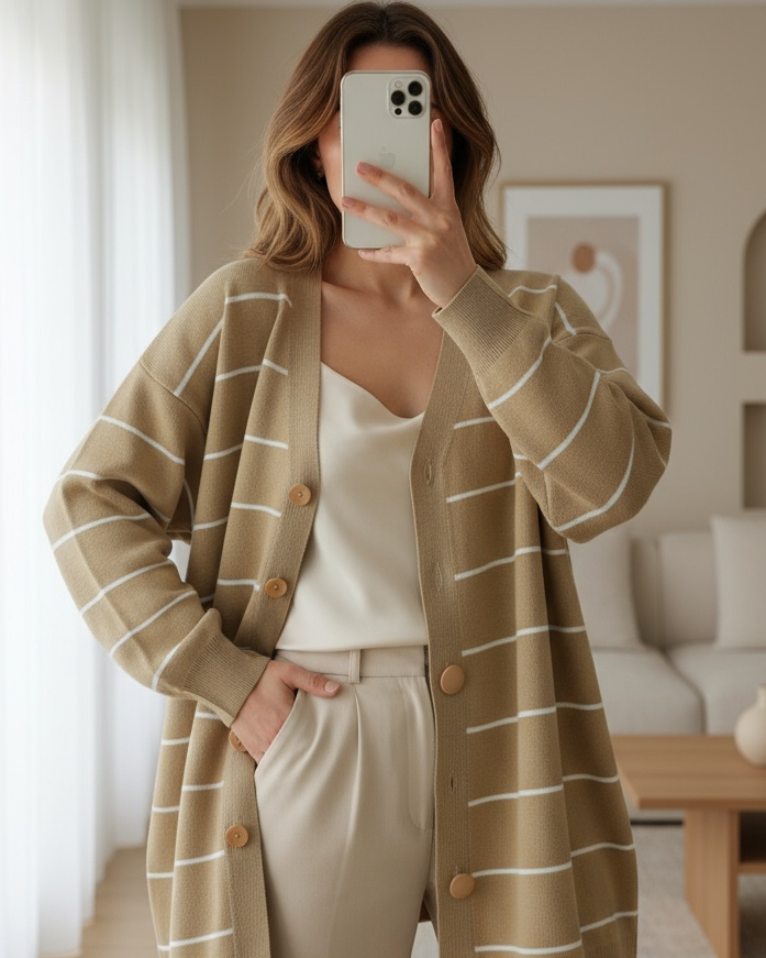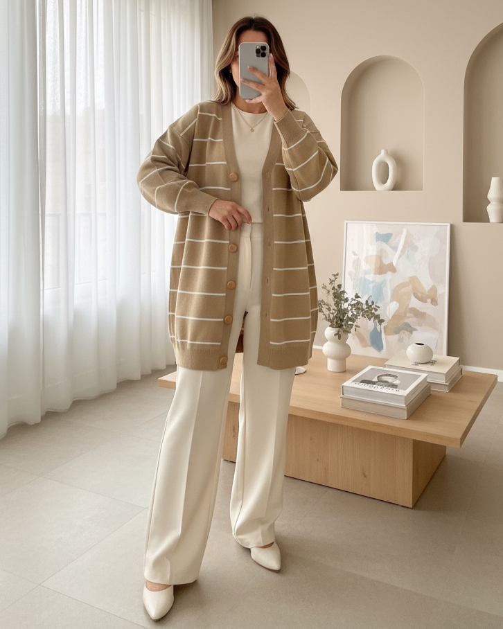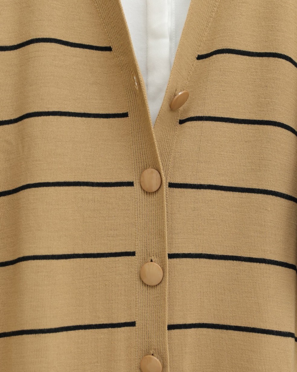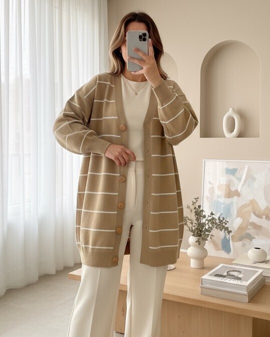 يعتبر موديل السترة المحبوكة المخططة والمزودة بأزرار أمامية من بين الموديلات الأكثر شعبية للموسم الجديد.