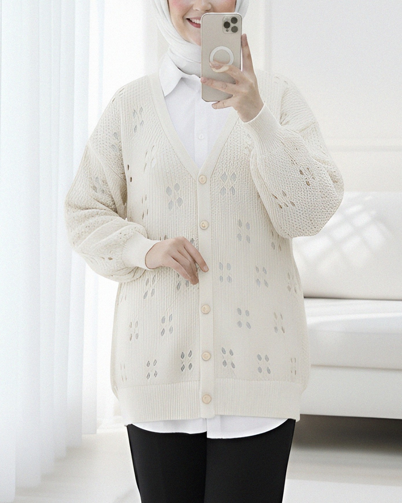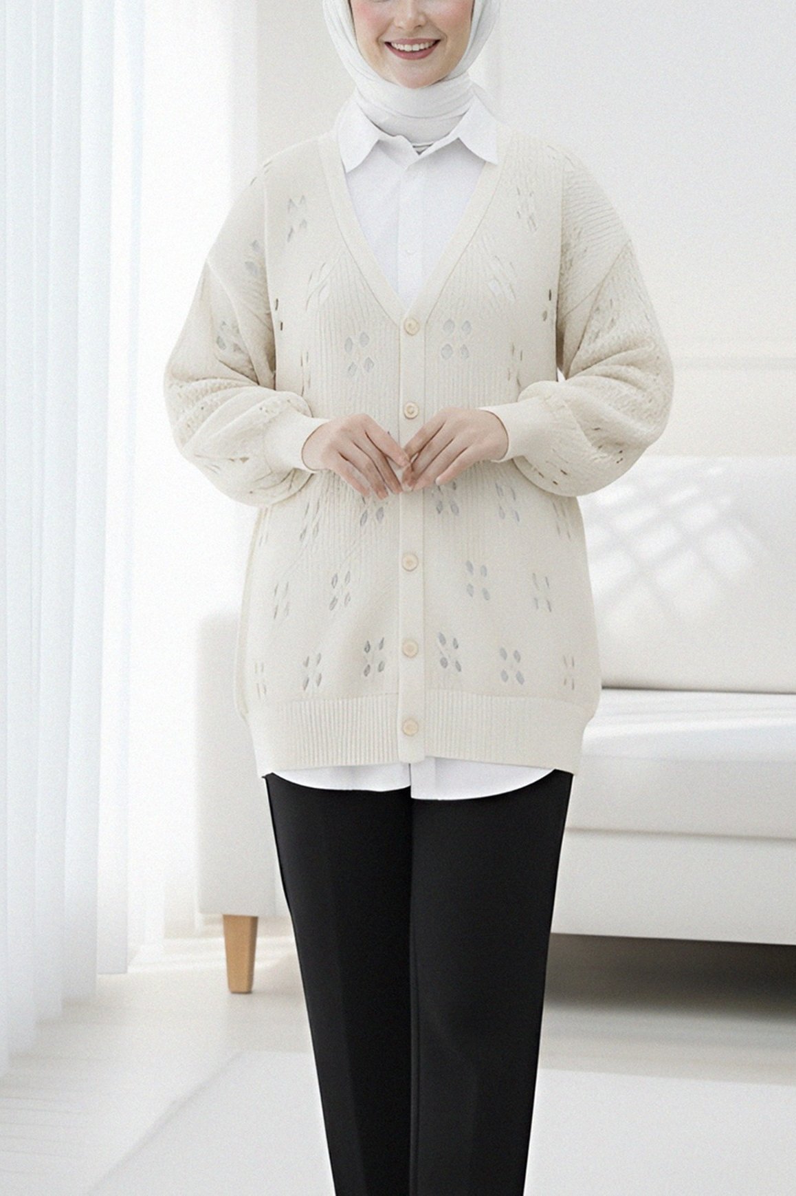 كارديجان عربي بوي محبوك بأزرار مخرمة -لون كريمي