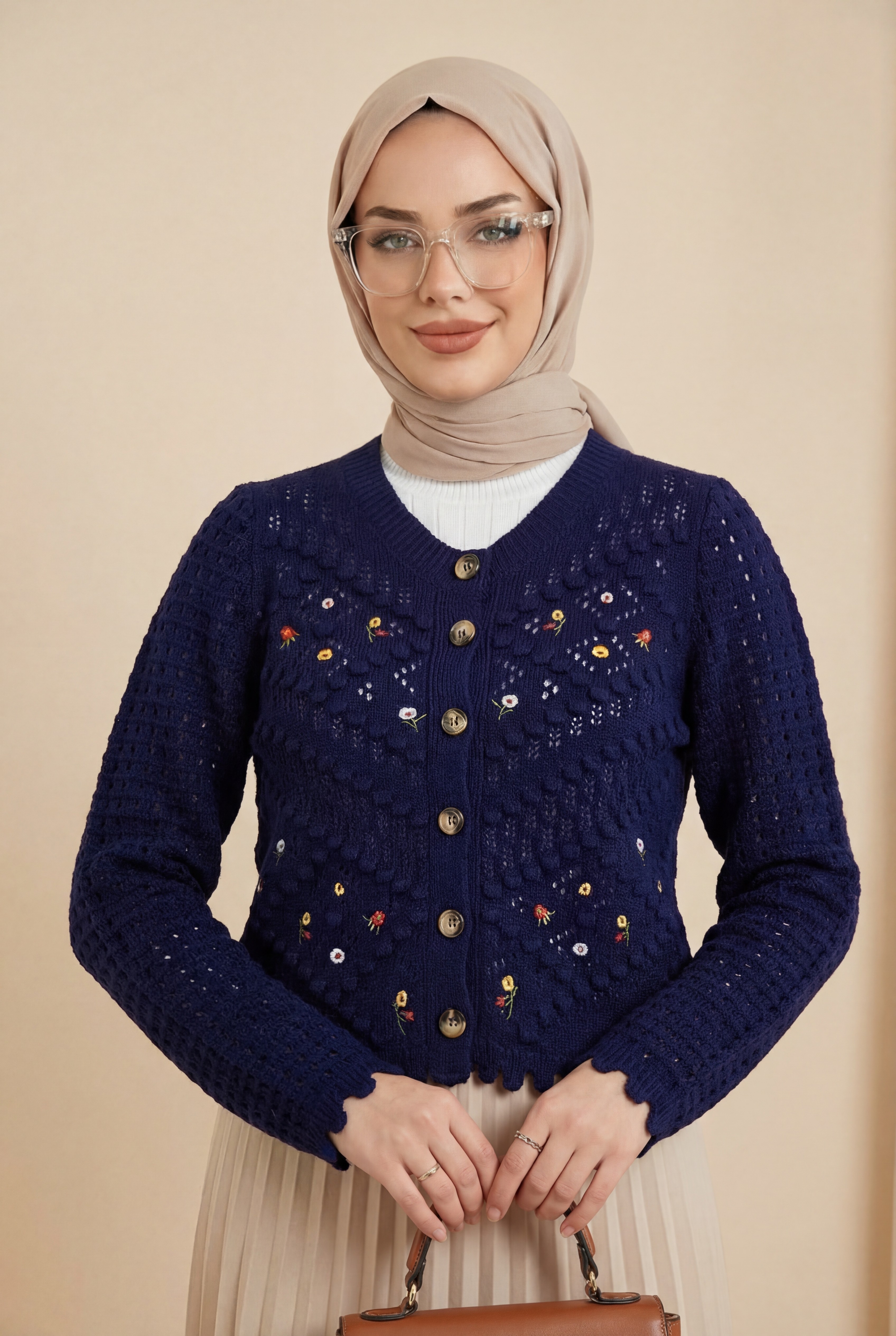 سترة محبوكة مطرزة بالزهور Pompom مخرمة -كحلي
