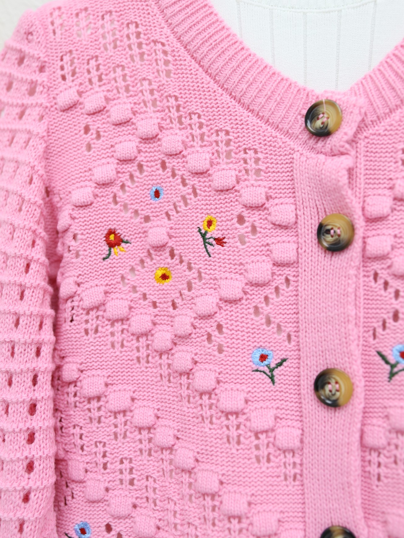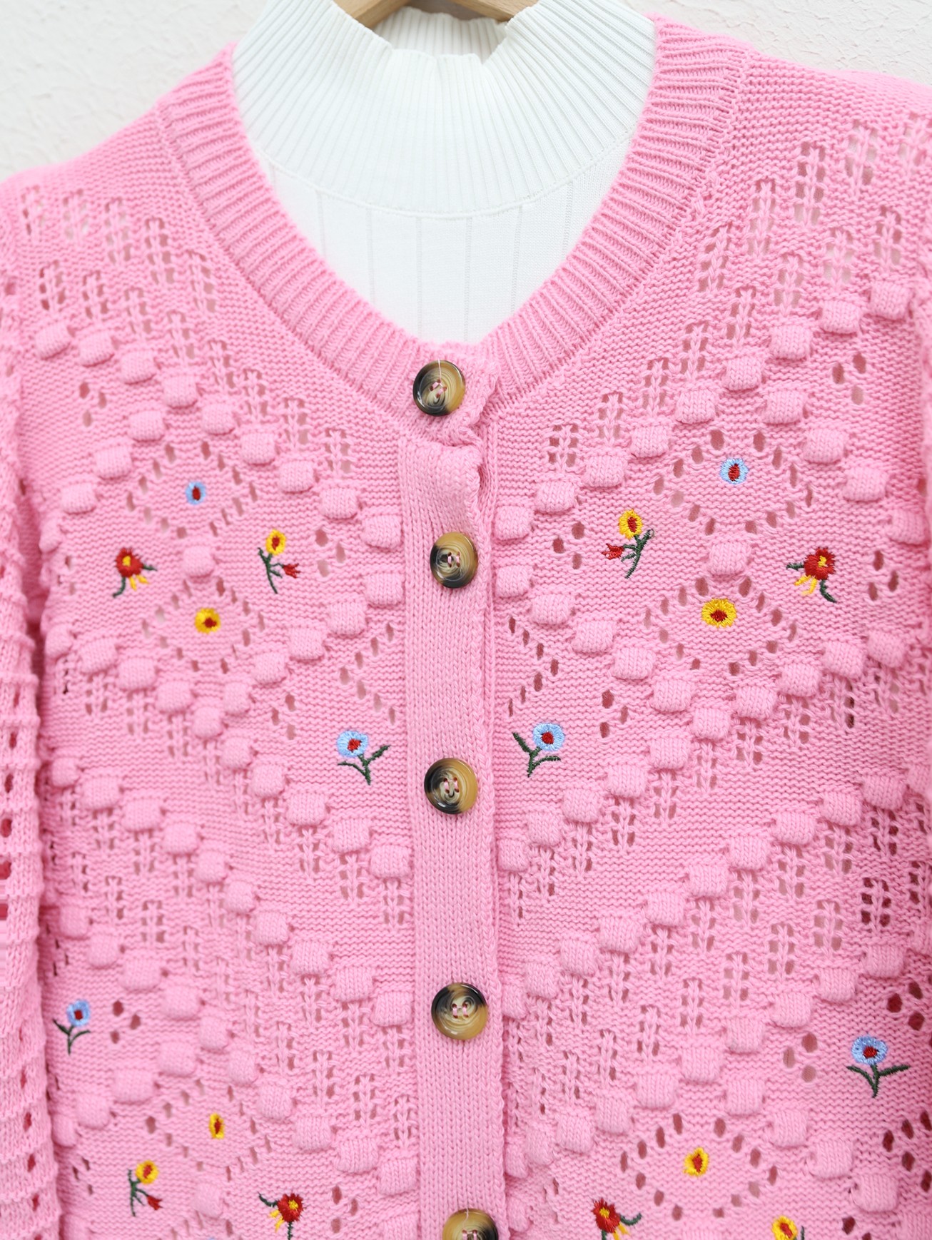 سترة محبوكة مطرزة بالزهور Pompom مخرمة -وردي