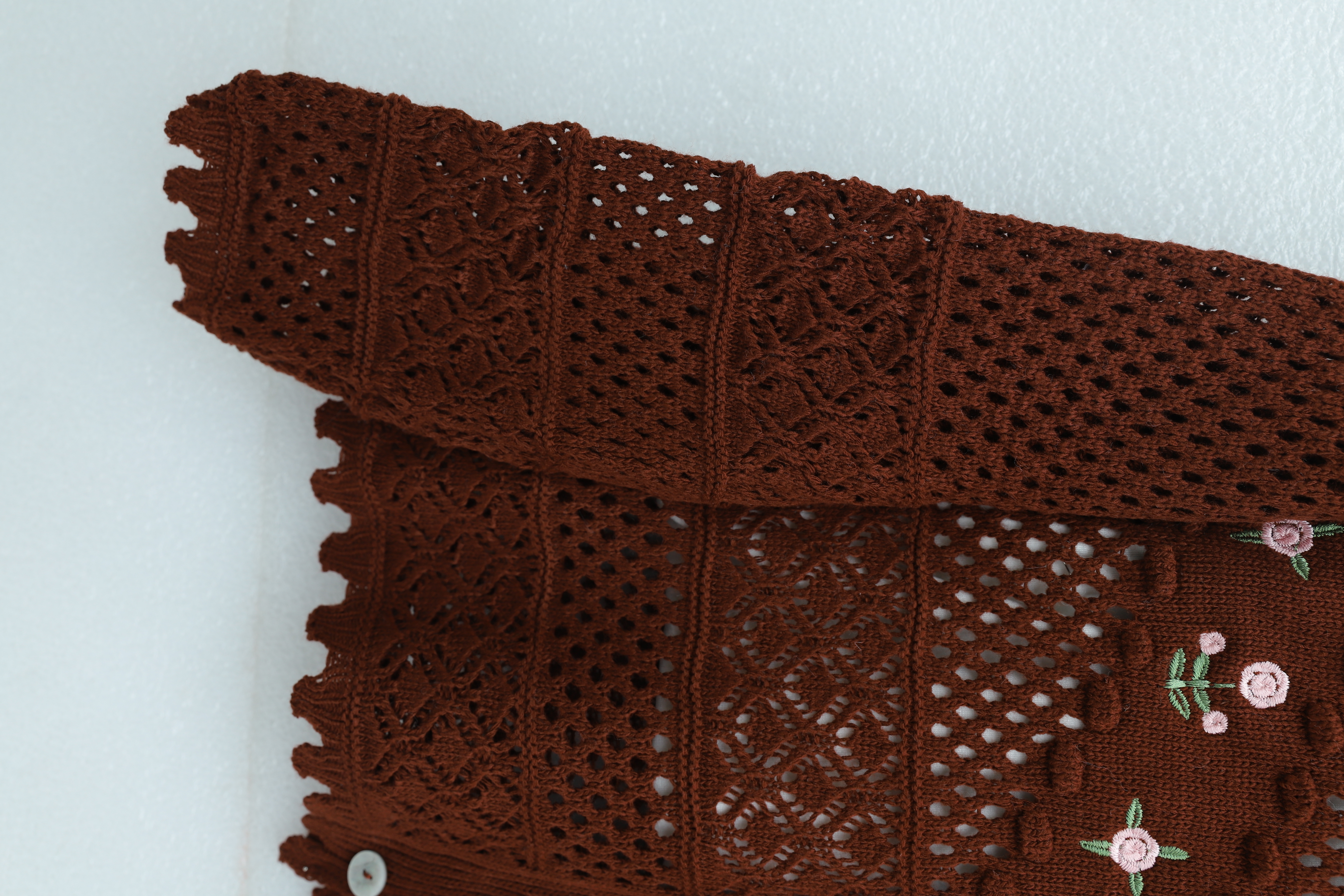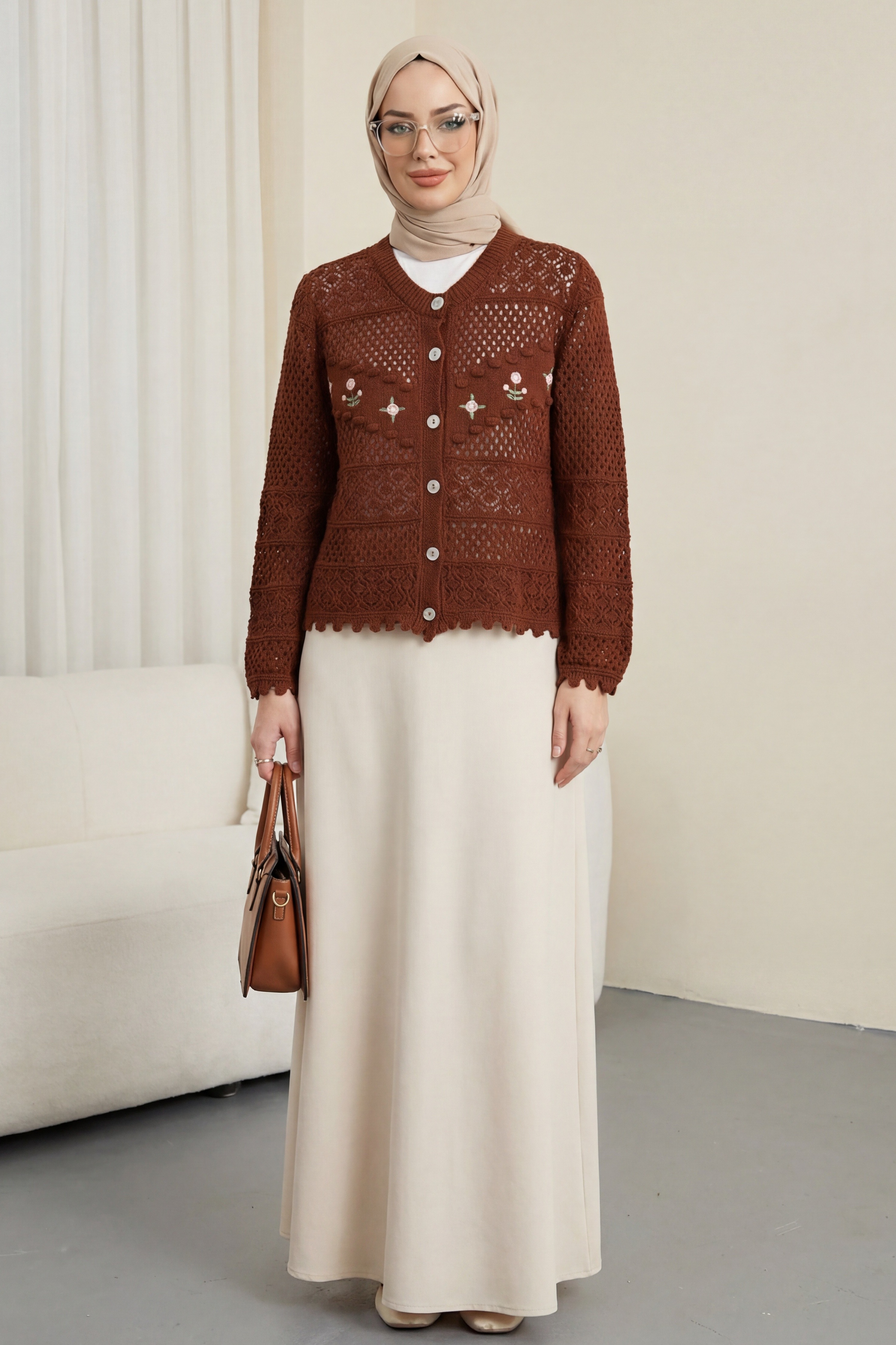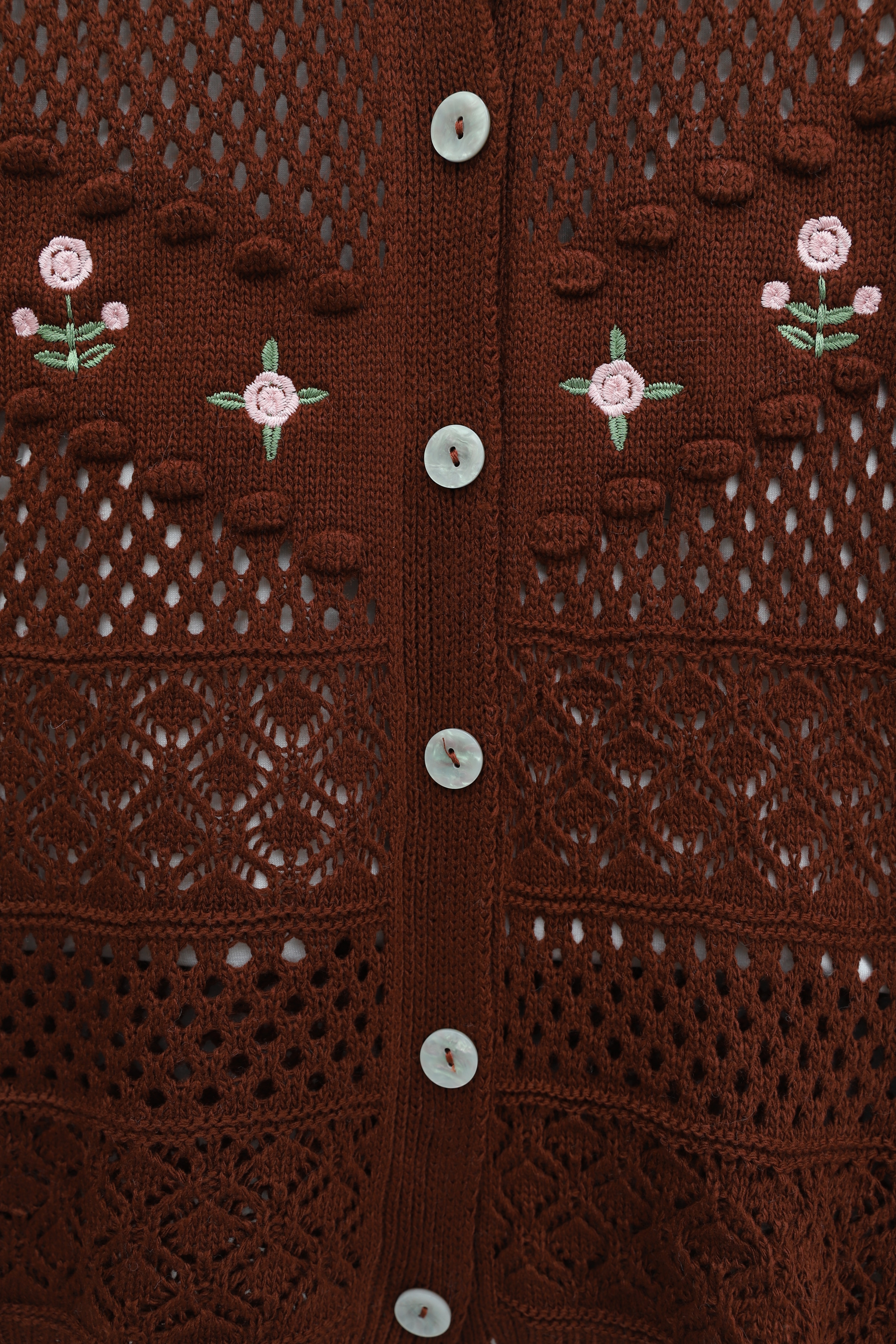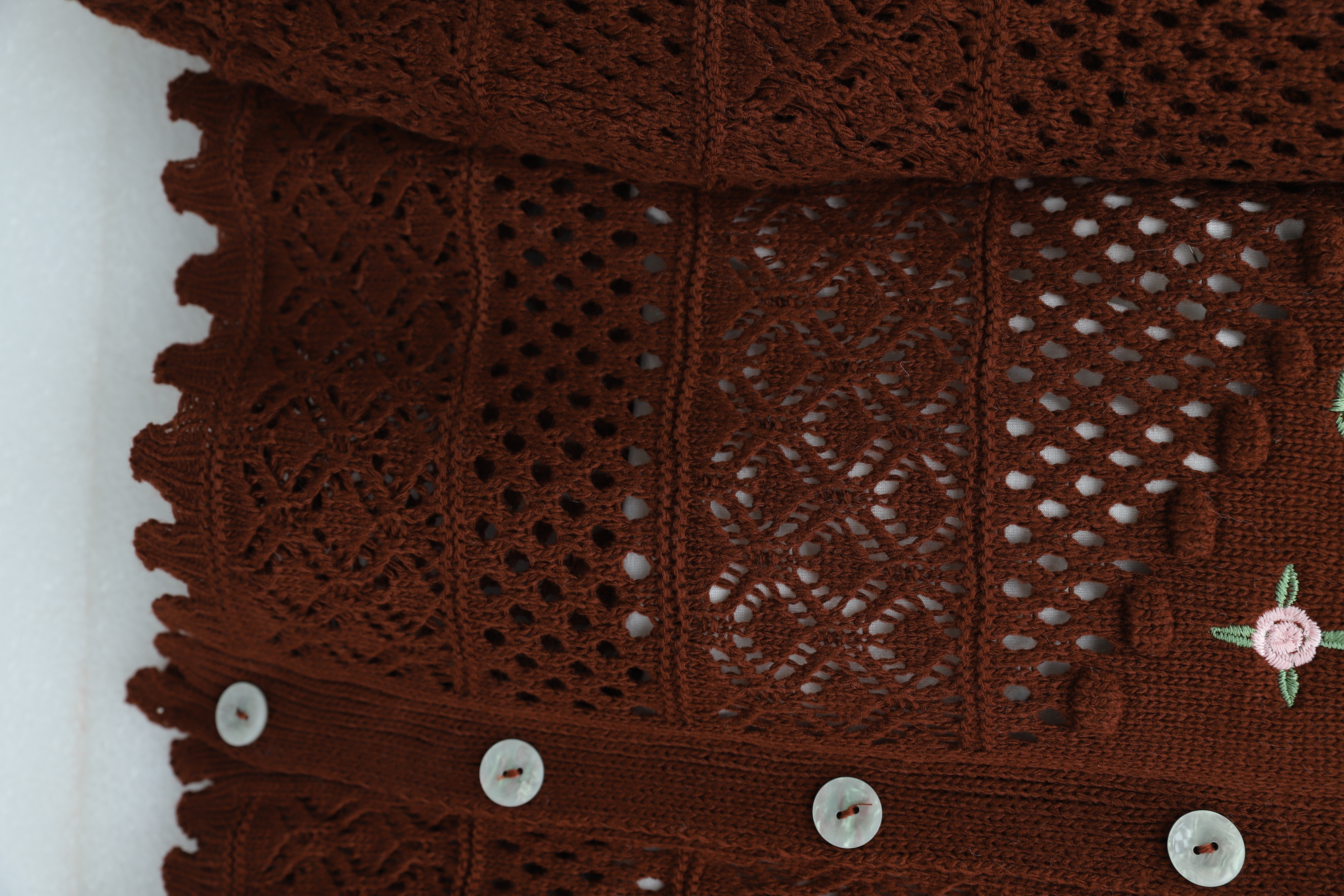كارديجان محبوك بتطريزات زهرية، مزين بكرات صغيرة وإغلاق بأزرار. -لون القرميد