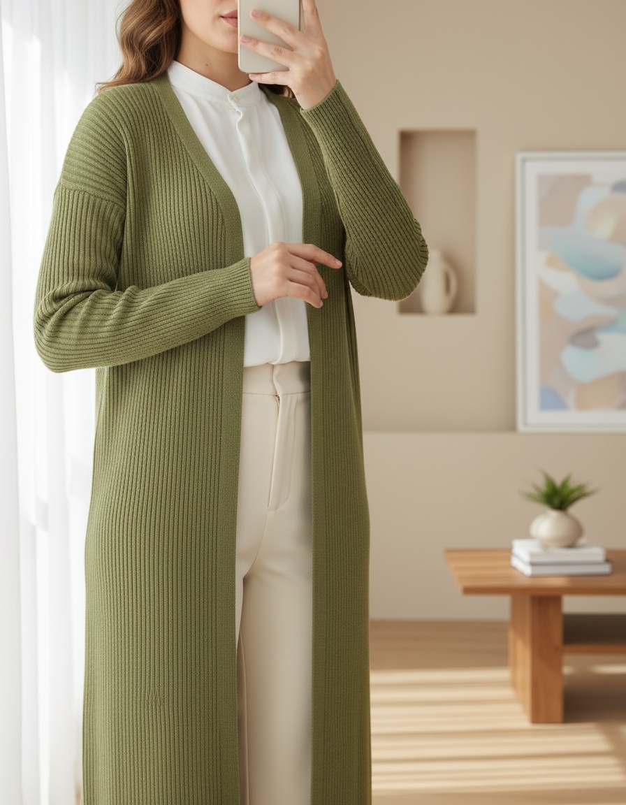 كارديجان طويل محبوك بفتحات جانبية -خاكي