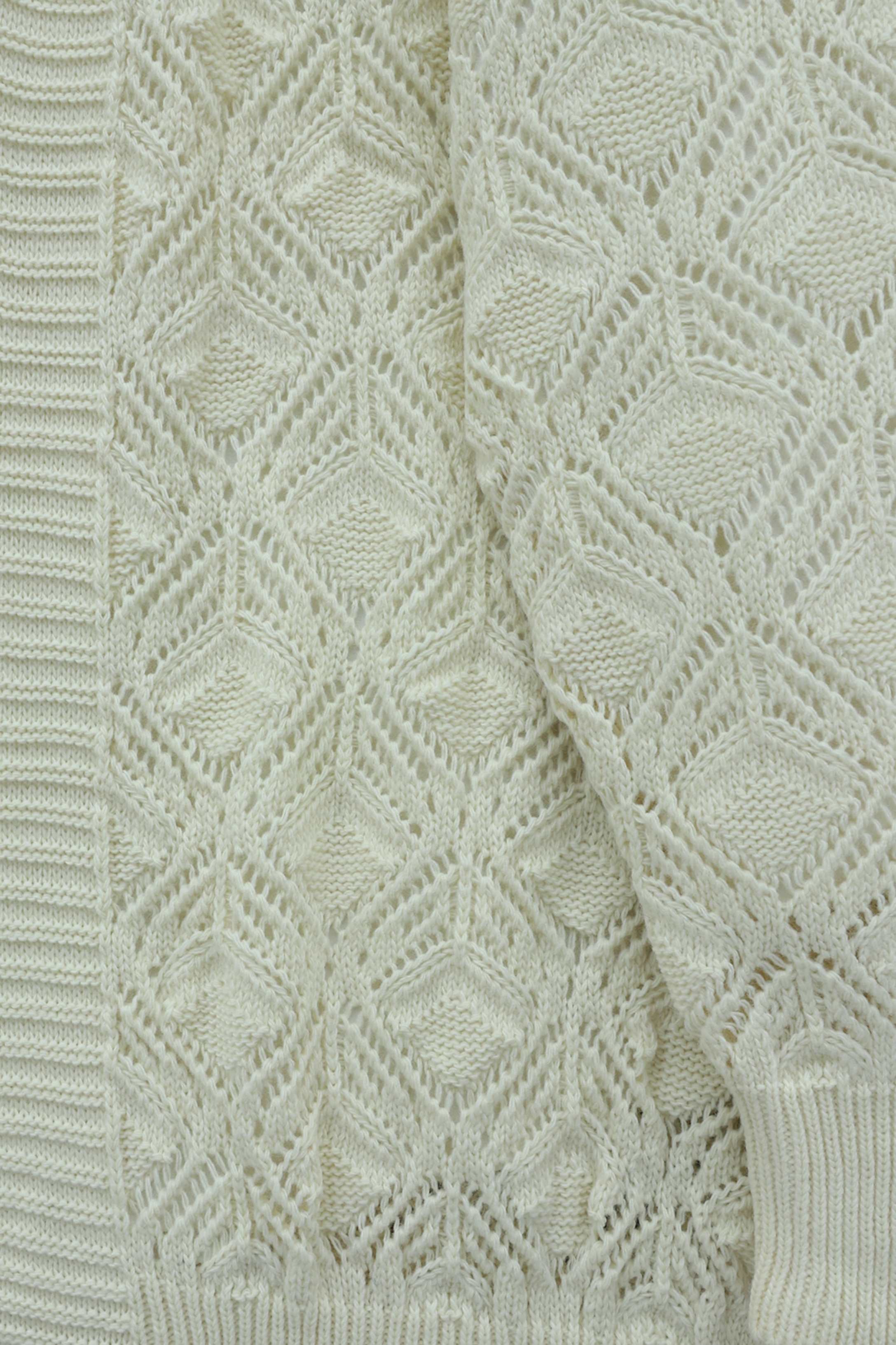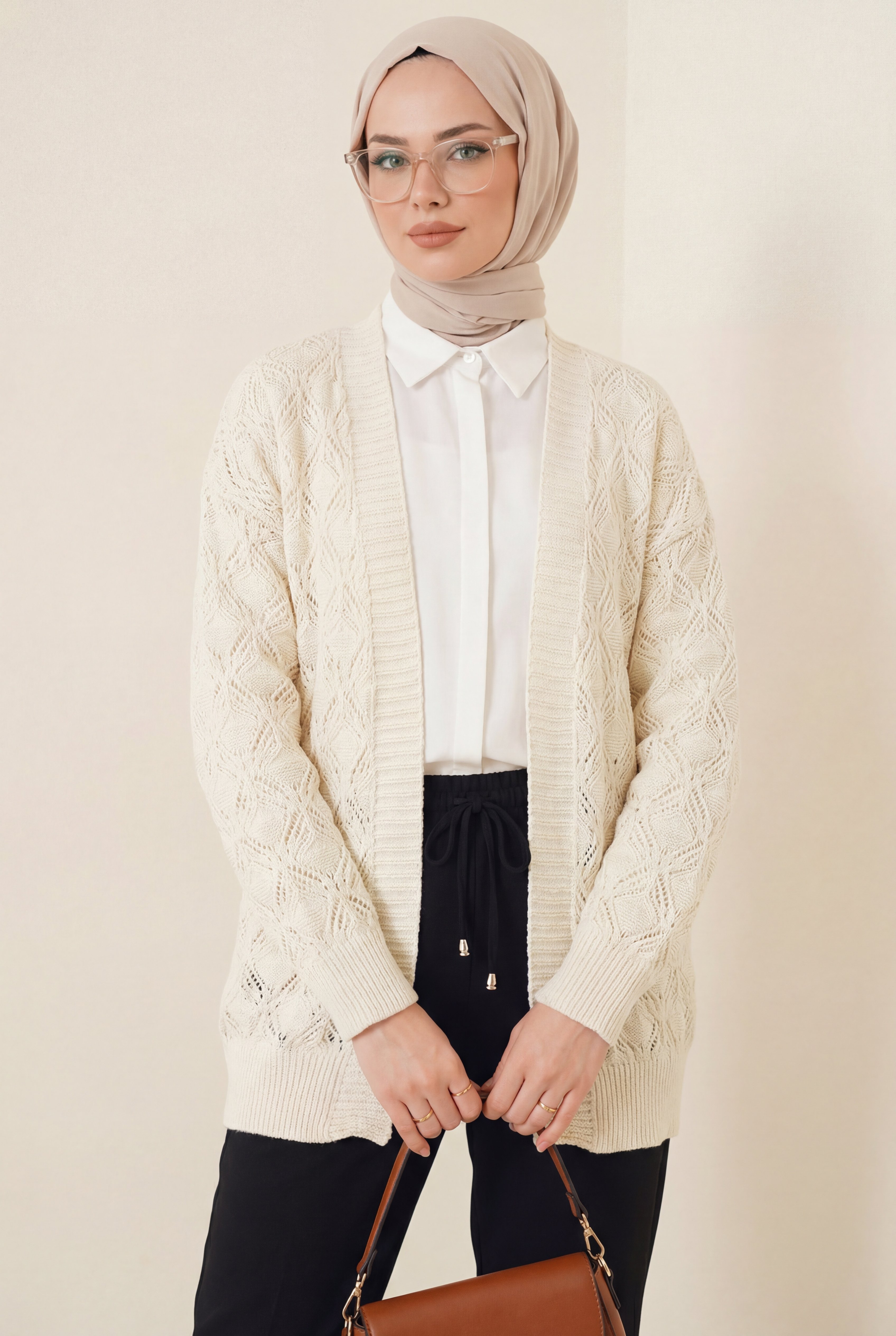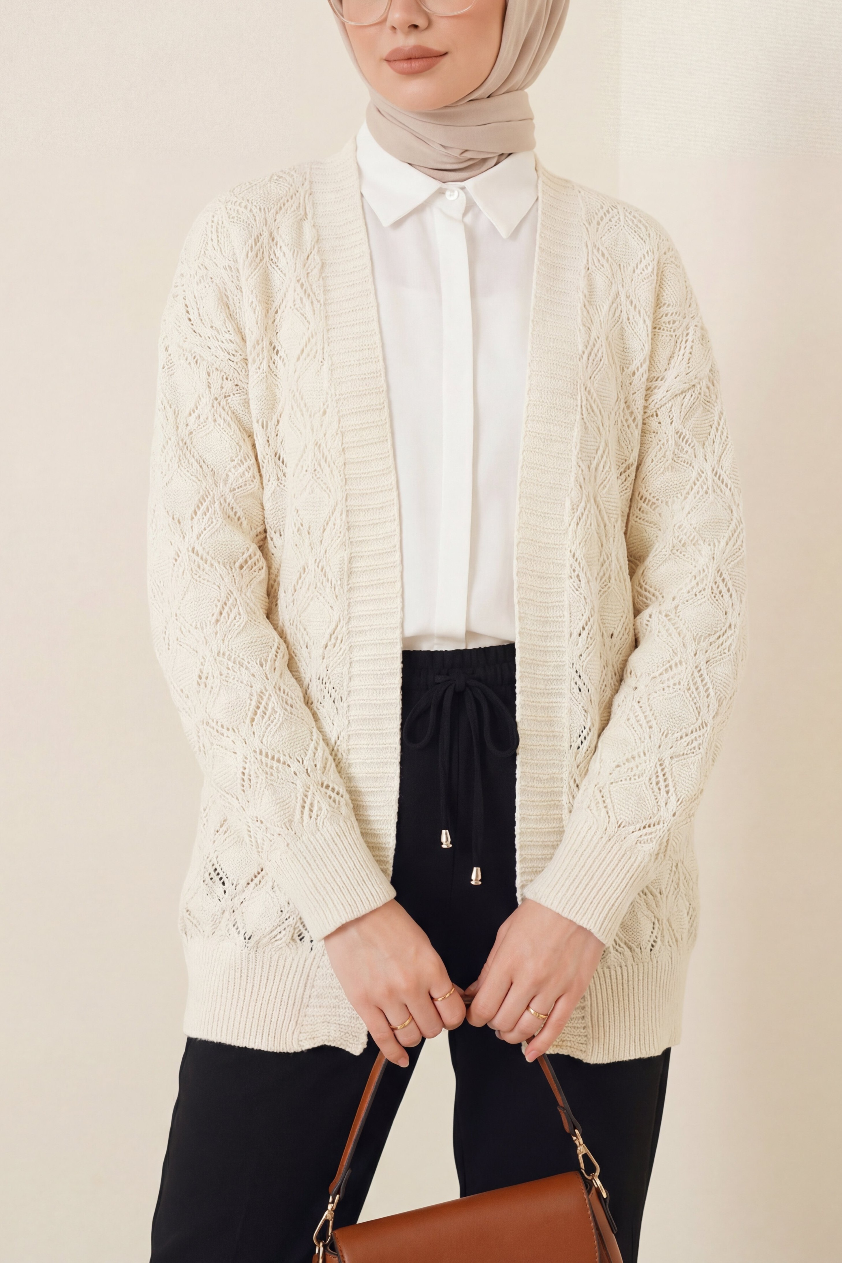 كارديجان محبوك متوسط الطول بنقوش -لون كريمي