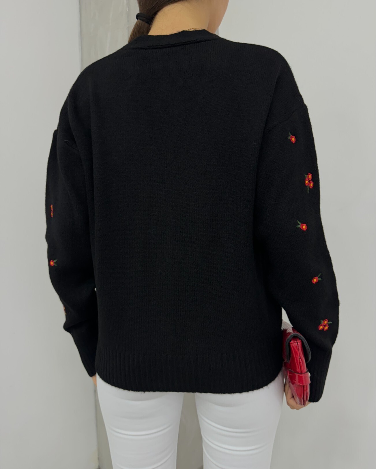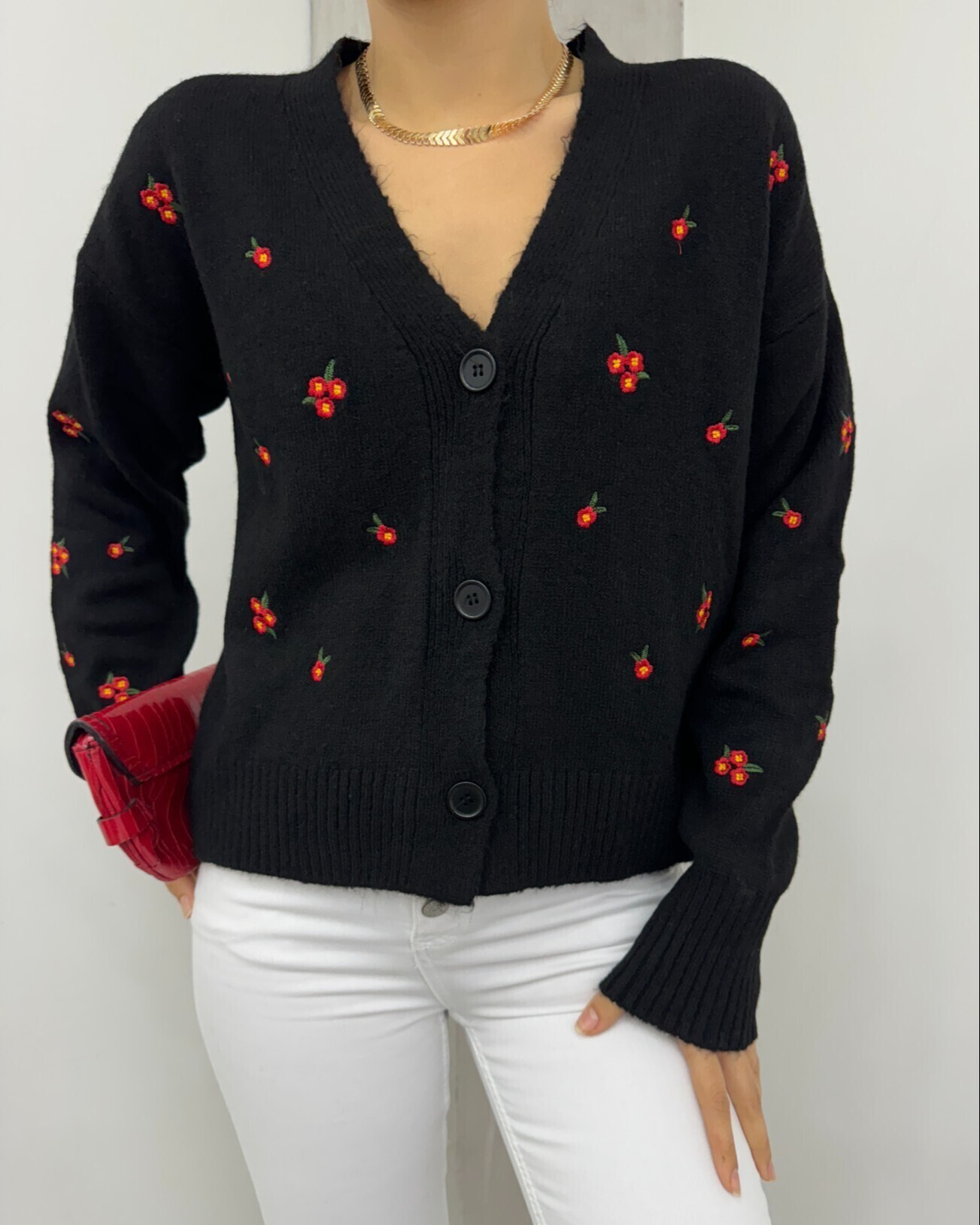 سترة تريكو مطرزة بالزهور المتناثرة -أسود