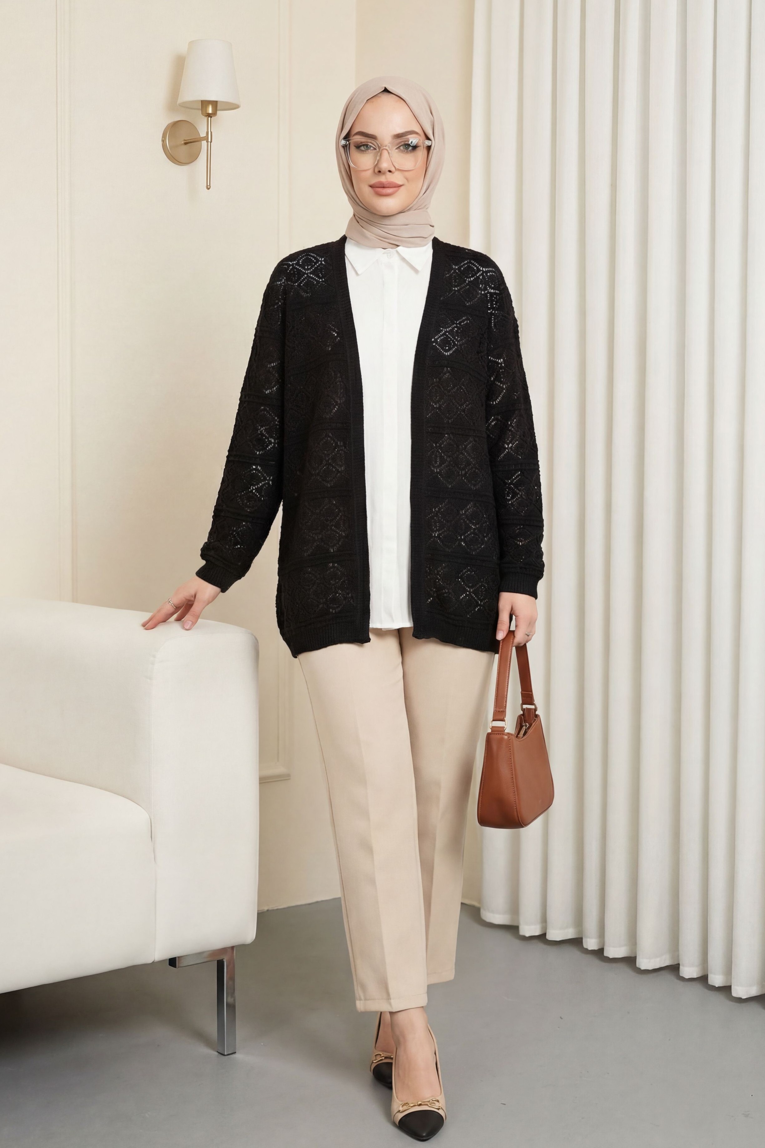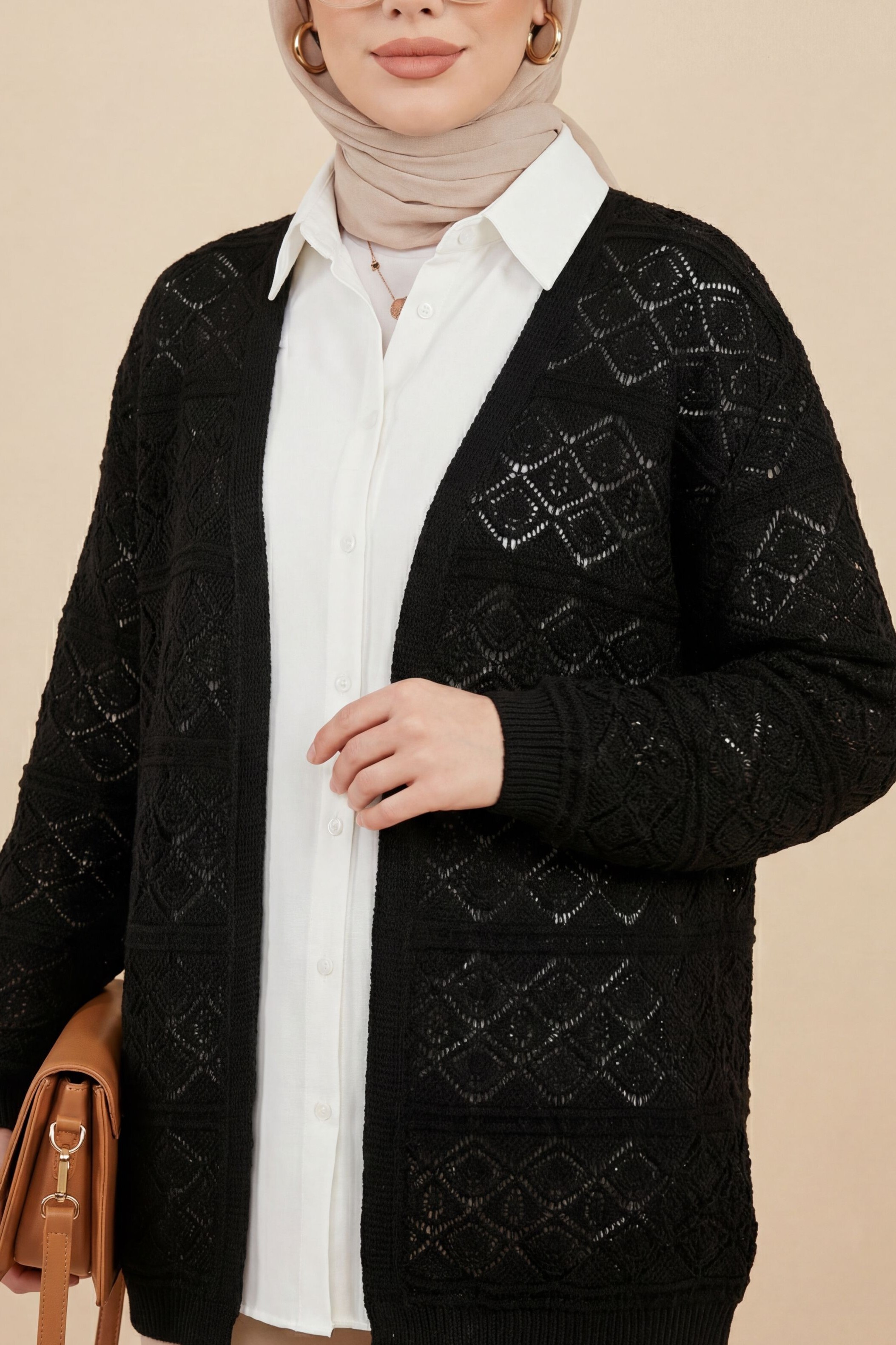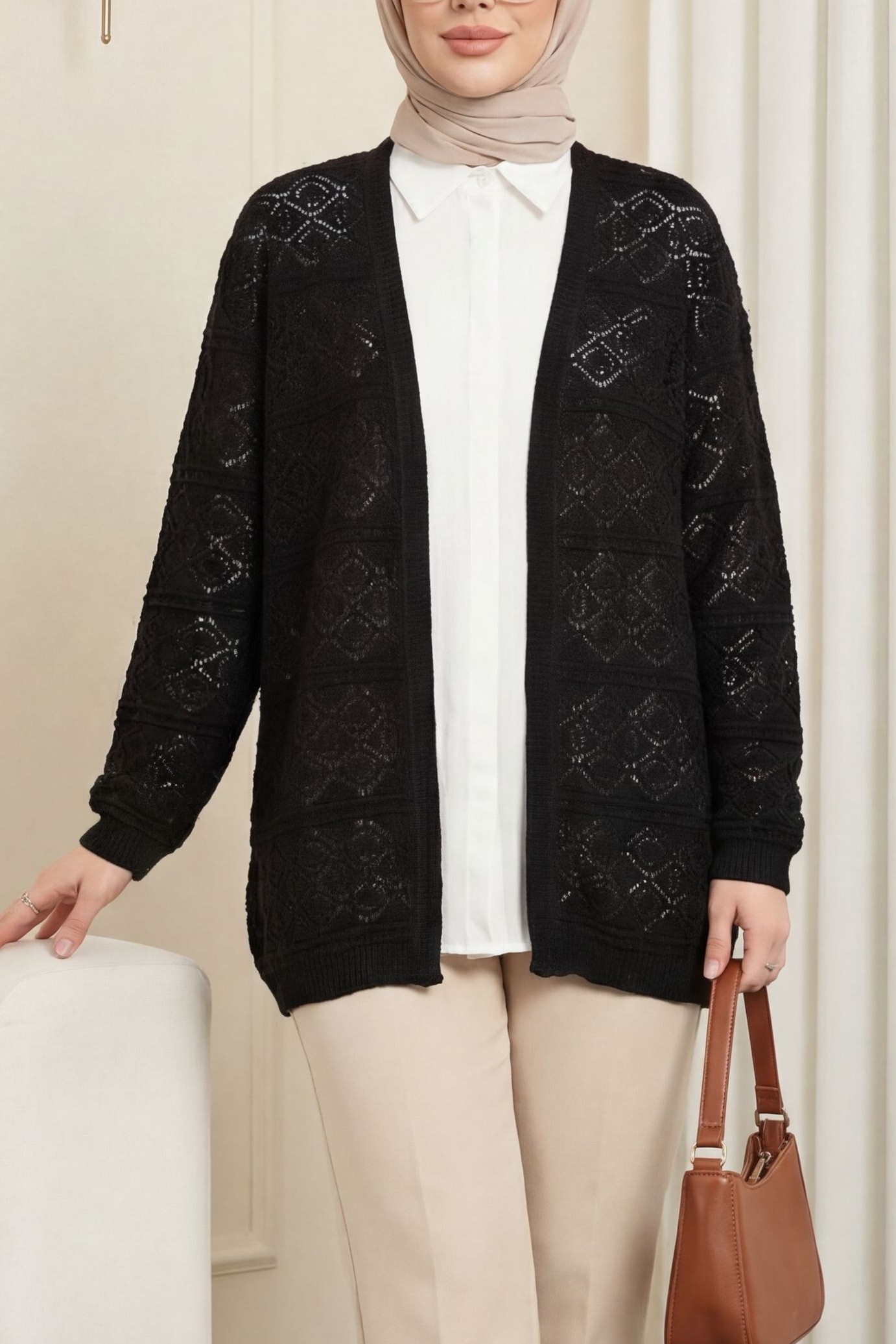 كارديجان فضفاض محبوك بنقوش مربعة مفتوحة -أسود