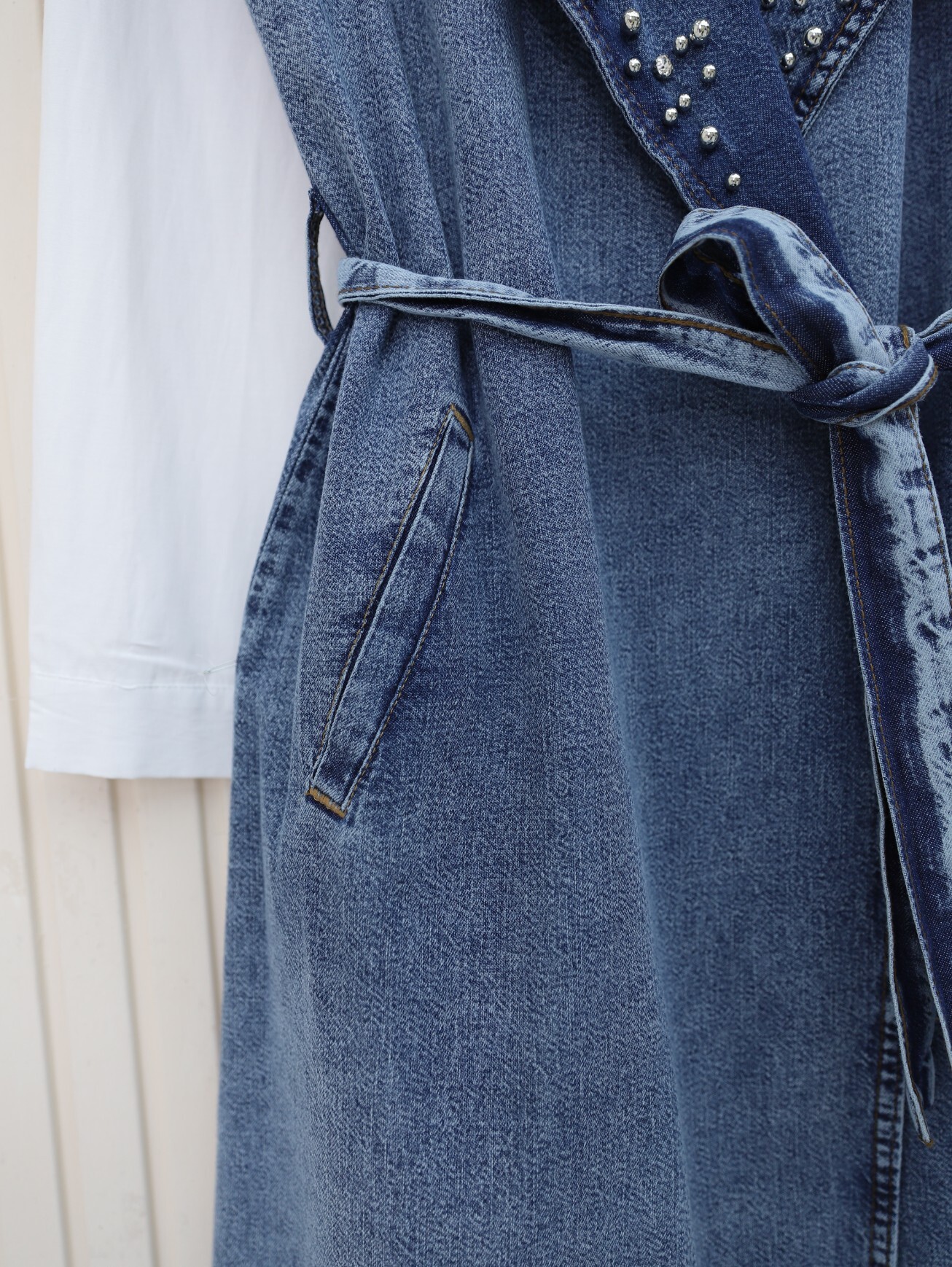سترة جينز بحزام مع تفاصيل حجرية على الجهة الأمامية -جليدي