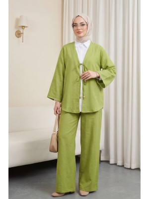 طقم كيمونو مع بنطال برباط أمامي مزدوج -زيت أخضر