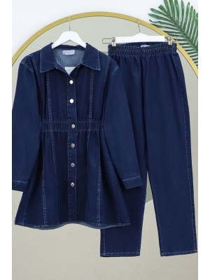 طقم جينز مكون من جاكيت وبنطلون وجاكيت بأزرار وخصر مطاطي -كحلي