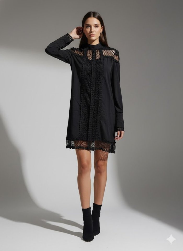 فستان قصير شفاف بأكمام طويلة وياقة مدورة نصفية للنساء