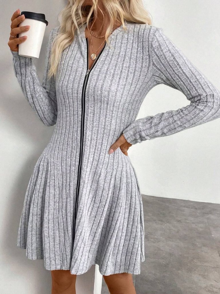 فستان قصير نسائي بأكمام طويلة وسحاب أمامي وكسرات ناعمة، رمز المنتج: 175568
