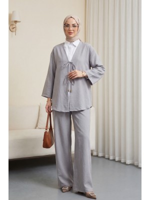 طقم كيمونو مع بنطال برباط أمامي مزدوج -اللون الرمادي