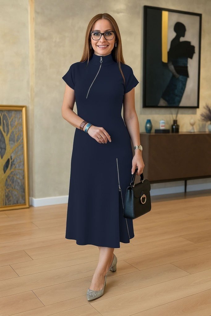 فستان نسائي متوسط الطول بأكمام قصيرة مصنوع من الفسكوز بخيطين، مزود بسحاب عند الرقبة والحافة. رمز المنتج: 187534