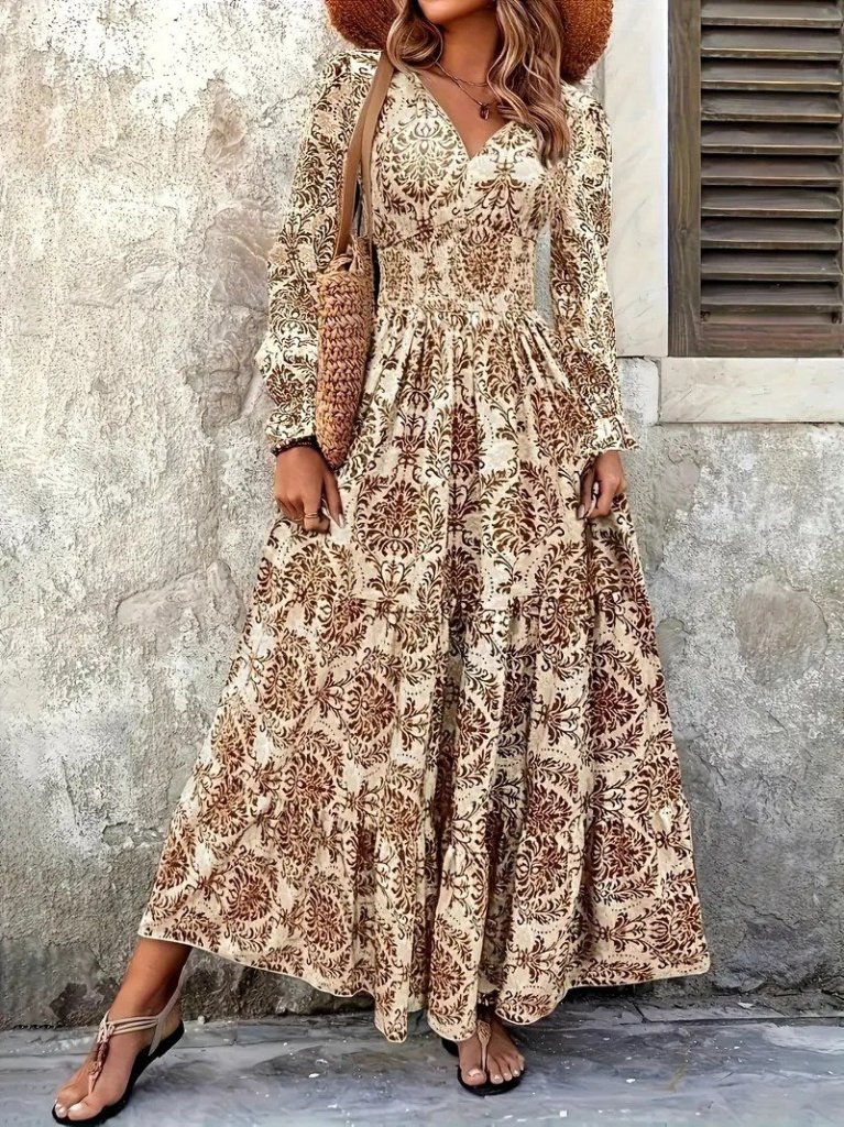 فستان جيرسي منقوش بأكمام طويلة ورقبة على شكل حرف V للنساء